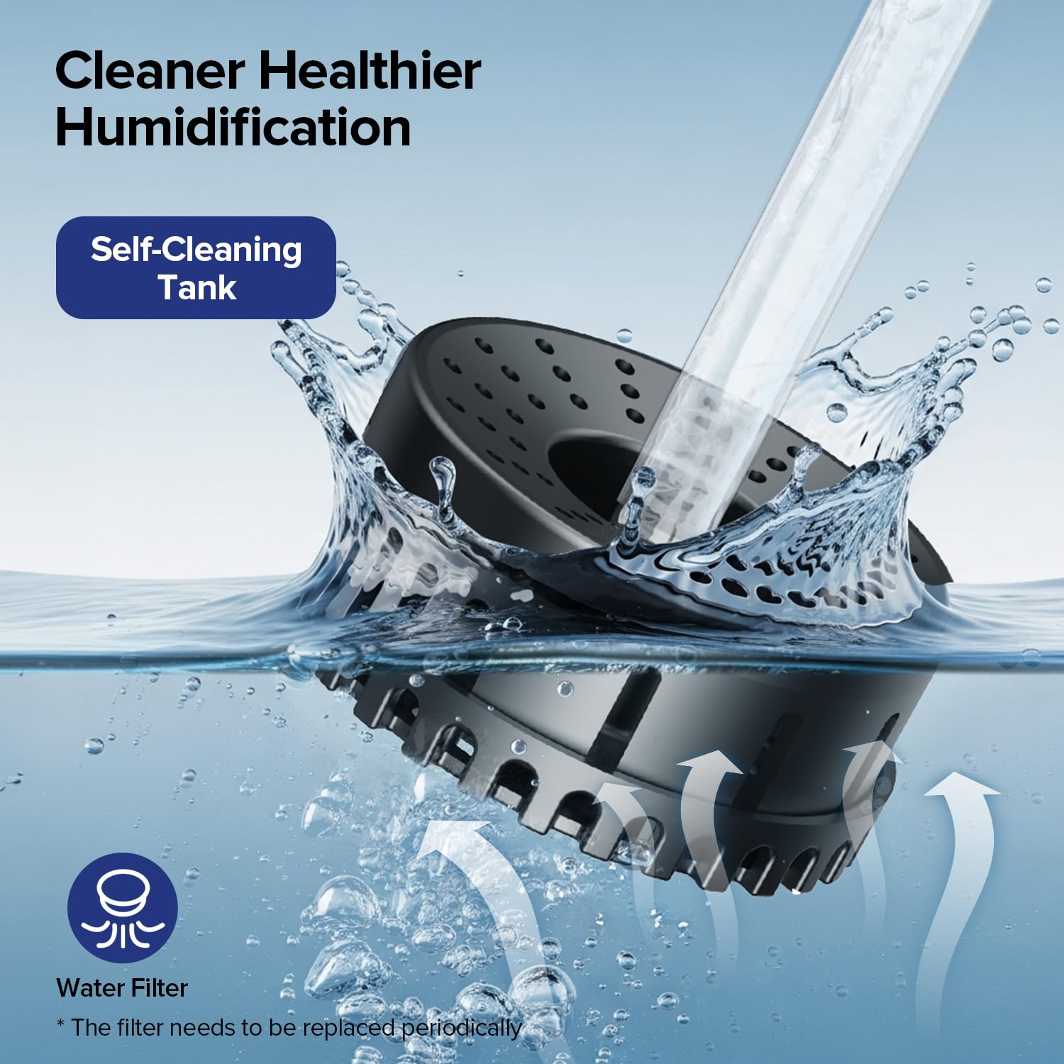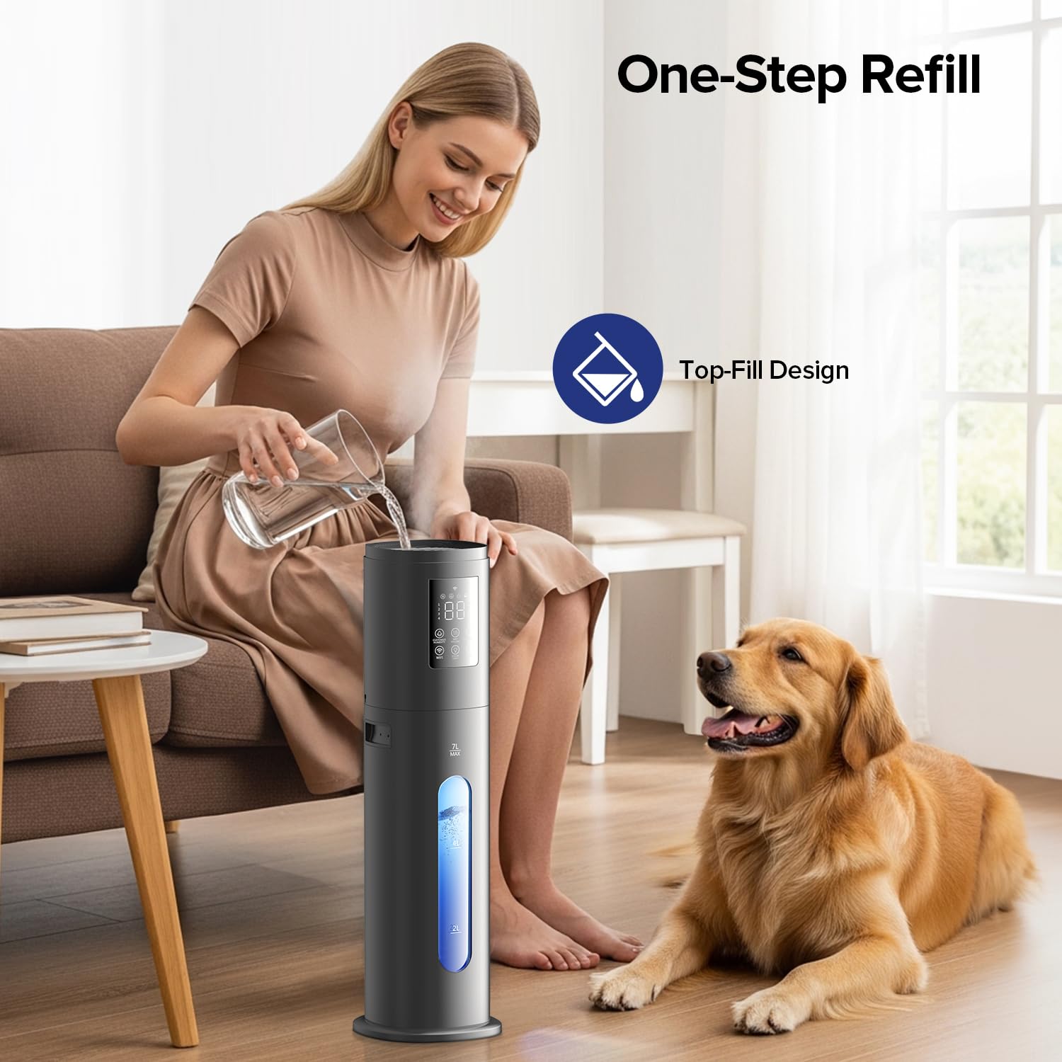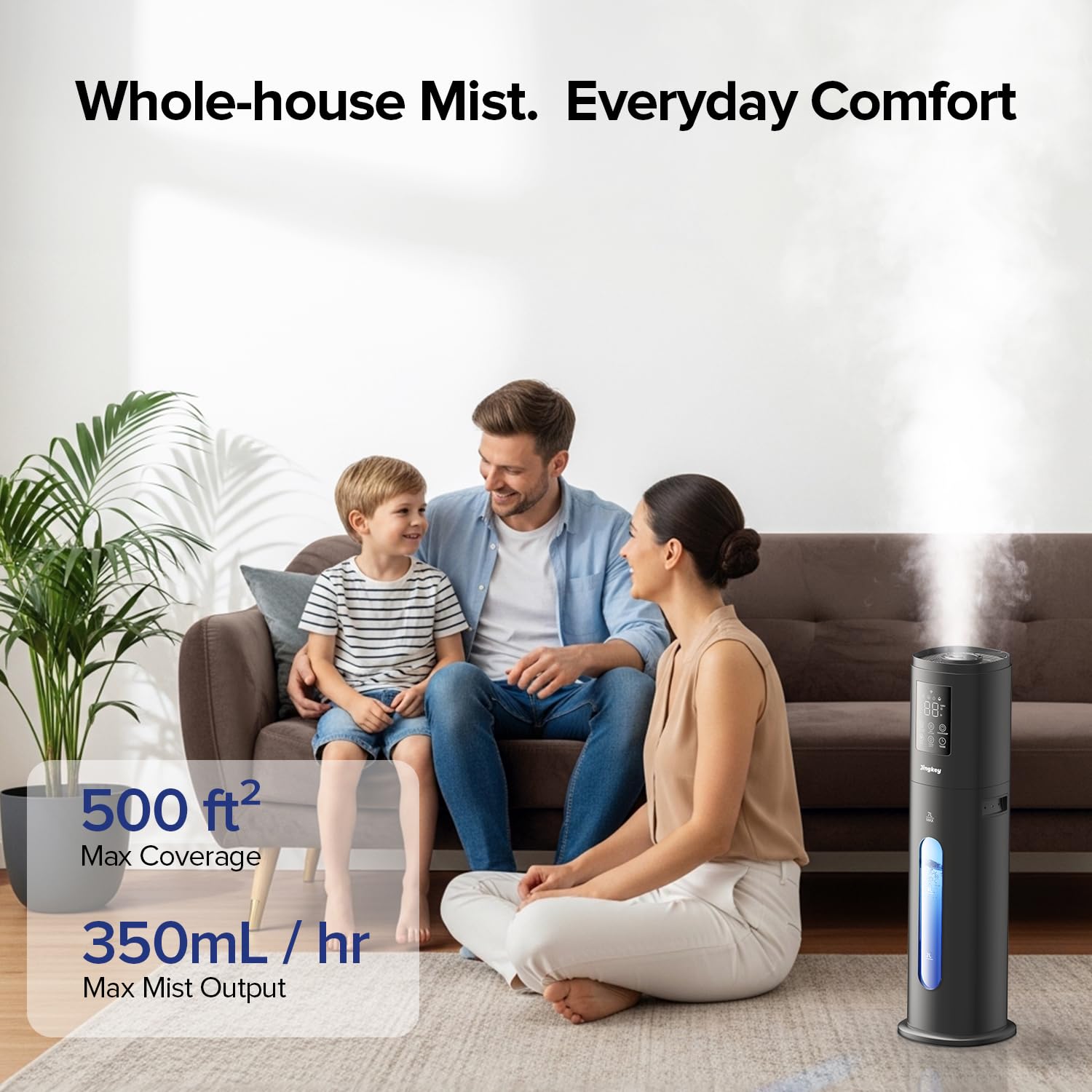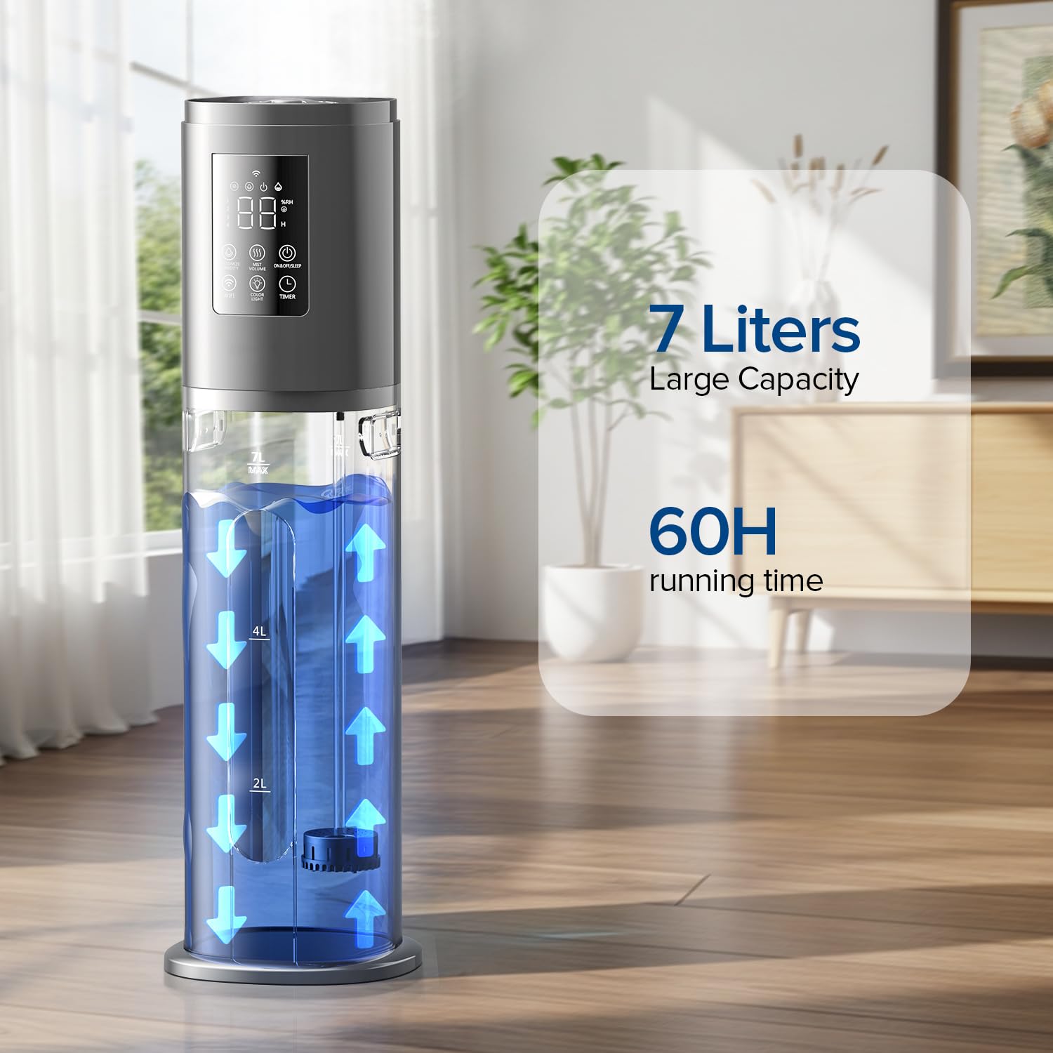 【Humidifier Large Room & Top Filling Design】: The cool mist humidifiers for bedroom with 7L removable large capacity , top-filling anti-leakage design improves the leakage problem and easy to refill,continuously up to 60 hours on a single refill needn't filling water frequently.350mL/h high moisture output is designed to humidify the air for cover up to 500 sq.ft ,better relieve air and skin dryness. Best whole house humidifiers for home, dorm and living room.