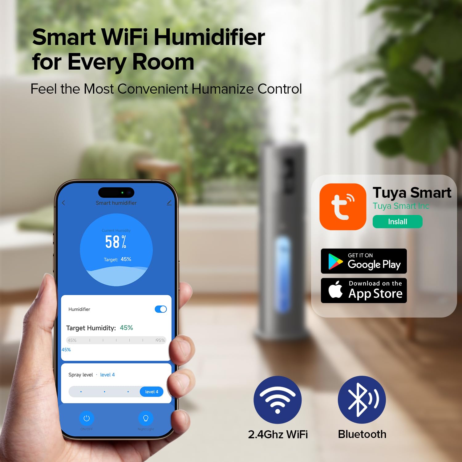 【Smart App & Remote & Touch Control】 : Connect the smart humidifier to the smart(TUYA) app to easily set up the large humidifier, you can control the air humidifier on your phone at any time. Adjust the humidity, timers, mist levels, night light and sleep mode. Large Room humidifier for bedroom also works with remote and touch control,You can create a moist and comfortable living environment at your own pace.(Only Support 2.4G Wi-Fi.)