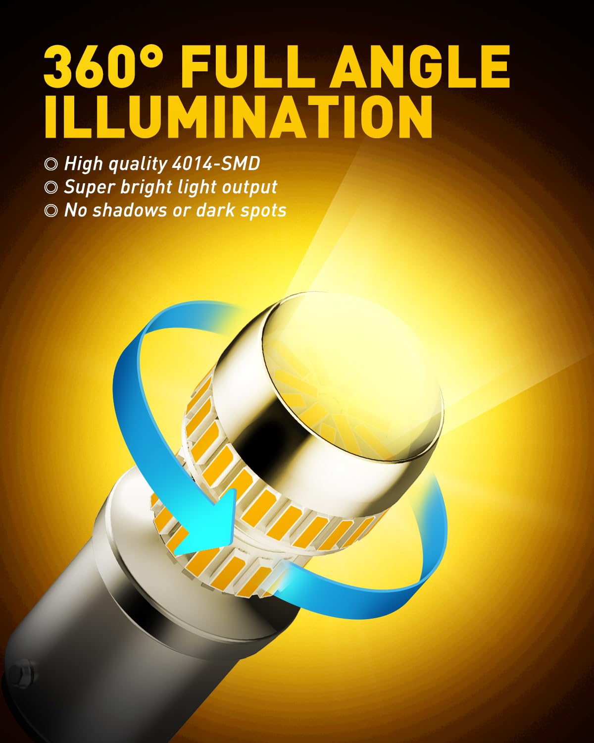 Unique imitated halogen shape design. Resembling halogen bulb shape design and sequencing 54 pieces 4014-SMD LED chips precisely around the light. Delivering 360° high luminous efficiency with full amber light, easier to be noticed and safer to drive