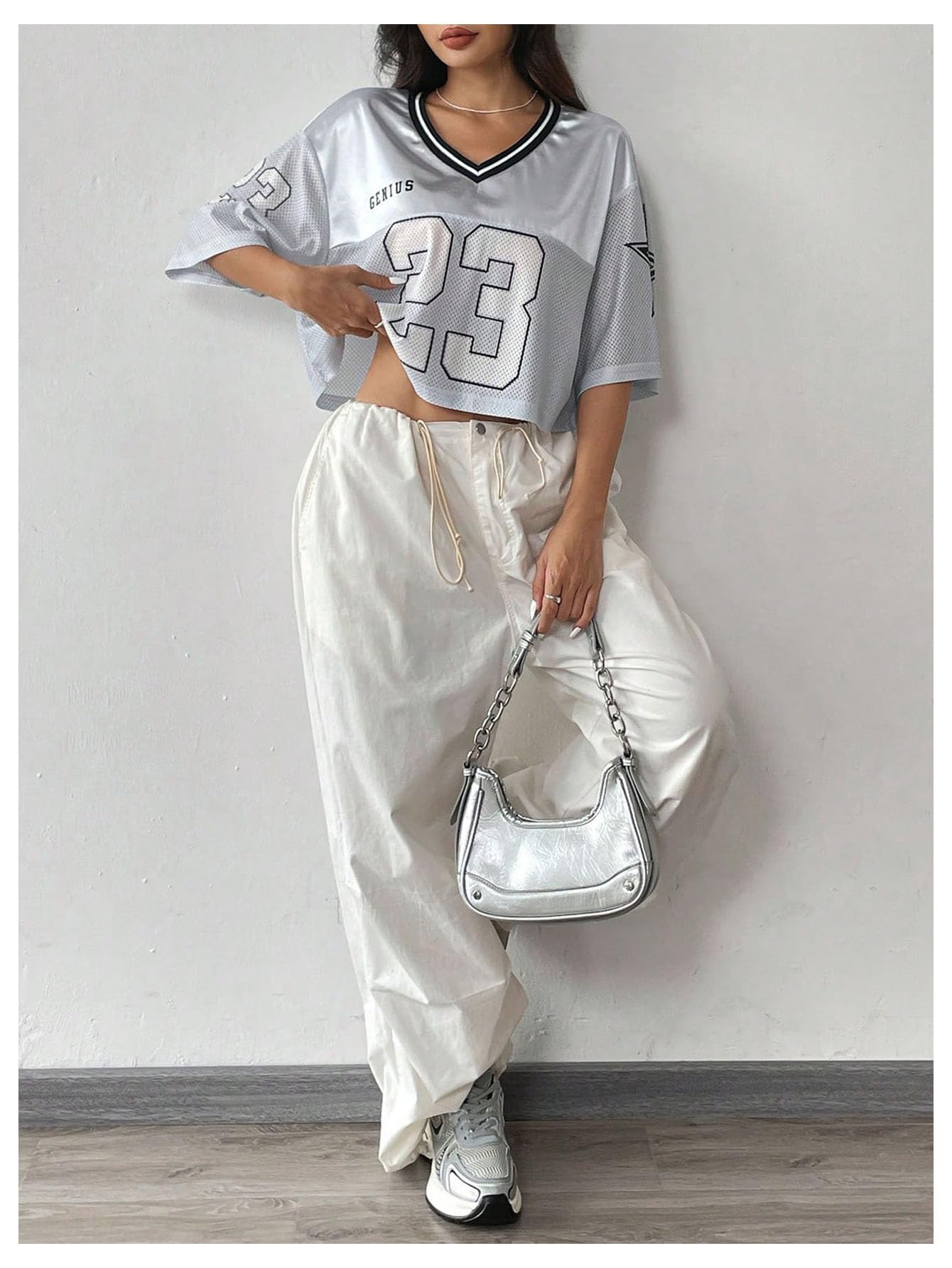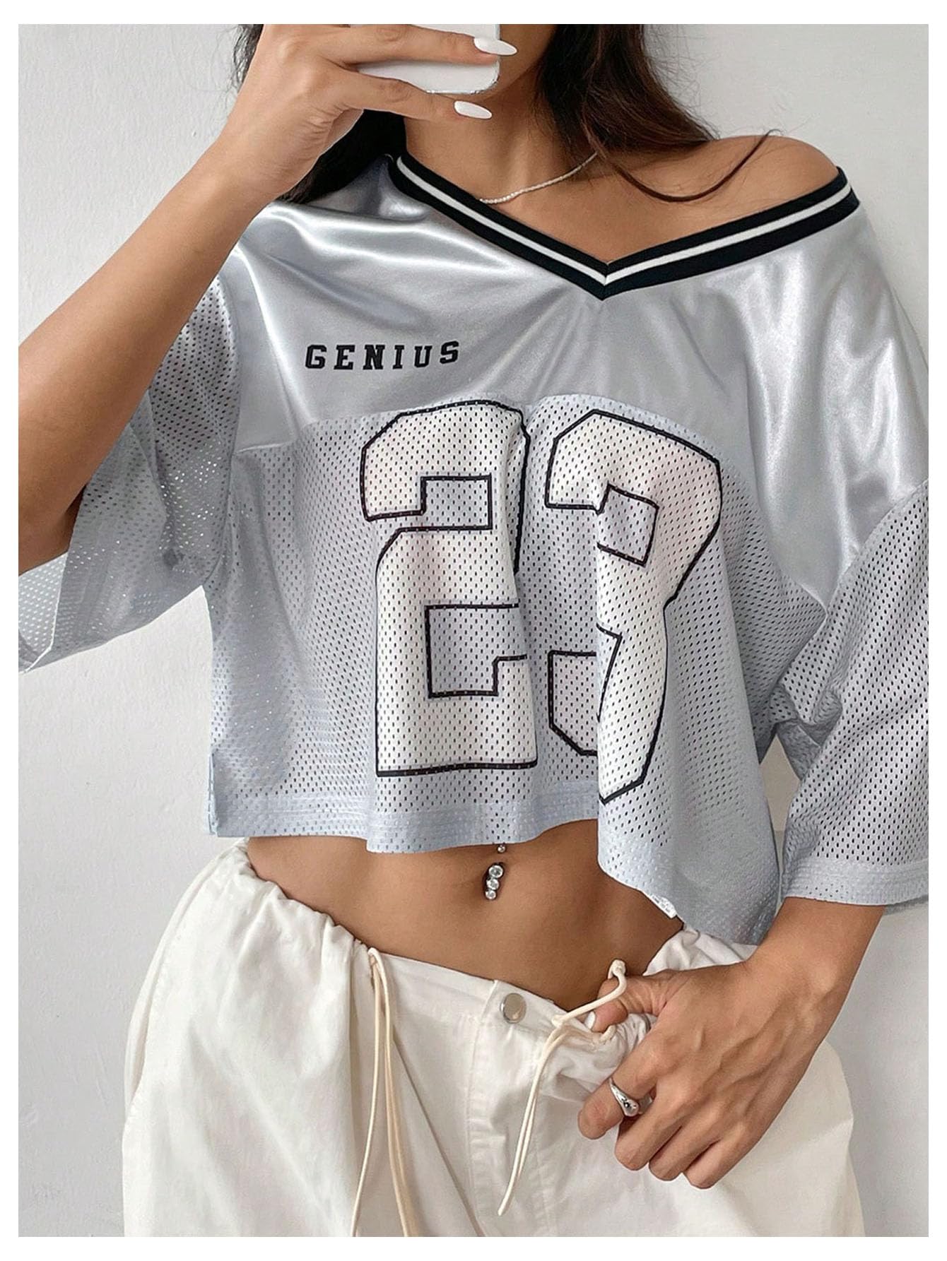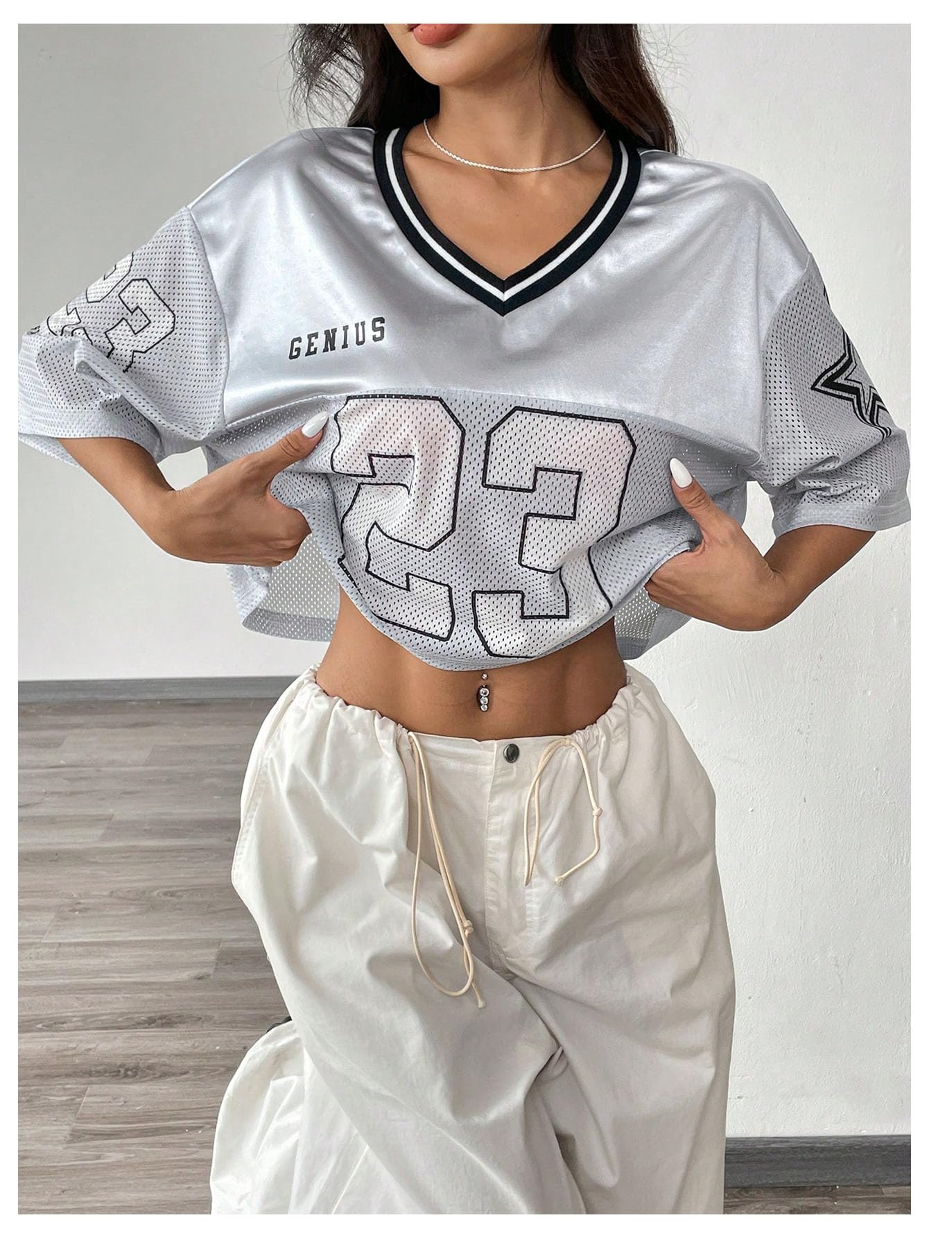 Half Sleeve, Letter and Number Graphic, Loose Fit, Oversized Y2K Crop Top, Streetwear for Women
