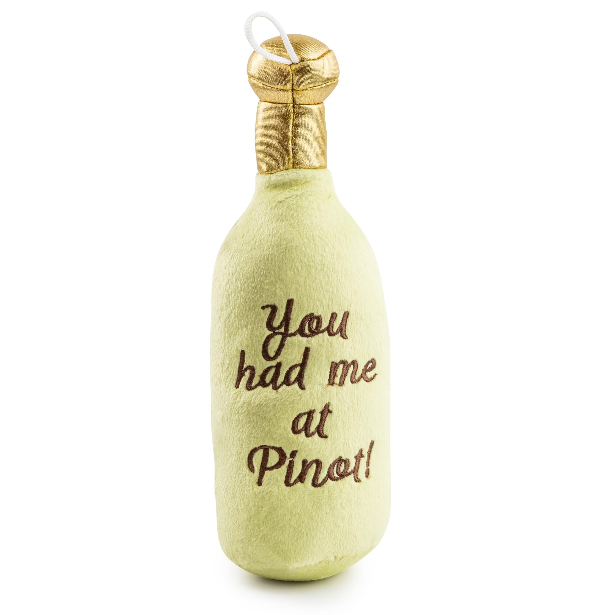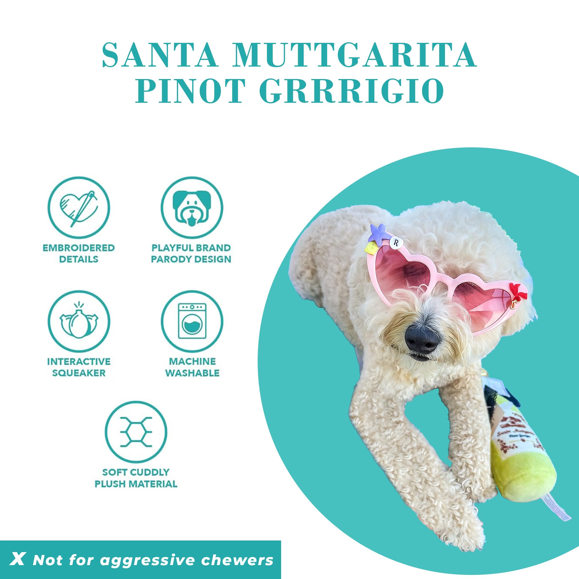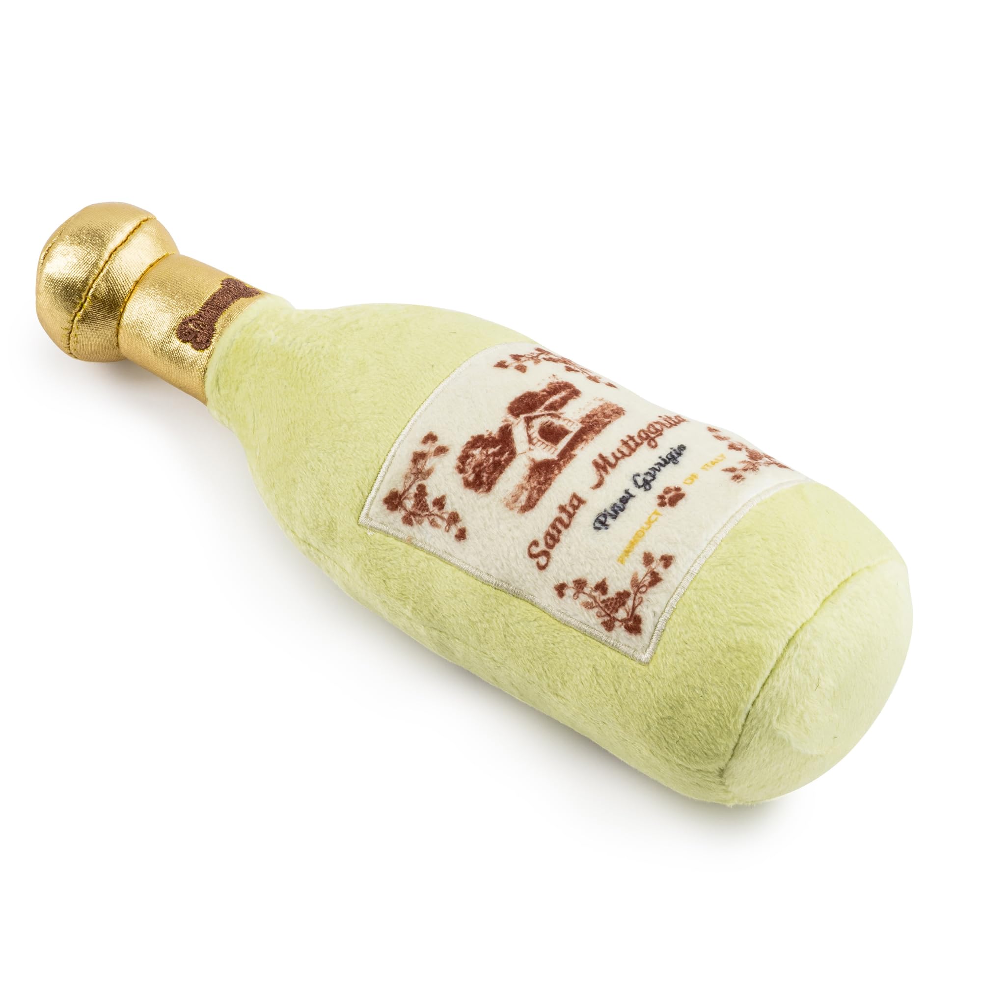 Funny Parody Plush Dog Toy: Make every moment with your pup a celebration with our Santa Muttgarita Pinot Grrrigio dog toy. This funny dog toy features a soft pale green exterior, golden cap with a built-in squeaker hidden inside. It's a playful, interactive dog toy that turns every playtime into happy hour! One size: 9"x3.25"x2.75"