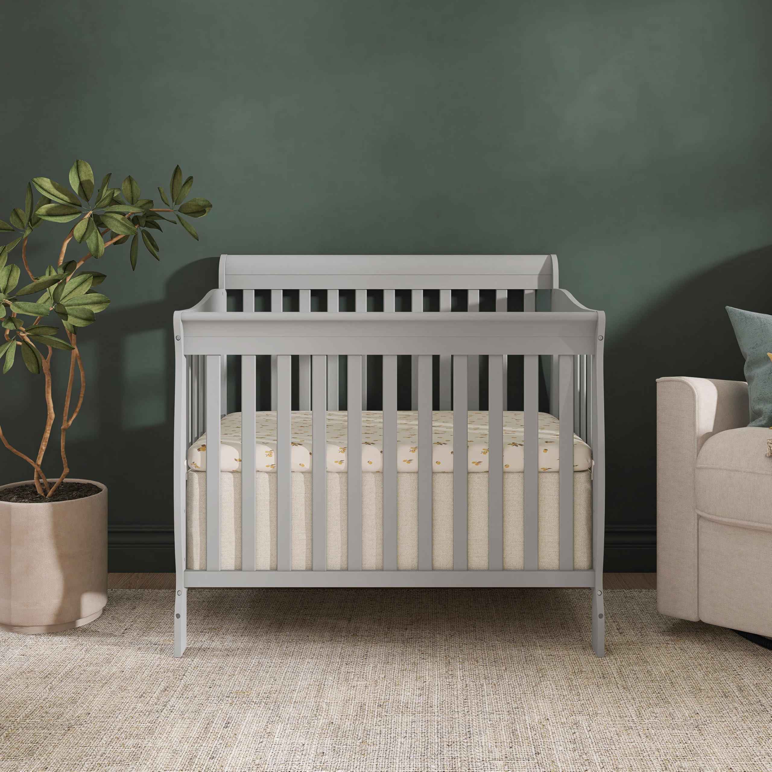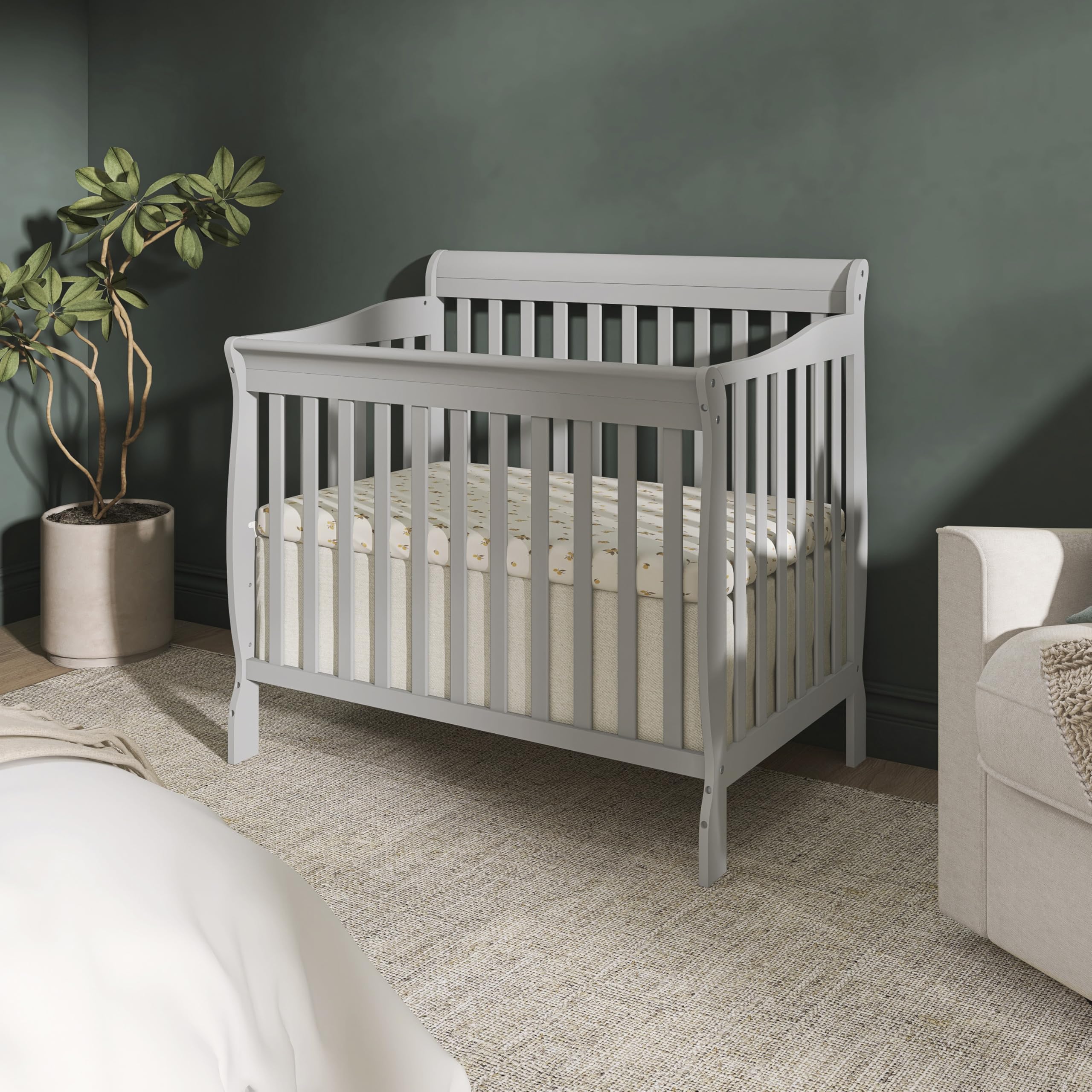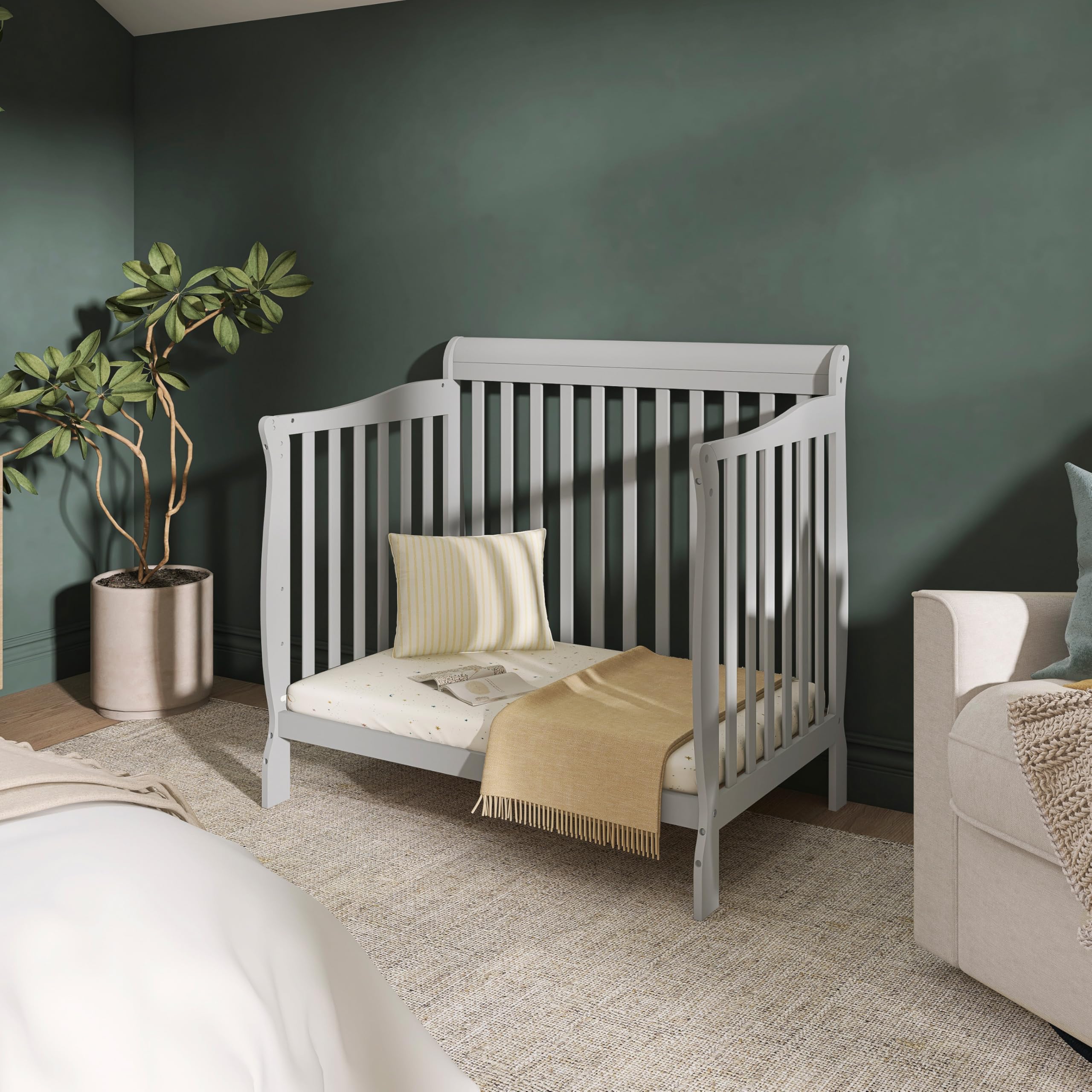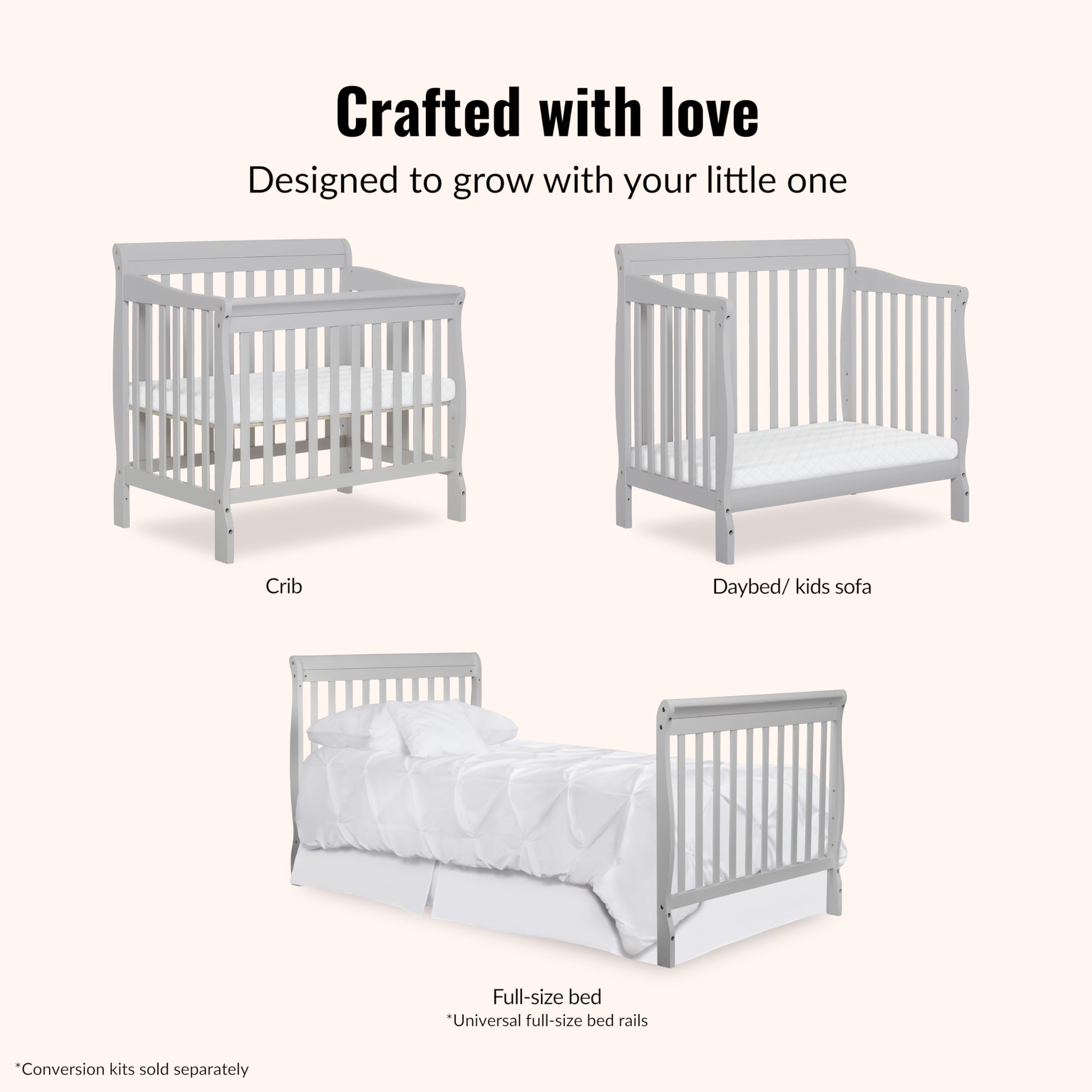4-in-1 Convertible Mini Crib – Grows with your child from infancy through toddler years into childhood, easily converting from a mini crib to a mini daybed and a twin-size bed with and without footboard (conversion kits sold separately), delivering long-lasting value and versatility