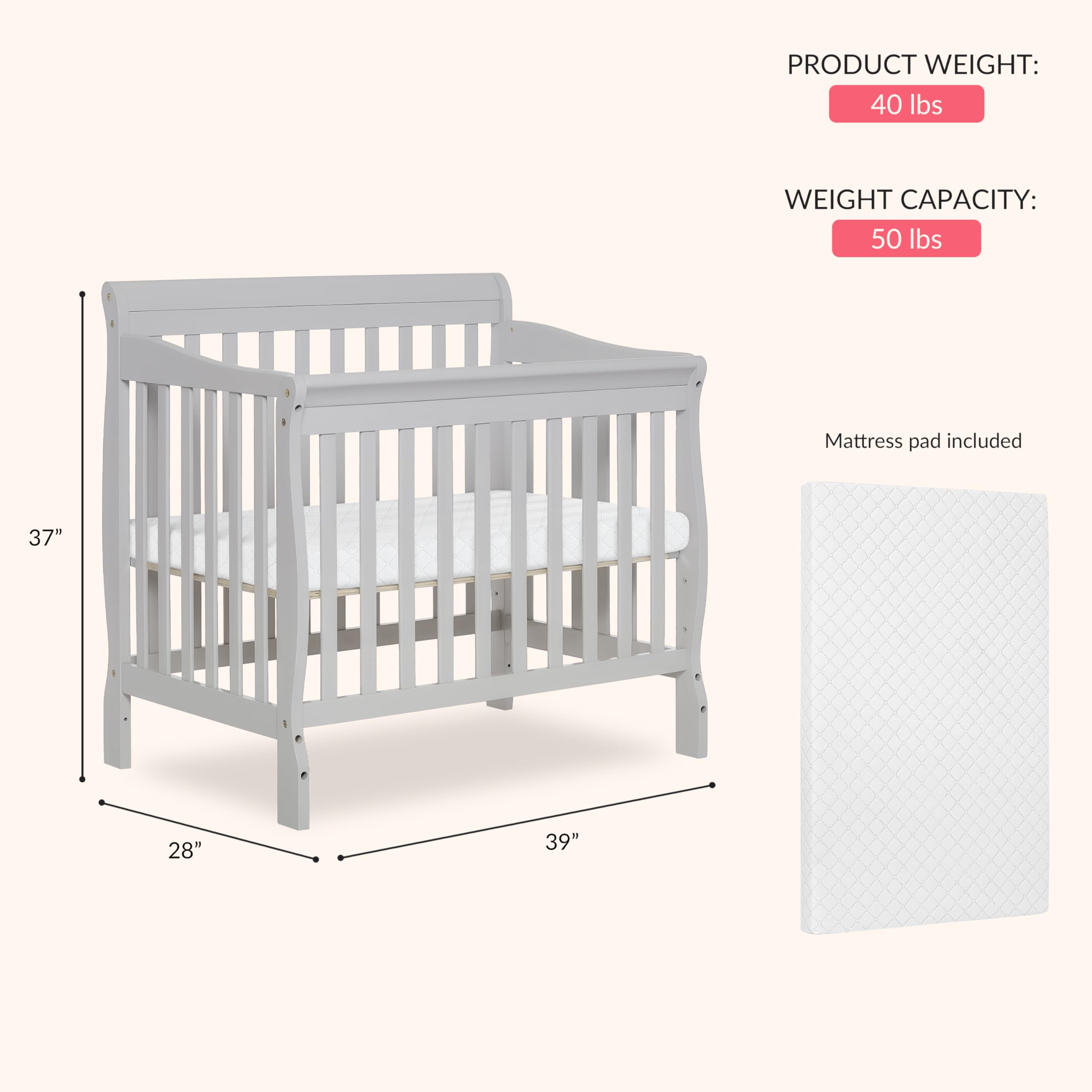 Every parent dreams of creating a cozy, safe, and stylish space for their baby — and the Dream On Me Aden 4-in-1 Convertible Mini Crib makes that dream a reality. Thoughtfully designed for modern families, this compact crib grows with your little one, offering timeless beauty, lasting quality, and unmatched versatility. From those first precious nights home to your child’s growing years, the Aden transforms right alongside them — from a mini crib to a mini daybed and finally into a twin-size bed (with and without footboard, conversion kits sold separately). Its space-saving design makes it perfect for apartments, condos, or smaller nurseries, while still giving your baby a comfortable, secure place to sleep. Crafted from premium New Zealand pinewood, this mini crib features three adjustable mattress heights, adapting effortlessly as your baby grows and learns to stand. Every curve and finish has been designed with both style and safety in mind, creating a nursery centerpiece that complements any décor. Parents can rest easy knowing the Aden meets and exceeds all ASTM, CPSC, and JPMA safety standards. It is also GREENGUARD Gold Certified, meaning it has been screened for over 10,000 chemicals and VOCs to ensure cleaner indoor air for your baby’s health. The Baby Safety Alliance verification and CPSIA compliance further confirm its commitment to a safe, toxin-free sleep environment. For extra convenience, the Aden includes a 1-inch mattress pad and fits perfectly with any Dream On Me GREENGUARD Gold Certified mini crib mattress. Measuring 39"L x 28"W x 37"H, it’s the ultimate space-saving nursery solution that doesn’t compromise on comfort or quality. Whether it’s your first baby, a gift for grandparents’ home, or part of your growing family’s dream nursery, the Dream On Me Aden 4-in-1 Convertible Mini Crib is built to stay — from sweet beginnings to growing dreams.