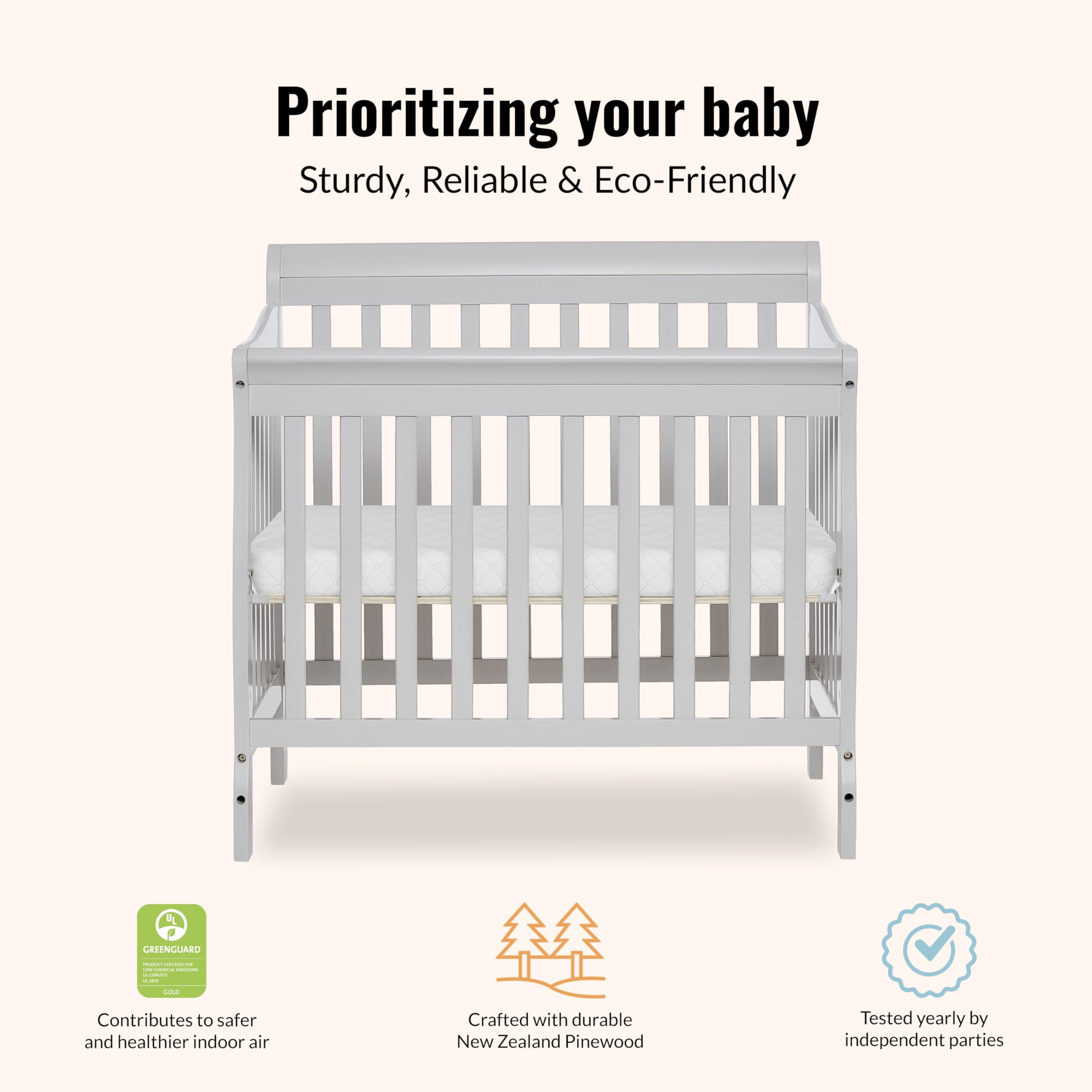 Tested & Certified for Safety – Expertly designed to meet or exceed ASTM and CPSC safety standards requirements. This crib is also Greenguard Gold Certified, screened for over 10,000 chemicals and VOCs to ensure cleaner indoor air and a healthier environment for your baby