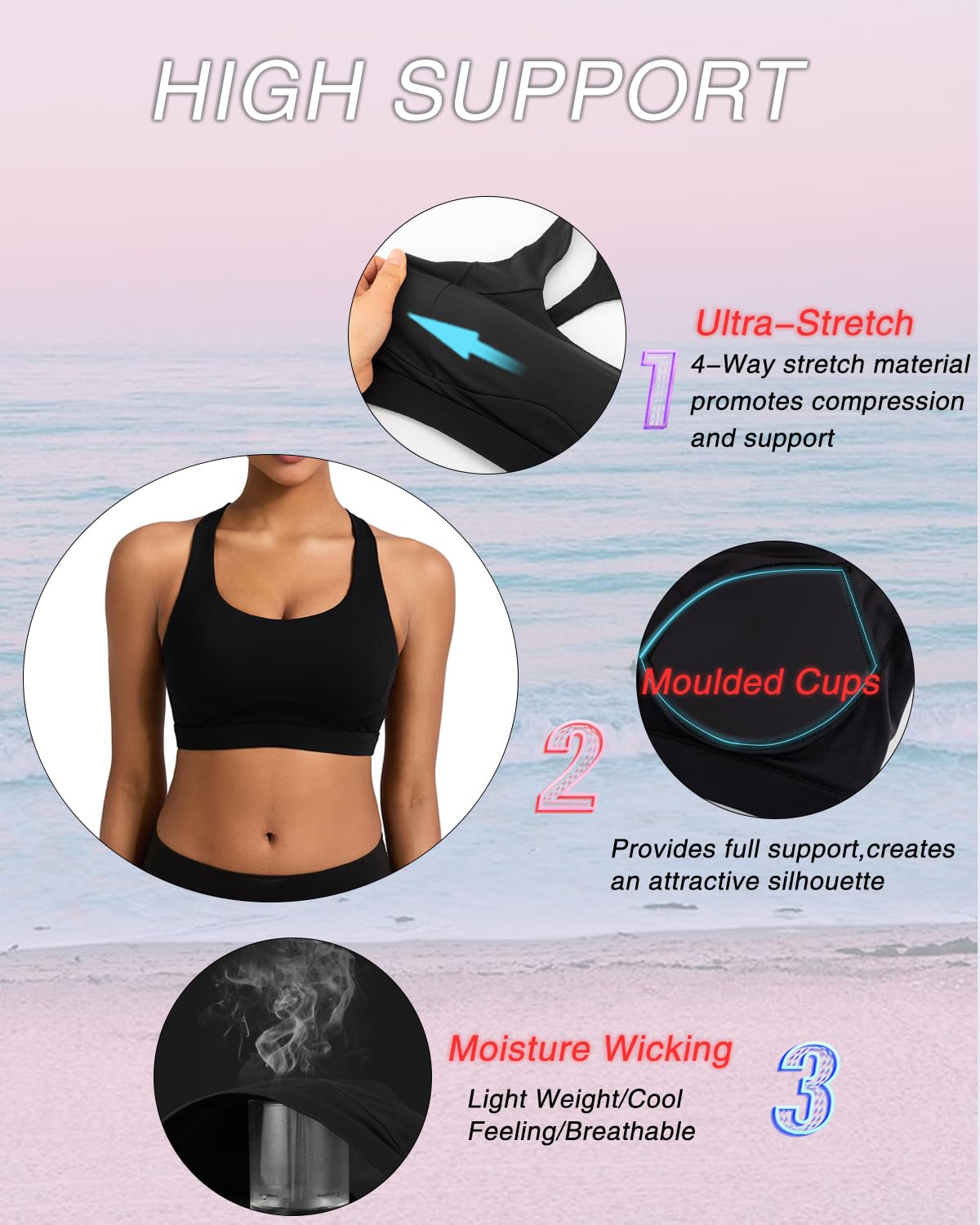 ✅ 【SWEAT OUT IN STYLE! 】: Made from a flexible four-way stretch fabric that supports your body as you move. Enjoy the freedom of movement as the open back styles aim to keep you comfy and cool while you bring on the heat! High support sports bra with sewn in pads with wide waist band for that support we all need!