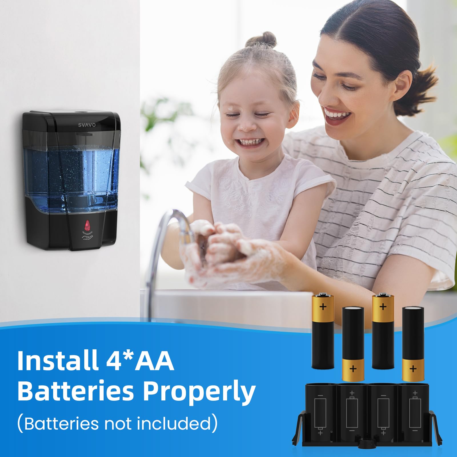 ✔️ [Space Saving & Energy Efficiency] The wall-mounted soap dispenser features save space on a confined vanity; The mount design allows you to save countertop space naturally-Small Footprint and Large Capacity. 4 AA-size batteries (not included) will allow you to enjoy hands-free soap dispensing for up to a year before having to change batteries, not over consume battery.