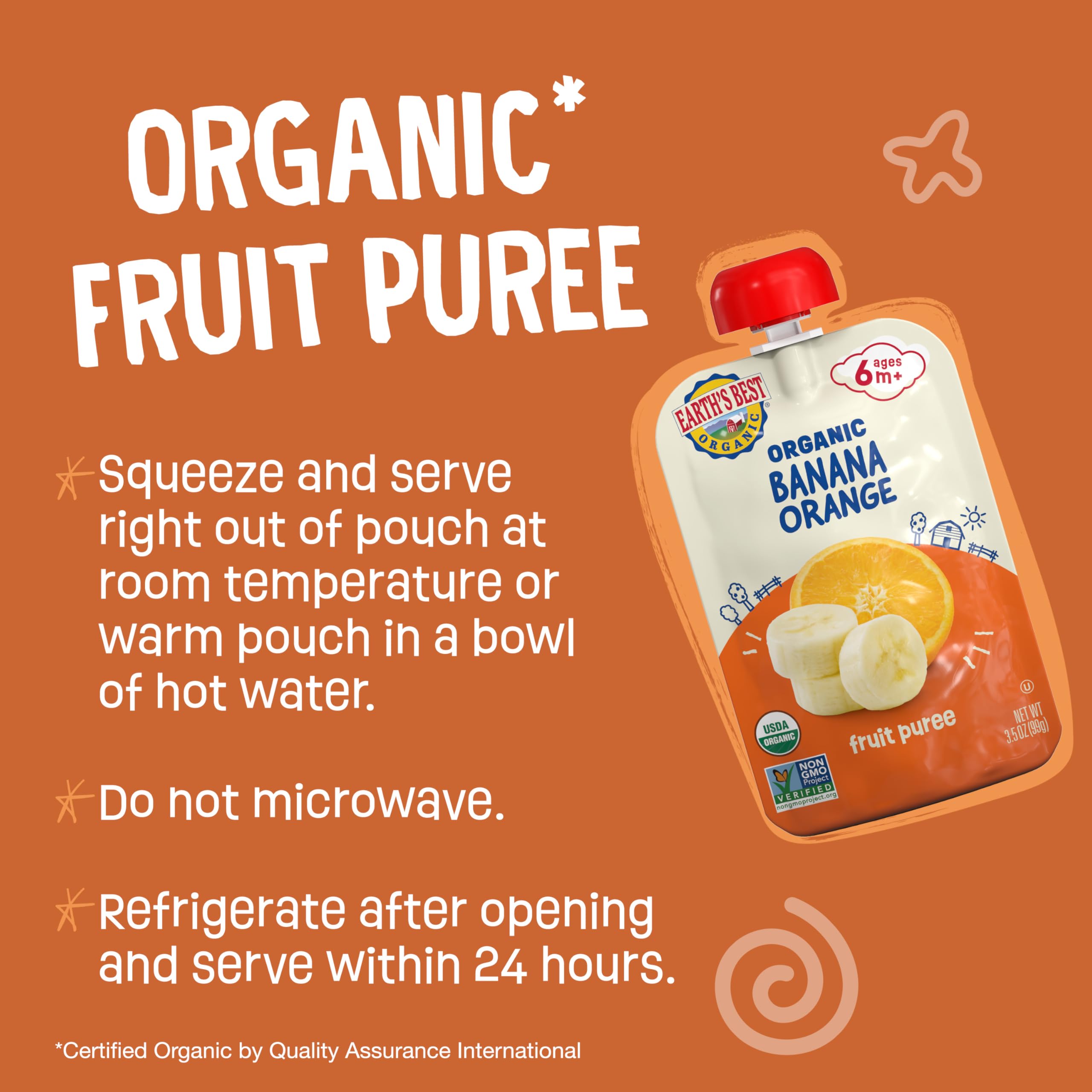 As your little ones grow, their palates grow too βˆ’ so help them explore a new world of food with Earth's Best Organic pouches. Designed with little taste buds in mind, our purees have the right flavors and textures for each step of your little ones’ developmental journey and help them grow a love of good food. Earth's Best Organic Banana Orange is made with real organic fruits. For little ones 6+ months.
