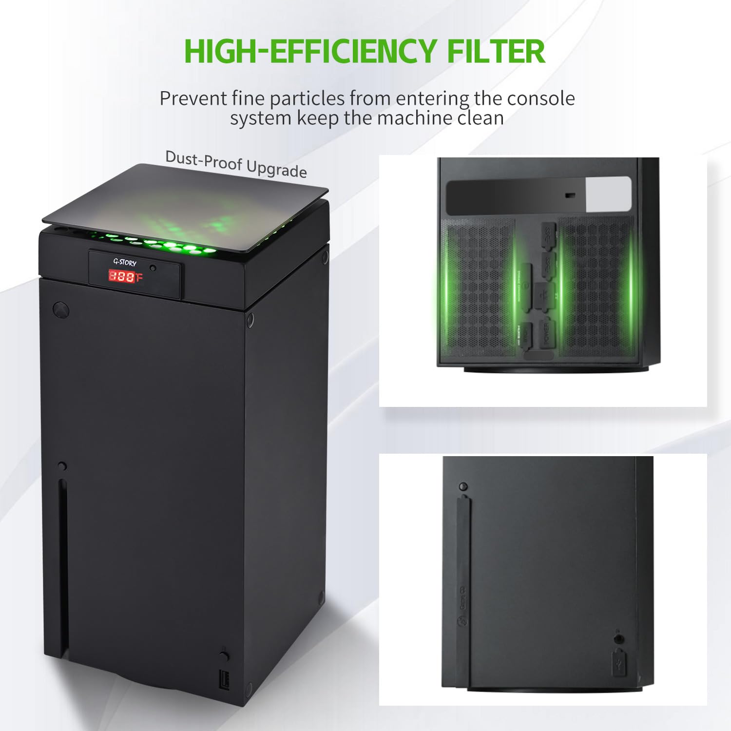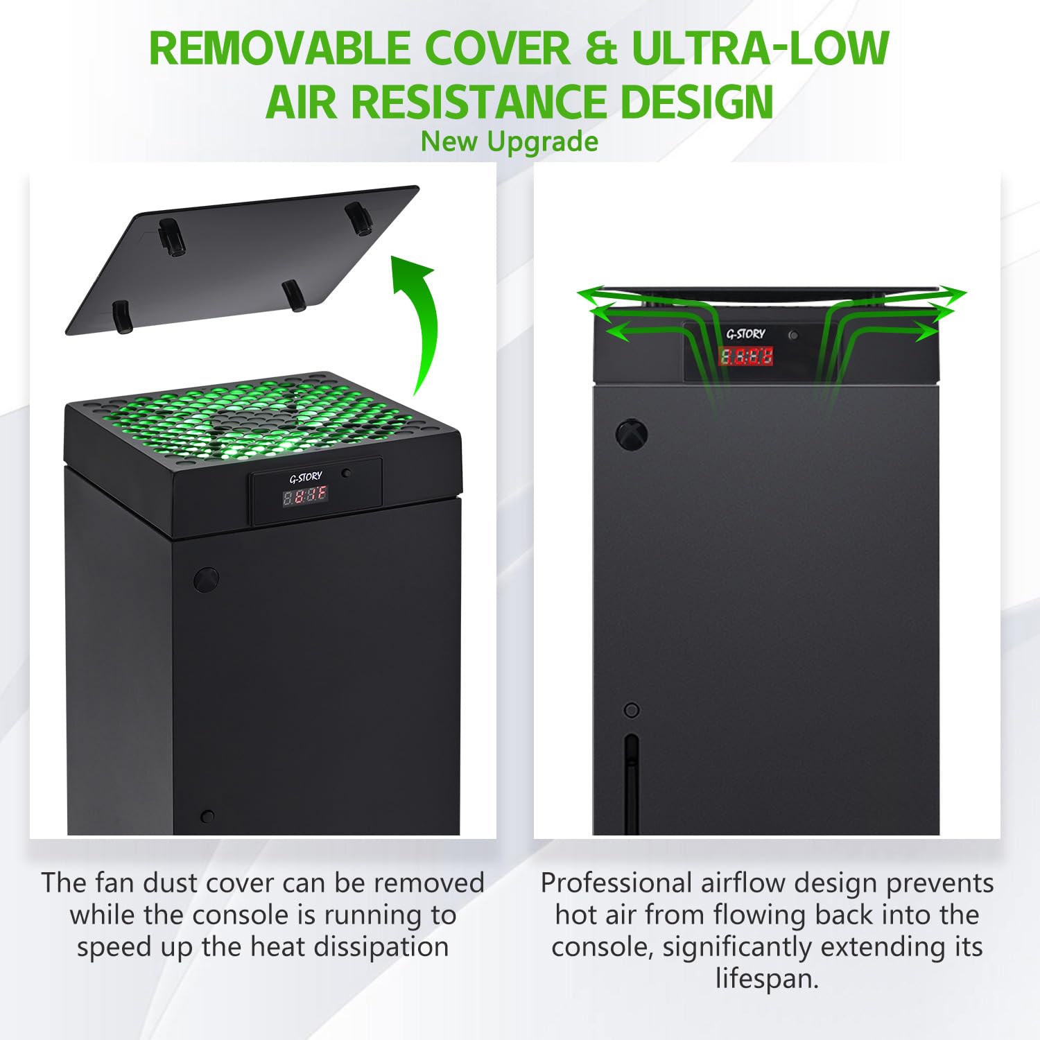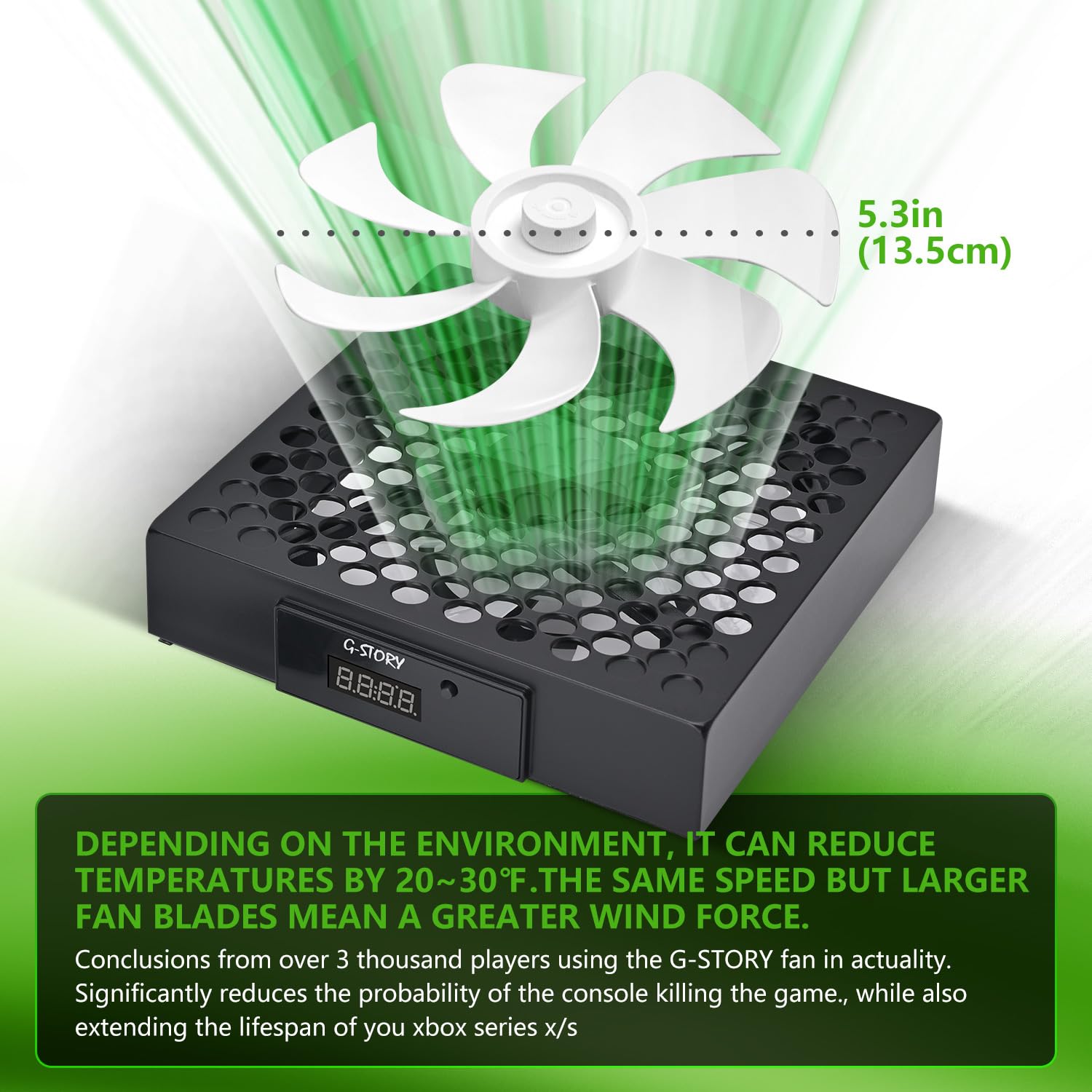 🍃Intelligent Control & Custom fan speed-[Automatic Mode]: The chip of G-STORY Xbox Series X cooling fan can automatically sense the temperature to adjust the fan speed, you can just enjoy the game and leave the heat to our cooling fan. (when the temperature is <35℃/95℉, it will stop working.) [Manual Mode]:Press the button to select the 3 speed you need, the LED will change color with the speed. (Note: Press down the button for 3s to switch between manual and automatic mode.)