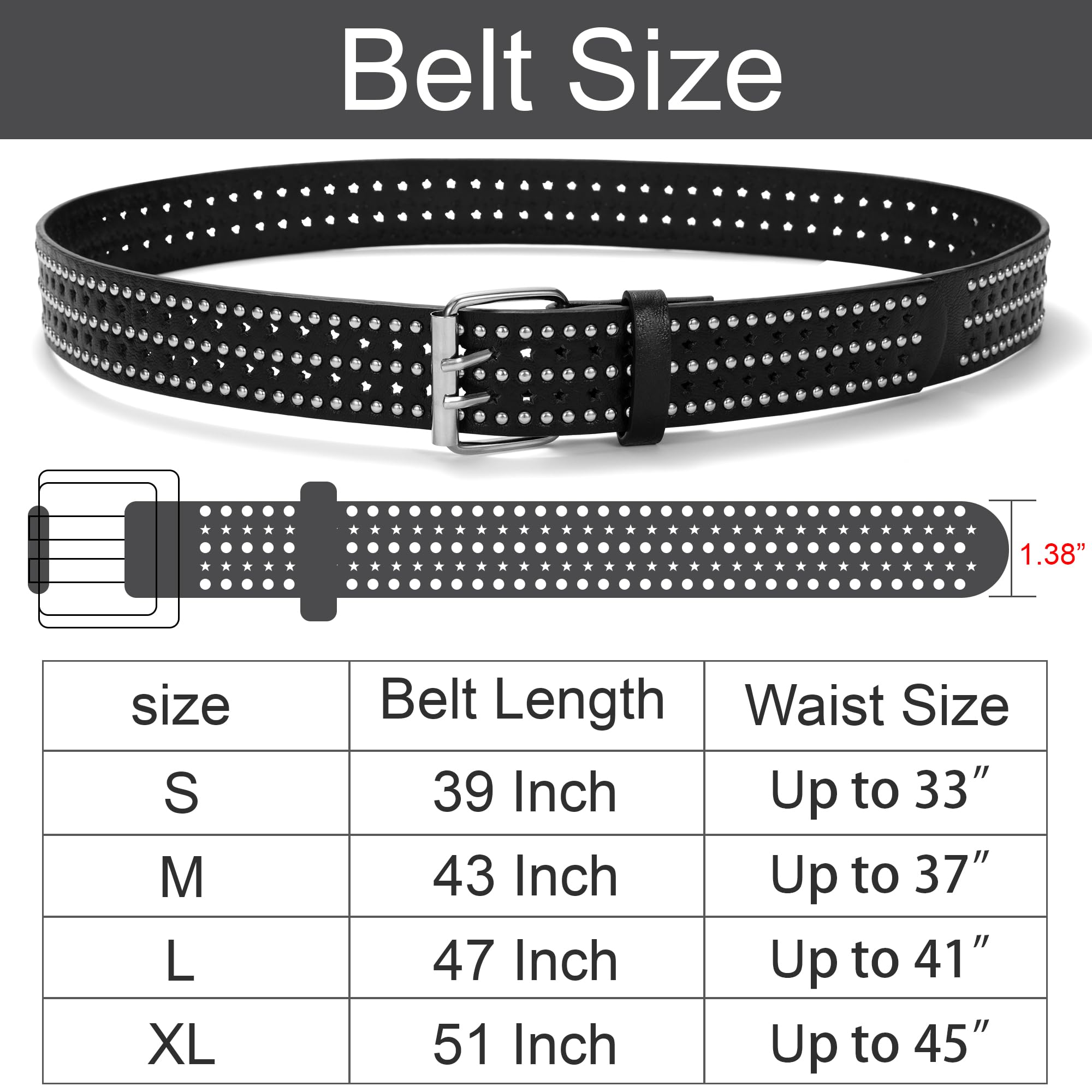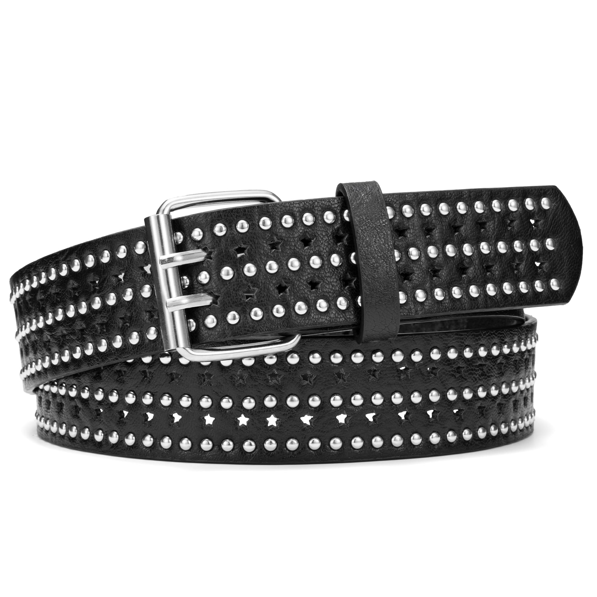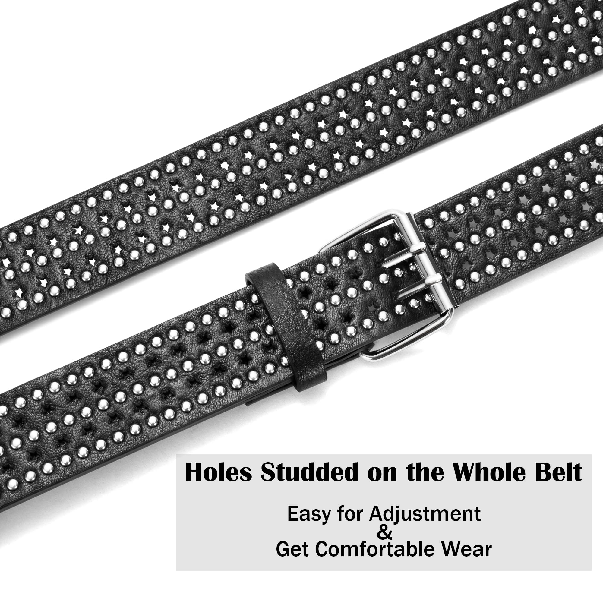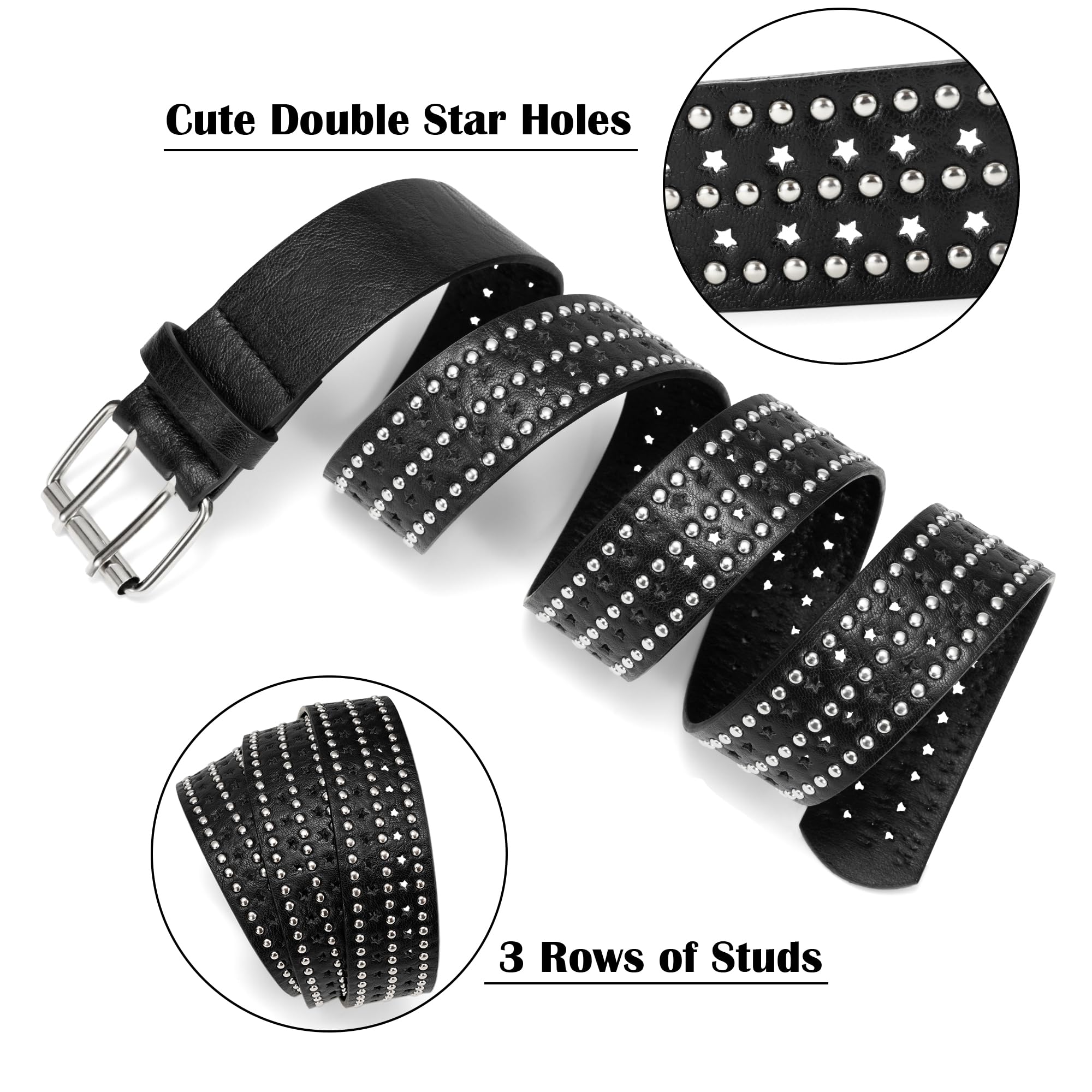 Fashion Studded Belt: The 3 rows studs on the black strap will give you a punk rock look during your casual life, and the continuous cute star eyelets make this womens leather belt more convenient to adjust for different waist sizes and also add a little y2k style to your attire