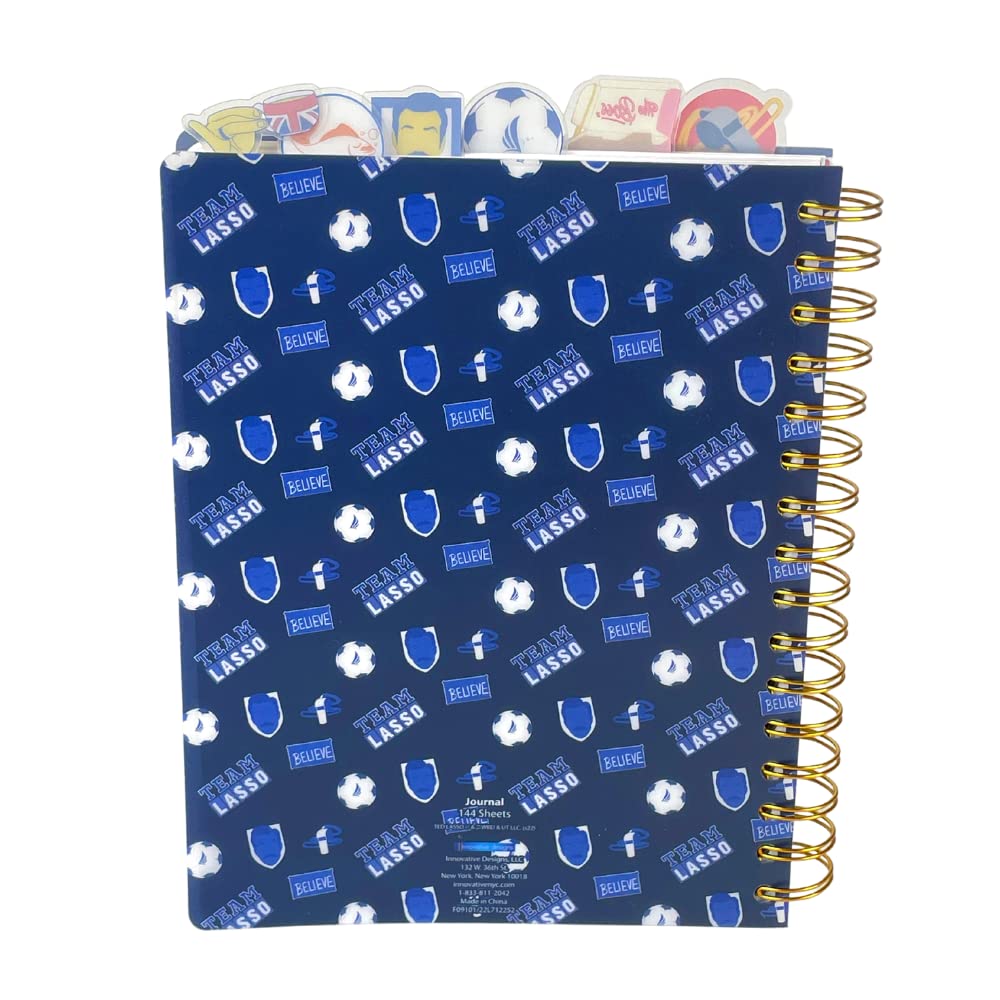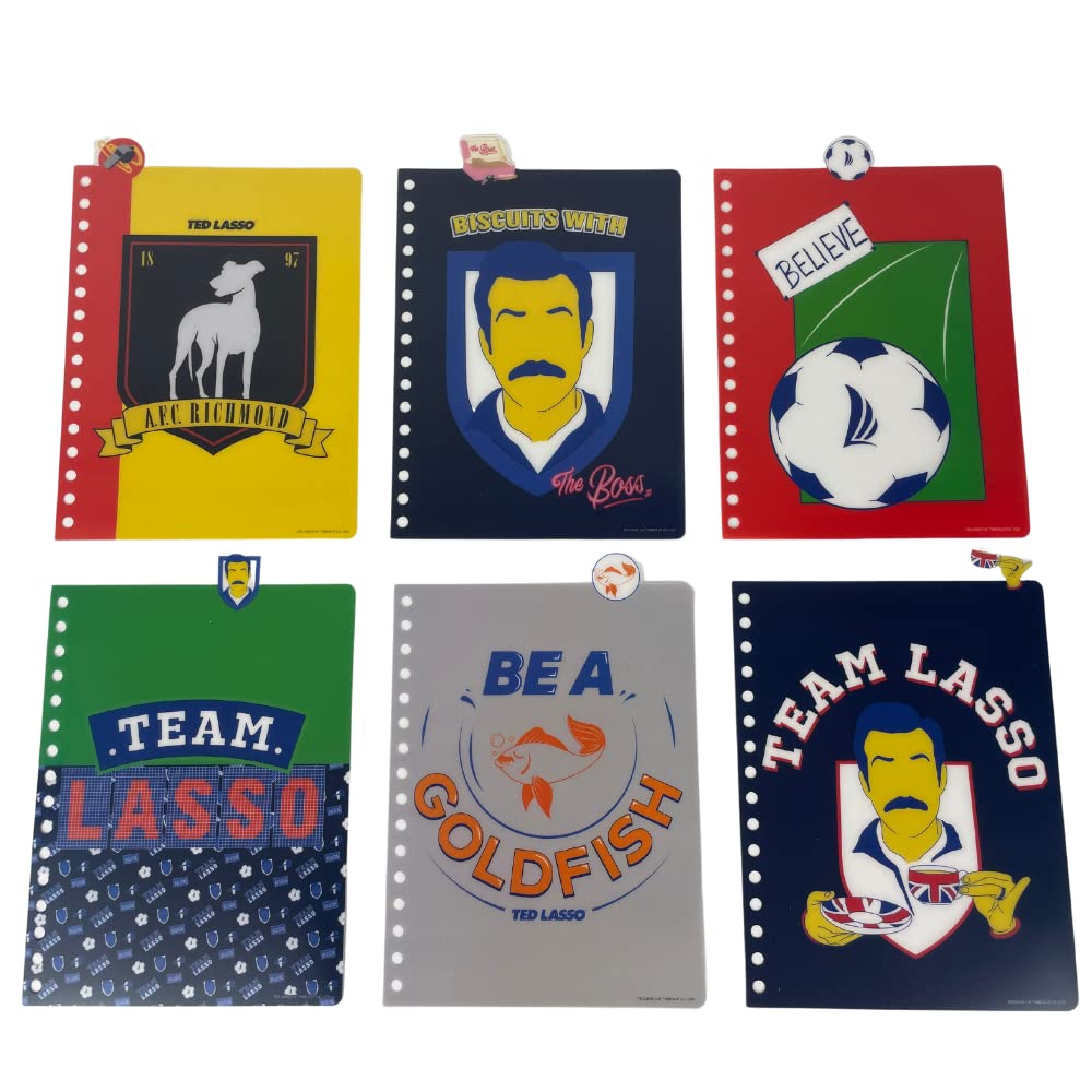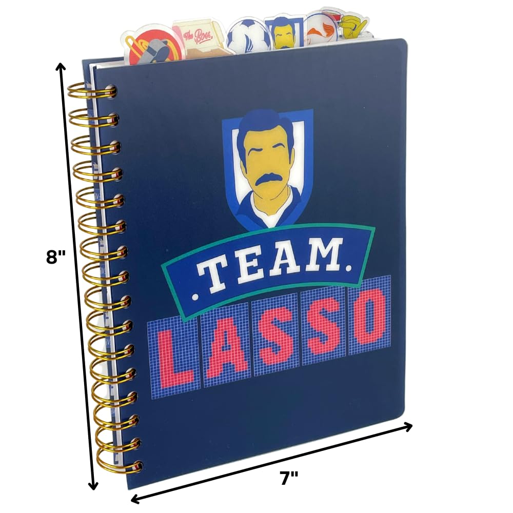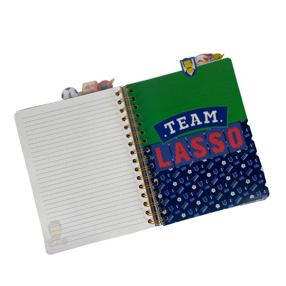 TEAM LASSO NOTEBOOK - Features lined pages with colored Ted Lasso icons on the corners, 6 color illustrated section dividers, and tab dividers.