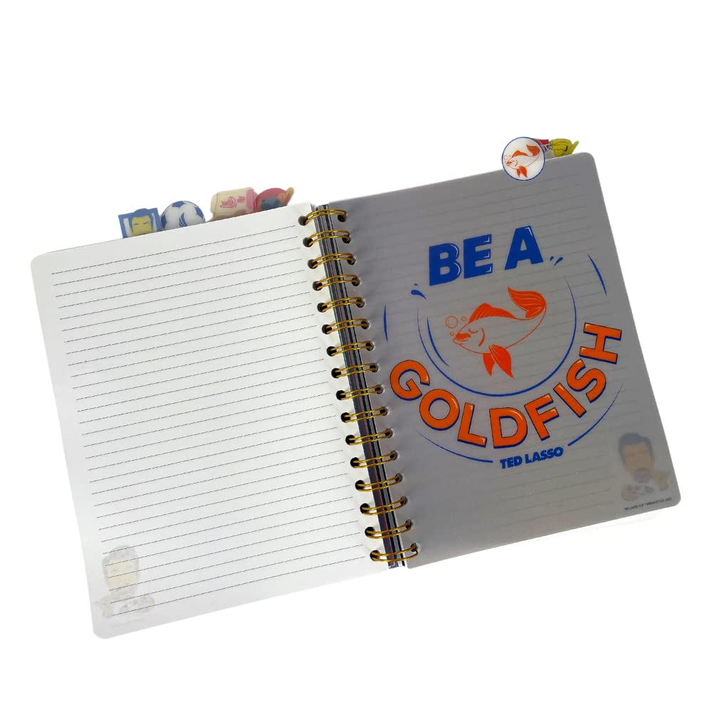 Features lined pages with colored Ted Lasso icons on the corners, 6 color illustrated section dividers, and tab dividers.The protective vinyl cover is easy to wipe clean, and the themed separators stick up from the top for easy flipping. Each section divider is colorfully illustrated with sayings and icons from the Ted Lasso TV series. Makes a great writing journal for anyone who love Ted Lasso. The spiral binding makes it easier to write since the pages lay flat. It’s perfect for desks, offices, travel, or school. With Ted himself on the front and iconic Ted Lasso references like “Believe” and “Be a Goldfish,” this is the perfect present for Lasso fans.