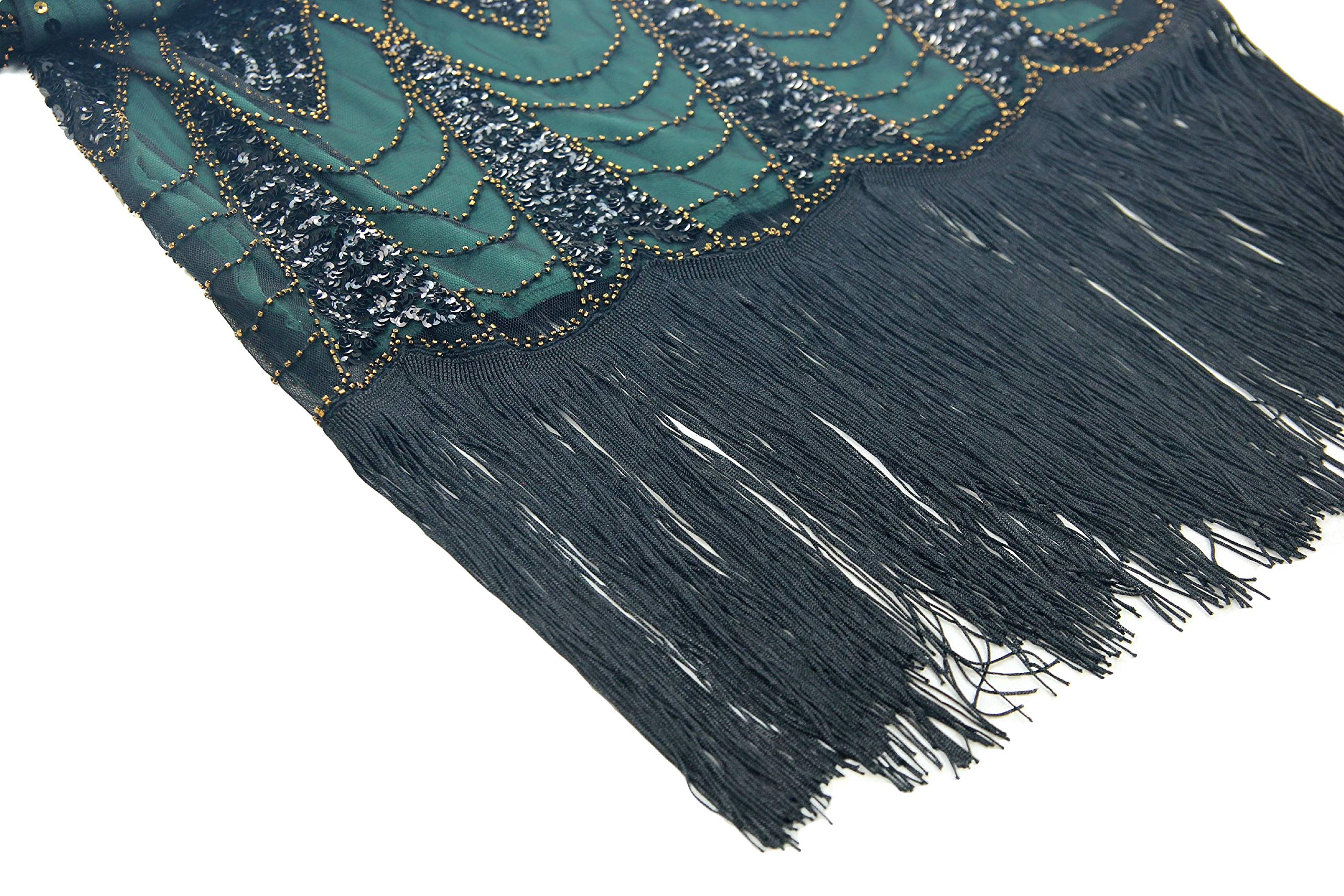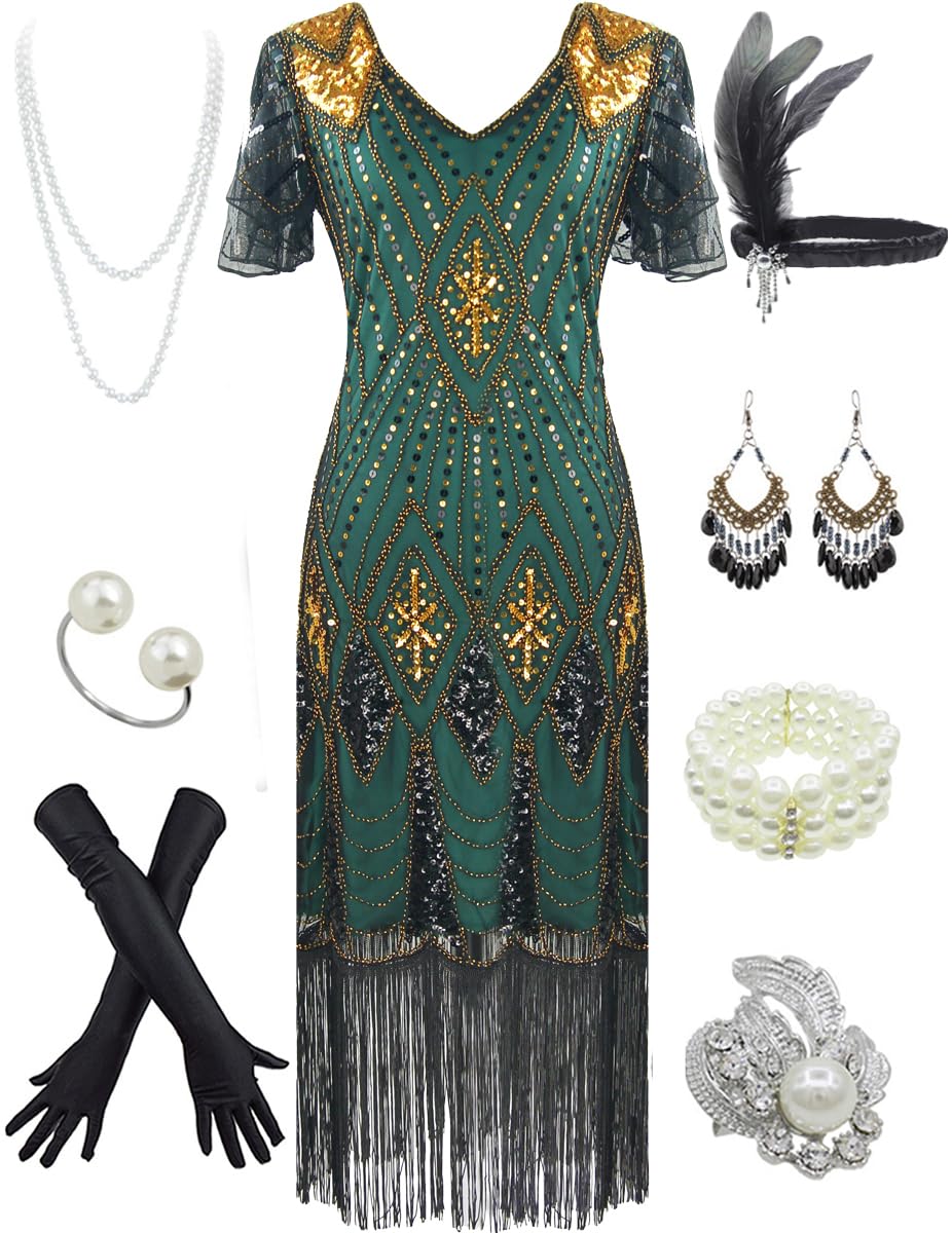 Package include: 1 x 1920S Sequin Tassel Flapper Dress , 2 x Pearl Necklace ; 1 x Long Satin Gloves; 1 x Headband ; 2 x Earrings ; 1 x Pearl Bracelet ; 1 X Pearl Brooch ; 1 x Pearl Open Ring.