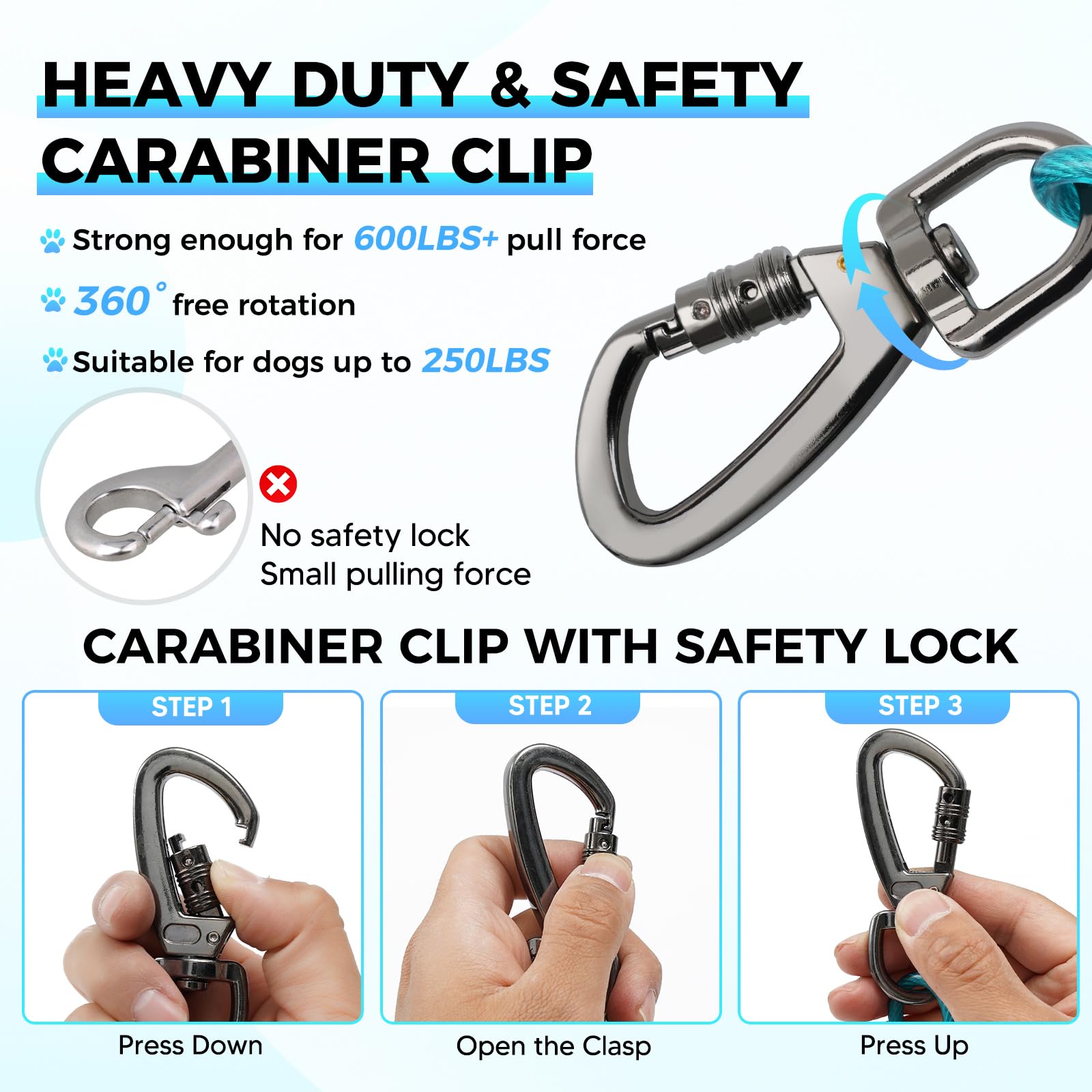 Heavy Duty & Safety Carabiner Clip:The 360° rotatable clip is made of heavy-duty zinc alloy that is very strong to give your dog more relaxation,yet durable enough to withstand the strongest pulls up to 600 lbs.Self-contained safety lock design with swivel fastening technology prevents your dog from coming loose while running and playing