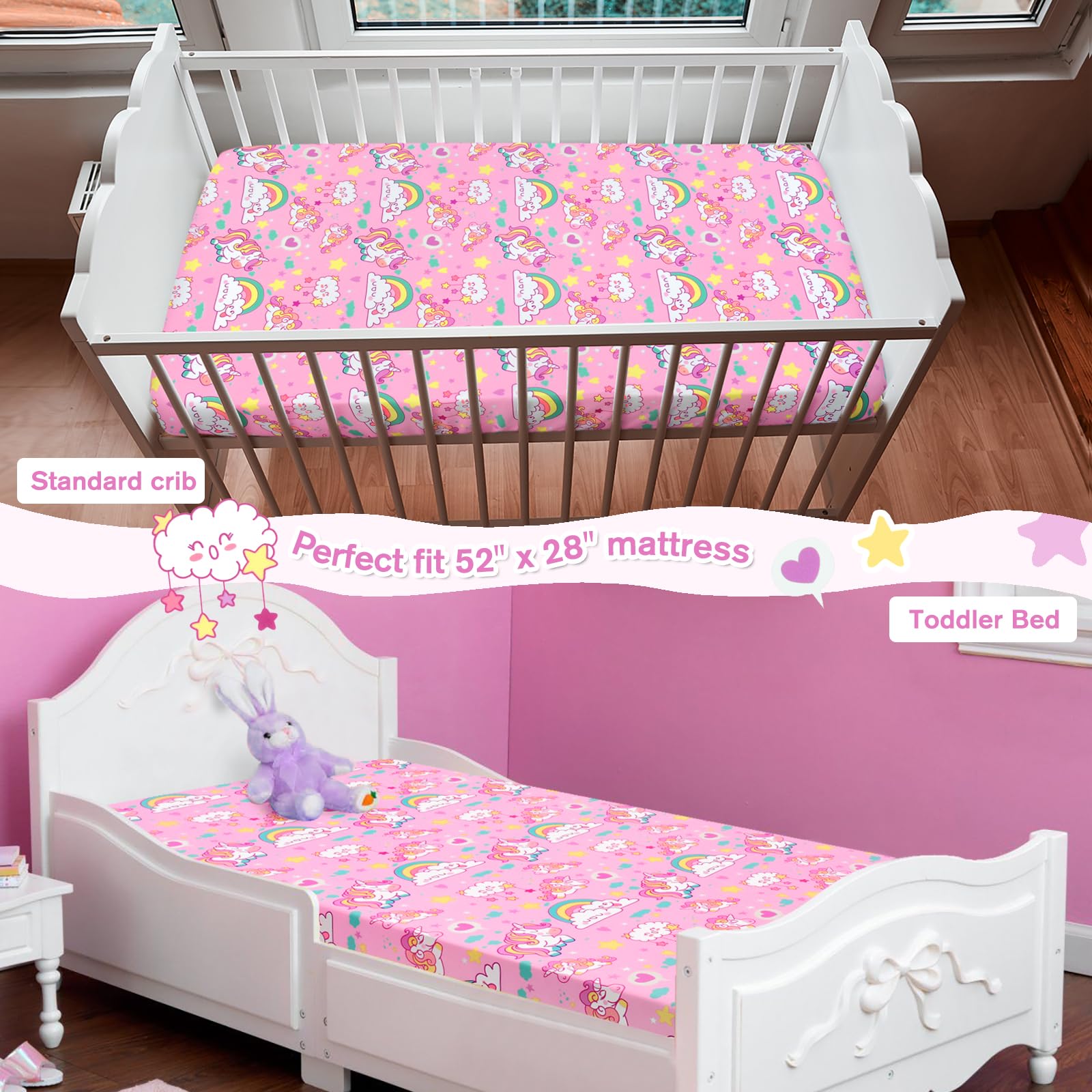 ใEasy Careใ: Simply toss this pink unicorns crib sheet into the washing machine on gentle cycle and it'll be as good as new. Try to avoid sun exposure, can dry it on the reverse side. The high-quality fabric ensures that standard crib sheet retains its shape, color, and softness even after multiple washes, making it a practical and long-lasting investment.