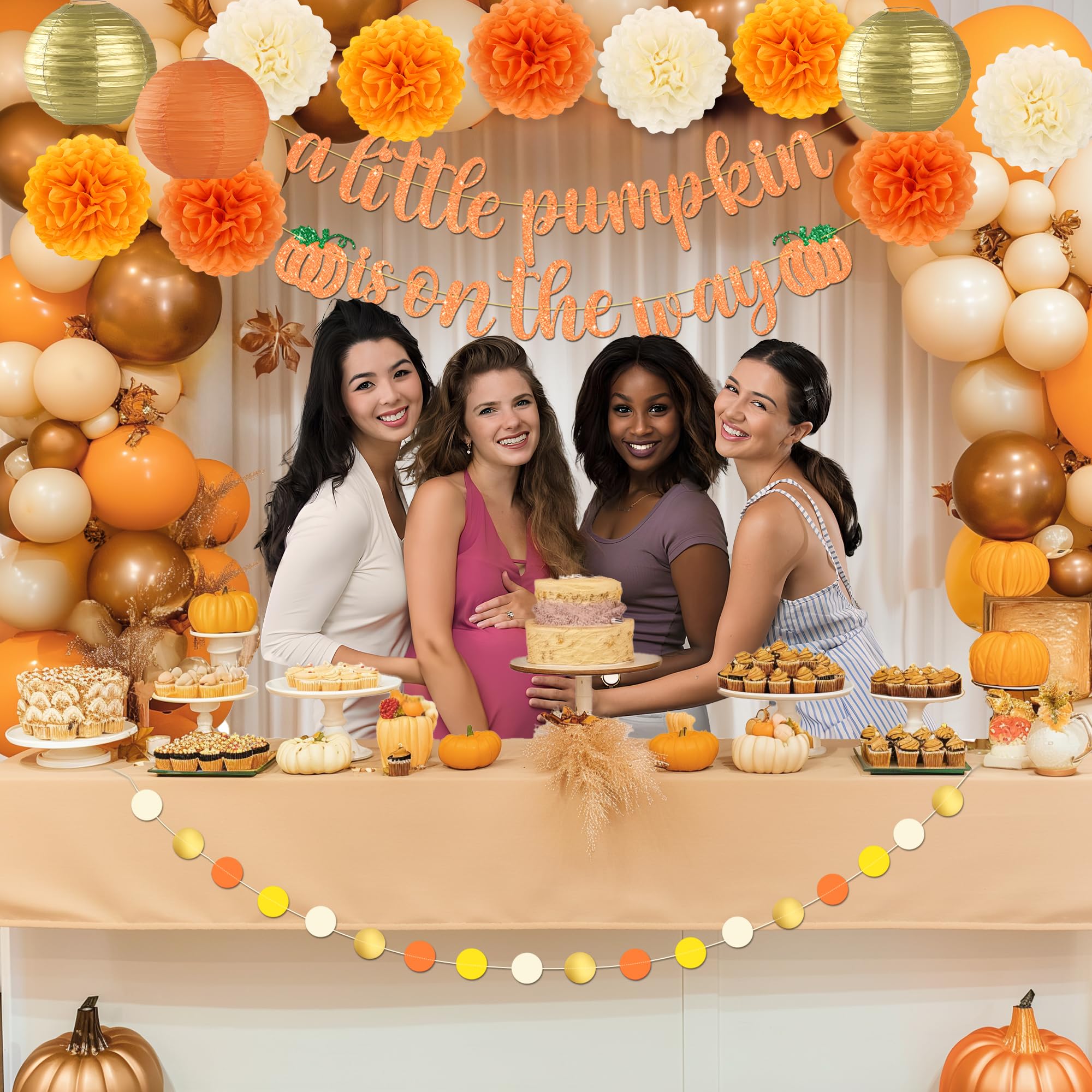 Whatβs in the Box: Delight in a comprehensive set including 3 light orange, 3 dark orange, and 3 cream 10-inch tissue pom-poms, 2 gold and 1 dark orange 10-inch paper lanterns, a charming 17-piece 'A Little Pumpkin Is On The Way' glitter banner, and a pre-strung round piece garland.