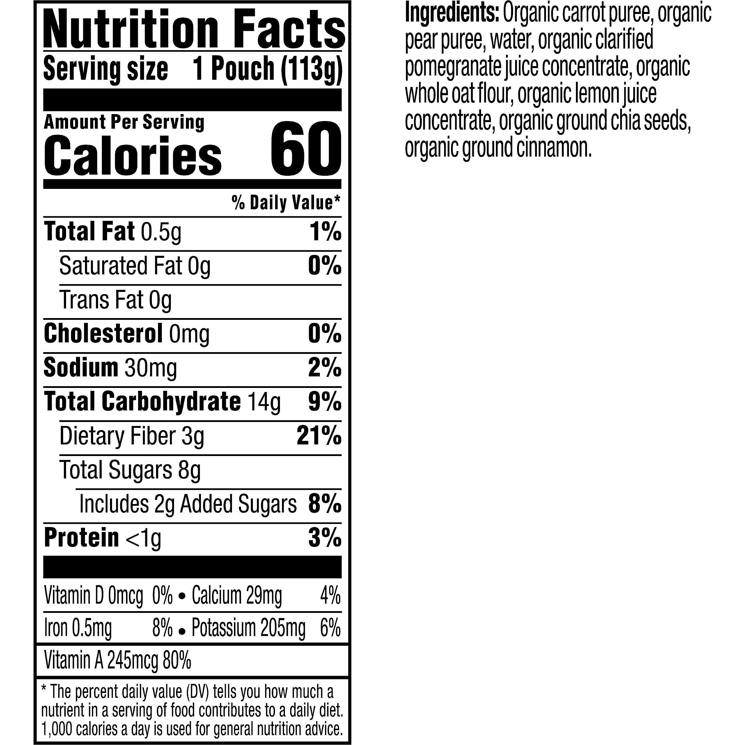 MADE WITH NATURAL FLAVORS: Contains organic carrot puree, organic pear puree, organic clarified pomegranate juice concentrate, organic whole oat flour, organic lemon juice concentrate, organic ground cinnamon, and organic ground chia seeds