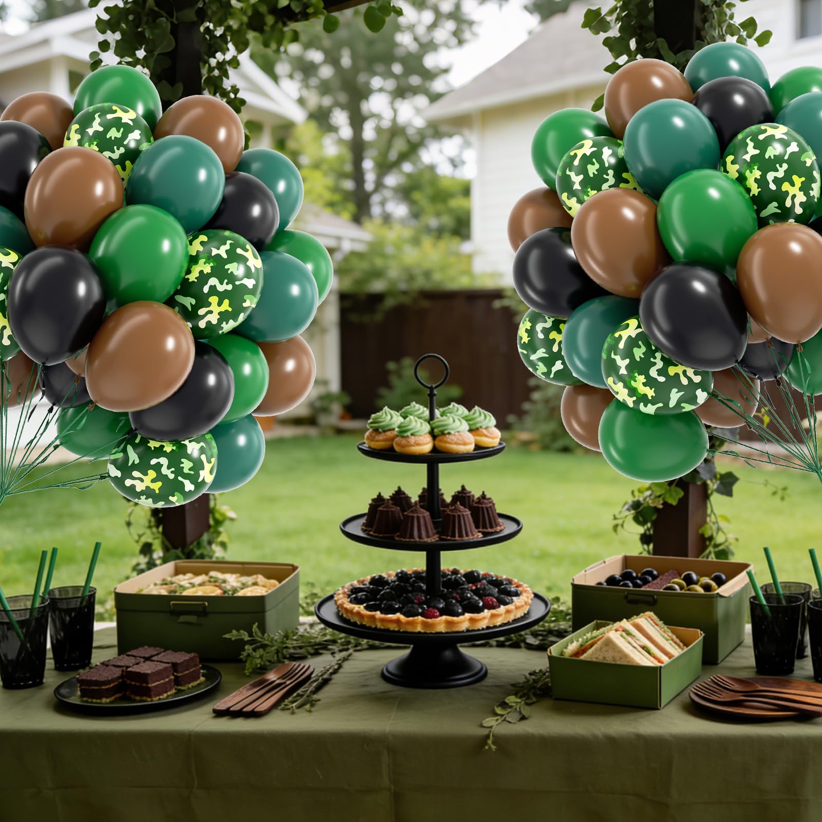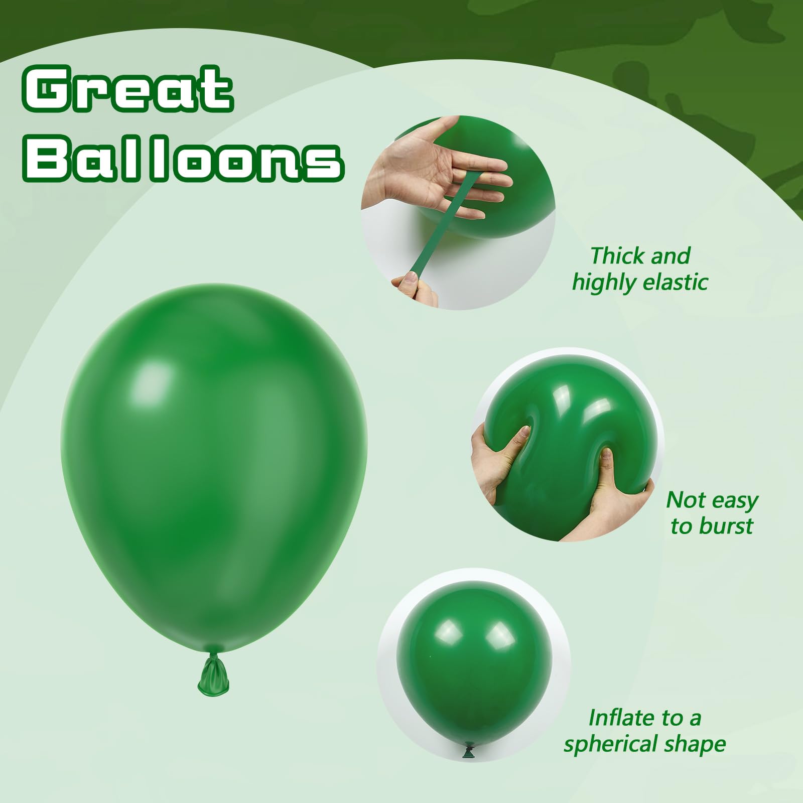 Package Include: The camo balloons include 12inch forest green balloonsx15, 12inch dark green balloonsx10, 12inch brown balloonsx15, 12inch black balloonsx10, 12inch print balloonsx10, glue dotsx20, green ribbonx1