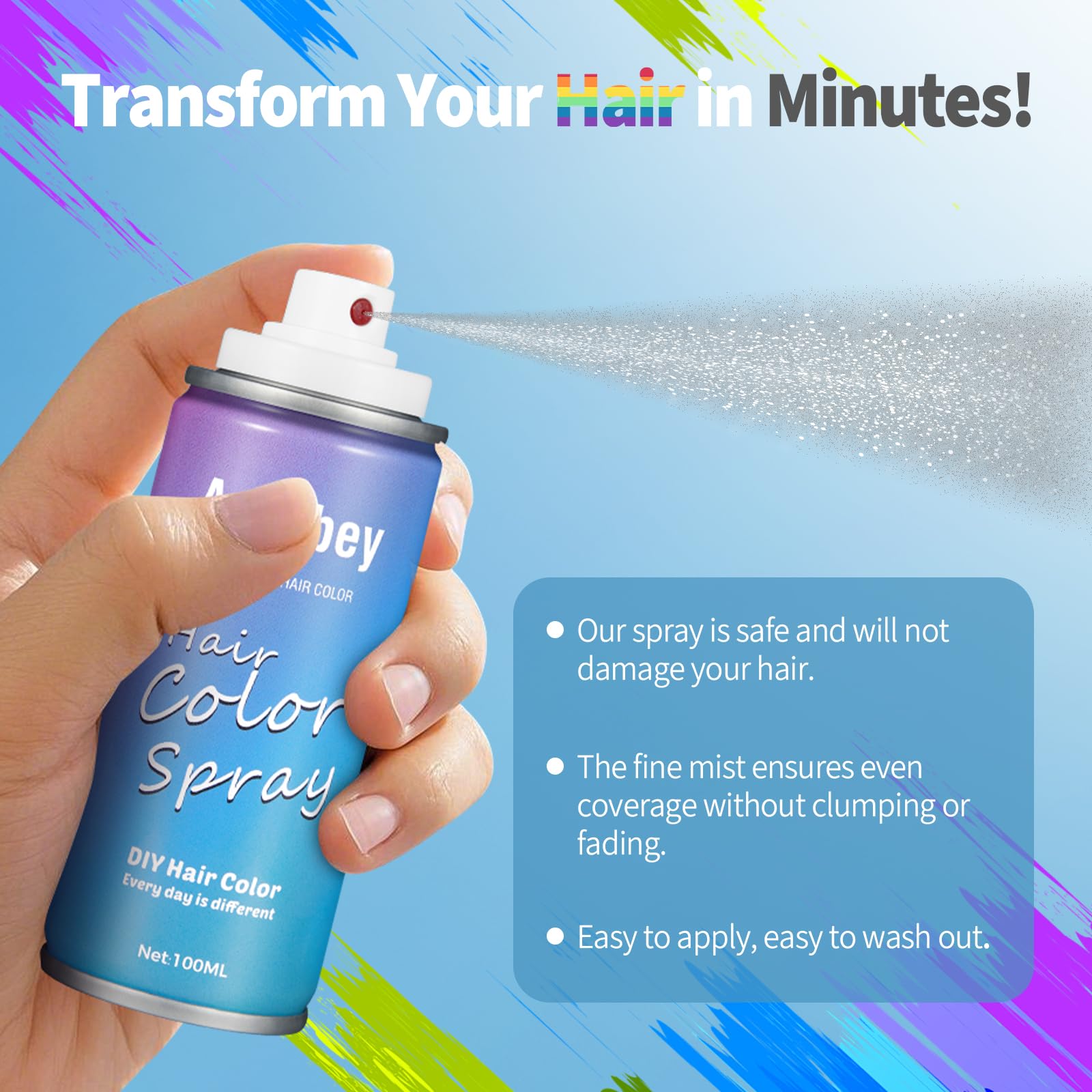Easy Spray-On: Achieve salon-worthy color effortlessly. Simply shake and spray this hair spray directly onto styled hair—no gloves, brushes, or drips. Get even, vibrant coverage in under a minute, perfect for DIY looks.