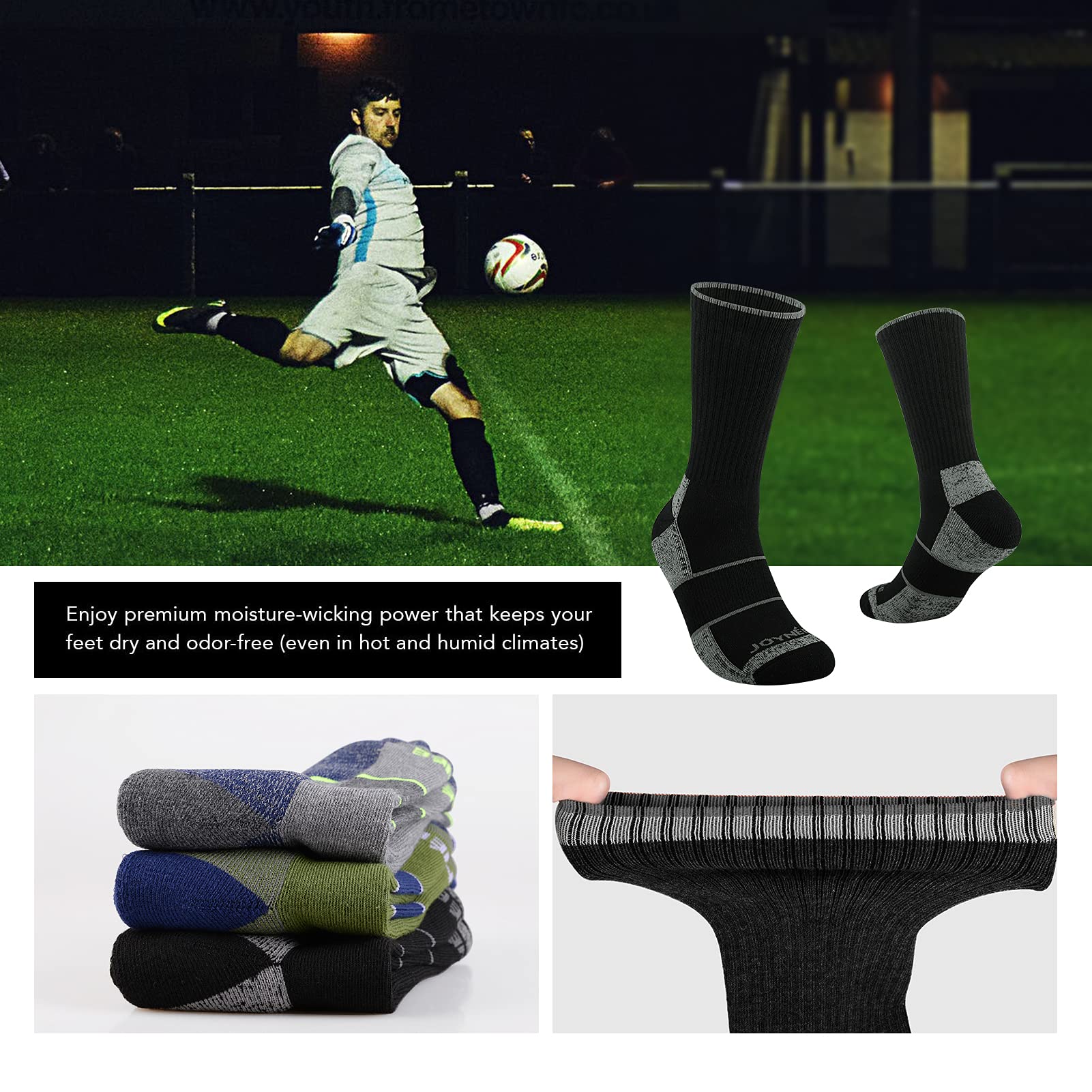 QUALITY MEN'S SOCKS: Made of 95% polyester,5% spandex. Our men's crew socks are strong, durable and breathable enough to keep your skin dry and comfort. We guarantee you will love our mens full cushioned sport socks, well for used as walking, cycling, jogging, running, work out, gym, training, home, casual, tennis, golf, daily wear etc.