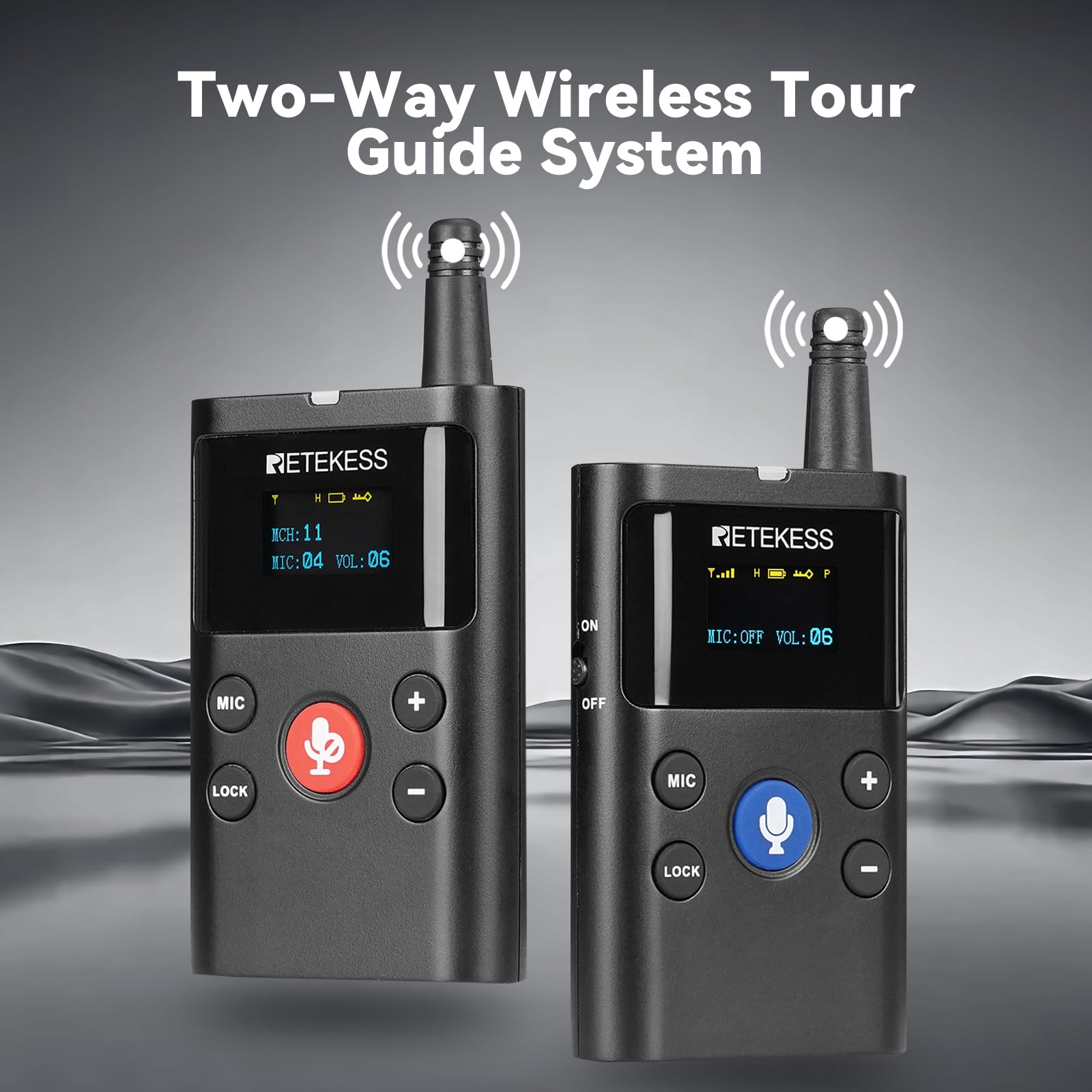 Retekess TT126 two way communication; the transmitter has two modes; one-way explanation and two-way intercom; two-way communication; and supports the receiver to speak