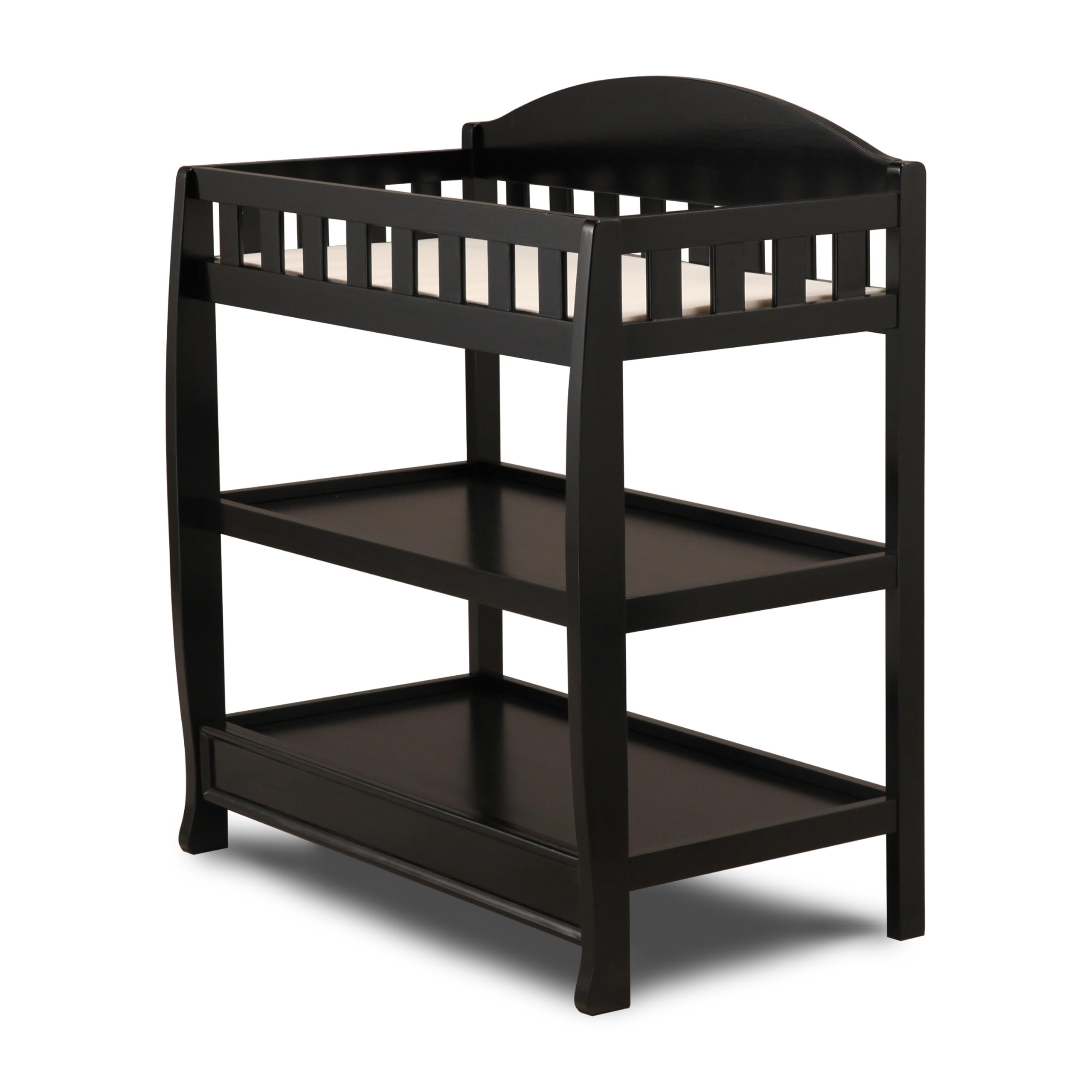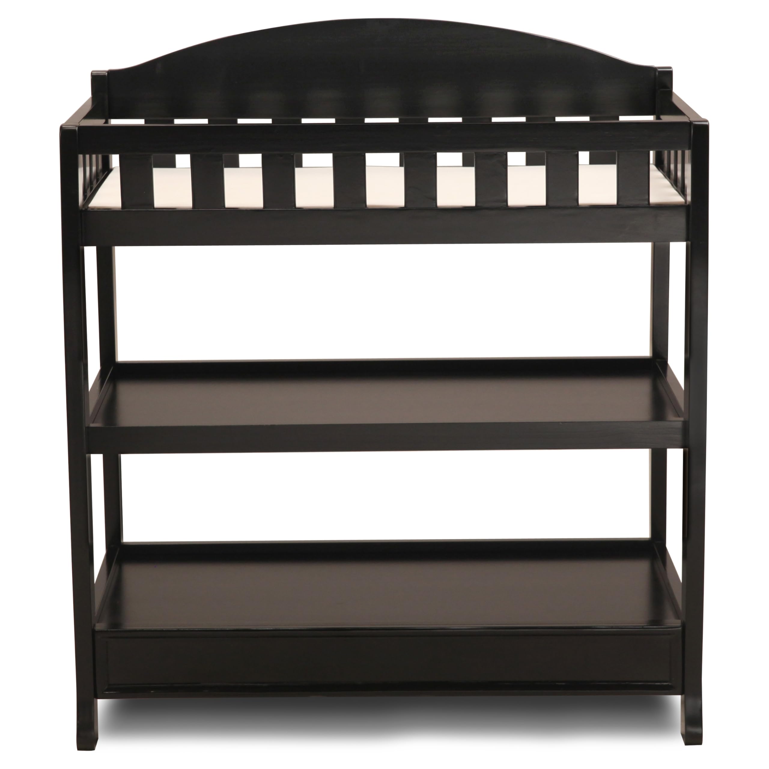 Change or dress your baby in absolute comfort with this Infant Changing Table with Pad by Delta Children. Designed with a timeless bell-shape silhouette and versatile features that make diaper changes easier, this changing table has two shelves that allow you to store your child's changing and dressing necessities nearby. The included changing pad comes with an attached safety strap and is placed in a fully enclosed dressing area that provides extra security. The Infant Changing Table is available in several popular finishes and coordinates with many Delta Children cribs.
