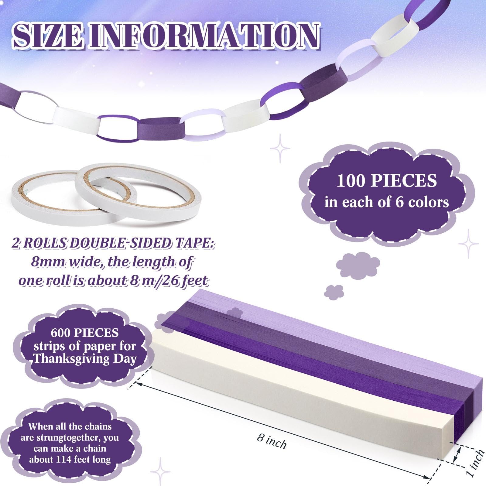 Abundant Quantity and Rich Colors: you will get 2 rolls of double sided tape and 600 pieces of paper chain strips in 4 colors, each color accounts for 150 pieces, which make all the paper chains of about 114 feet long, portable for you to make various handicrafts according to your decorative needs