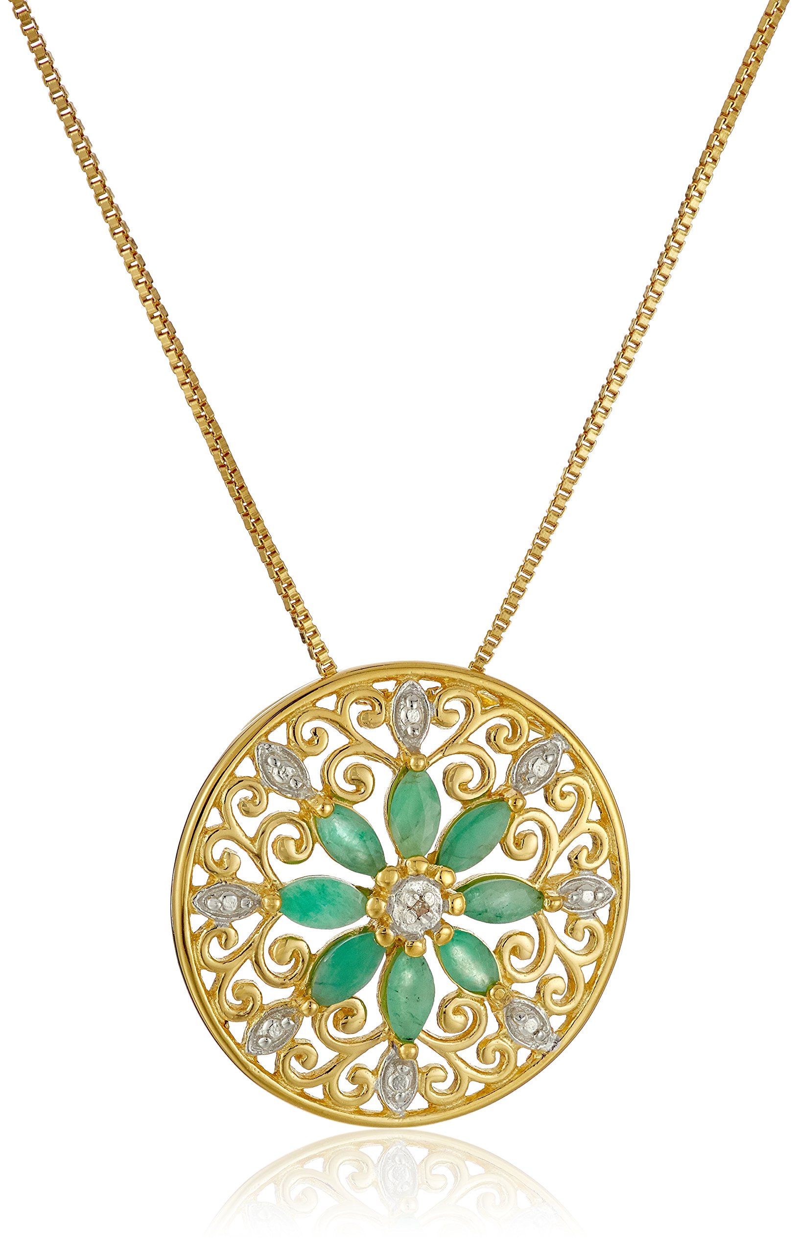 STYLE: Pendant necklace featuring an intricate openwork filigree mandala design with marquise cut genuine emeralds and 0.005 cttw diamond accents