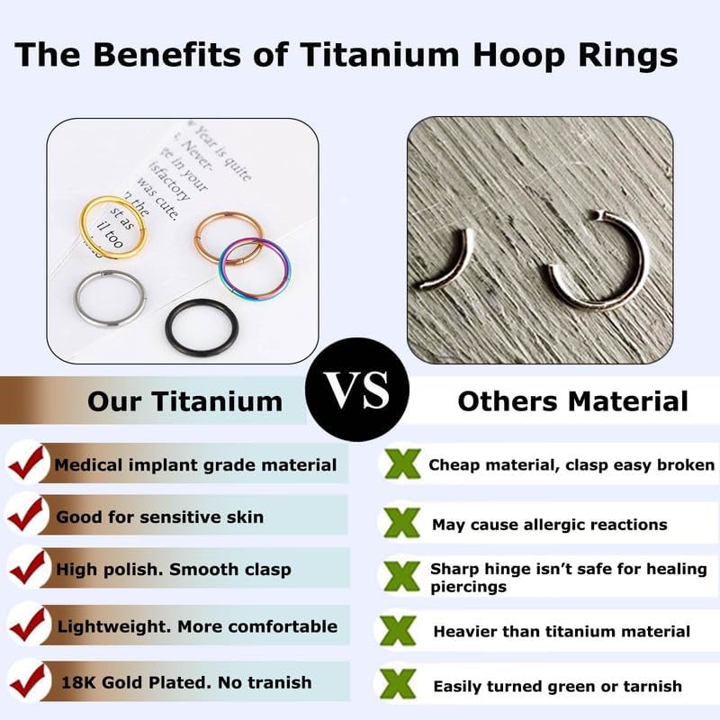 Hypoallergenic Titanium Nose Rings Hoops: Made of Premium ASTM F-136 Implant Grade titanium, lead and nickel free. Titanium nose hoops is more suitable material for very sensitive skin people than 316L surgical steel nose ring, more safe and healthy. What's more, the weight of titanium nose rings are 50% less than stainless steel, more comfortable to wear everyday.