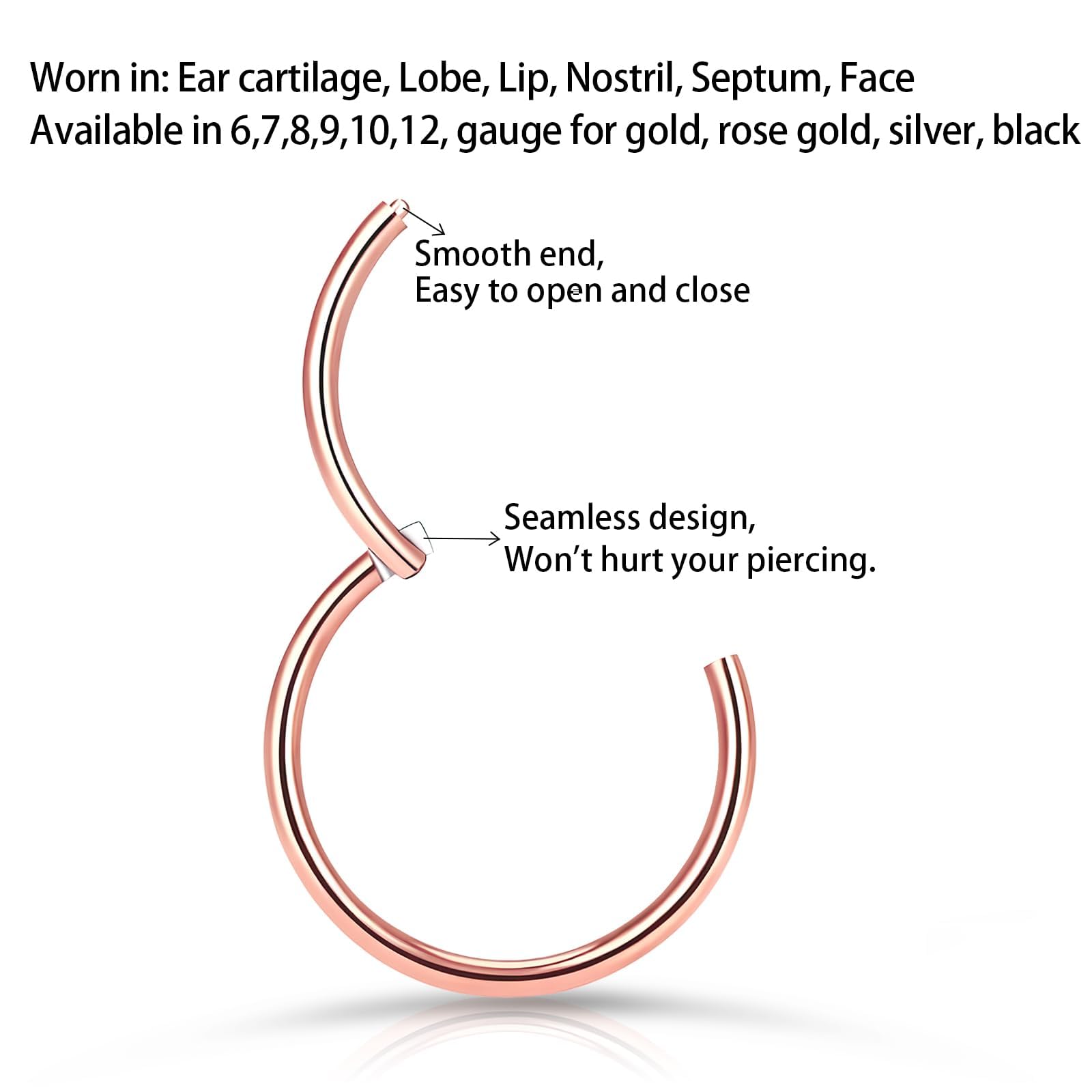 Seamless Hinged Nose Rings: Convenient to open and close the click closure by hand. And it's still tight after long-term use, needn't to worry about lost when working, walking or exercising. Even have a shower because the snaps closed well and won't fall out.
