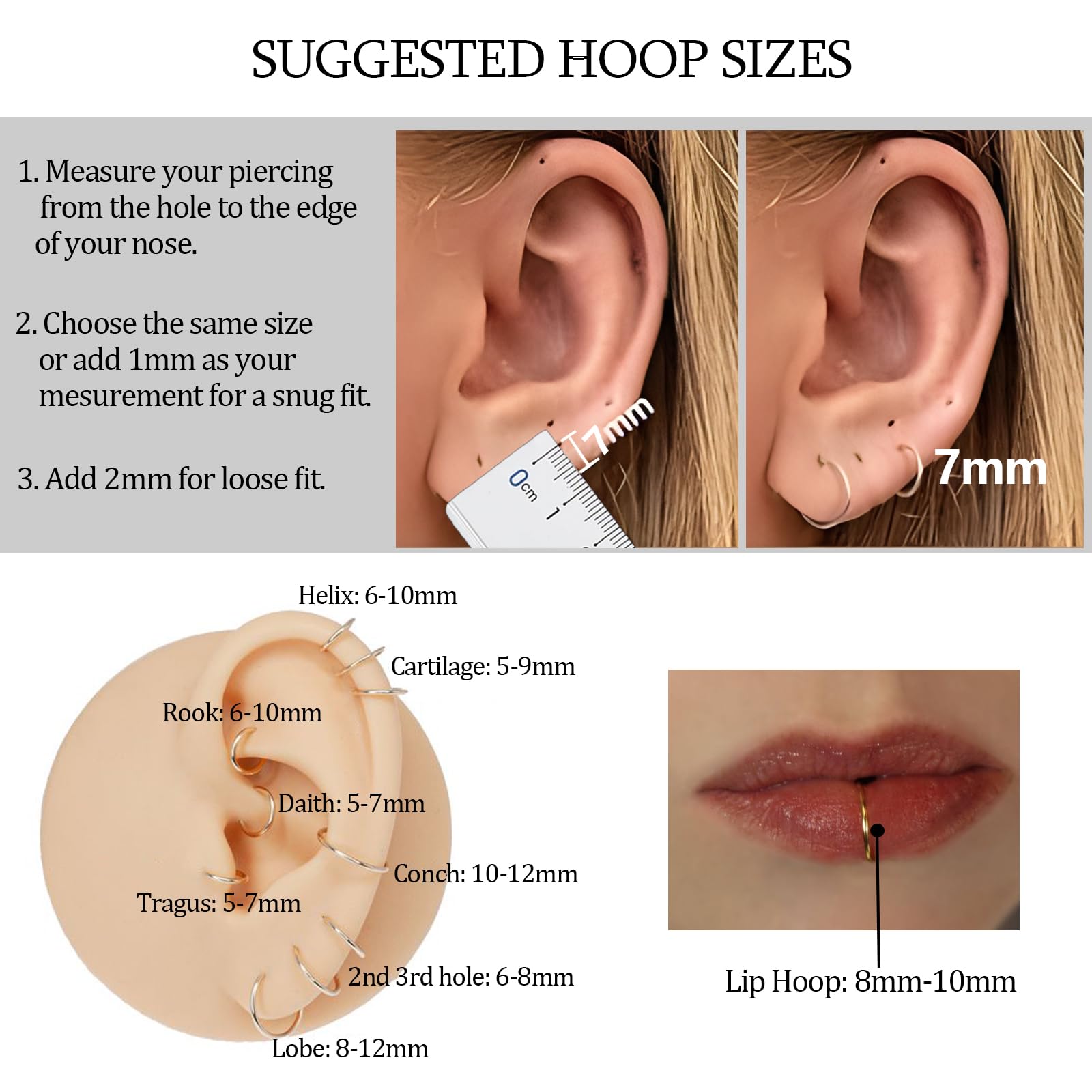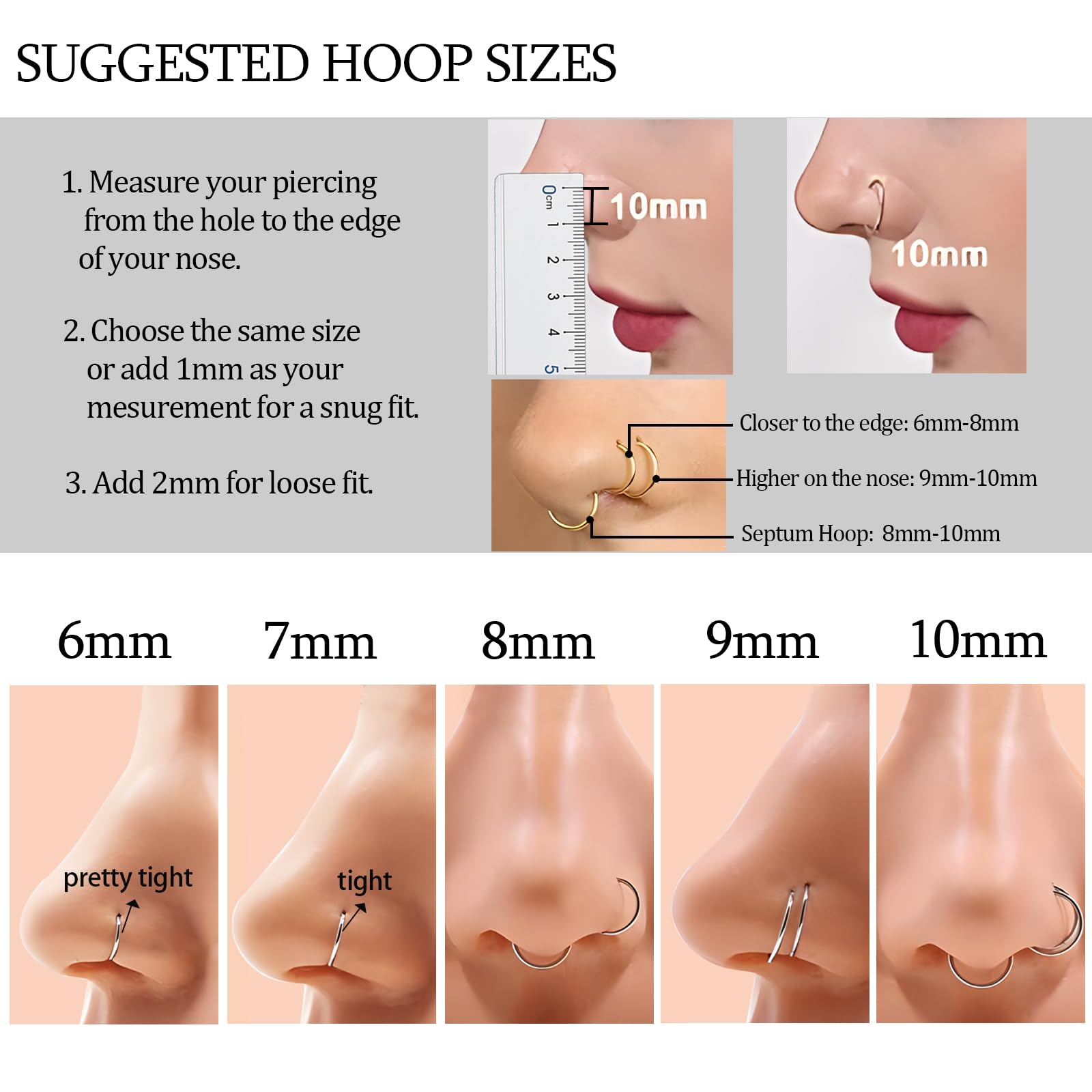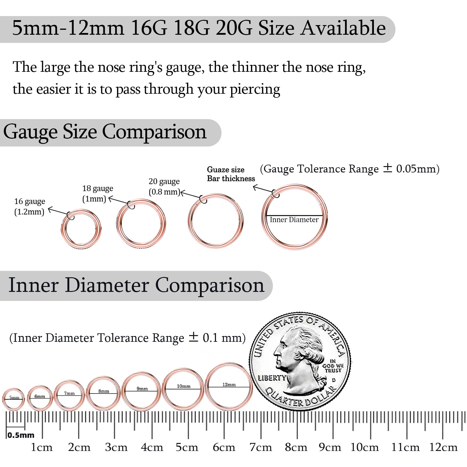 2Pcs 9mm Nose Rings:g (Theg is the size of the piercing hole): 20G=0.8mm thickness. Inner Diameter: 23/64" (9mm). Please choose yourg and diameter hoop for your nose piercing or ear piercing needs.