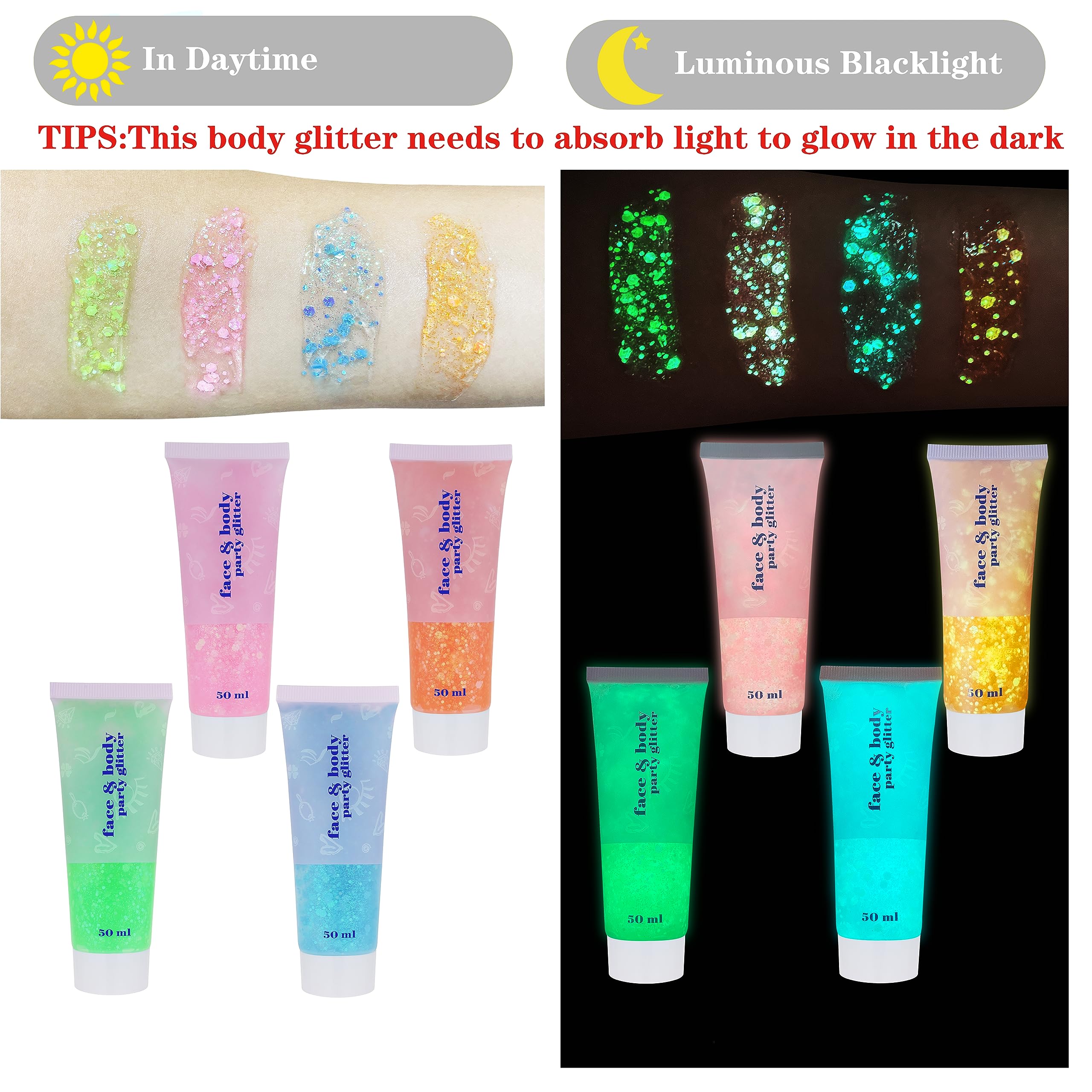 UV Light up Makeup: Our neon body glitter gel is shiny and shimmering,shine so vibrant in the dark,perfect UV blacklight reactive glitter makeup with a lot of different shape in the glitter gel,look amazing under UV,has a glow in the dark effect as well when charged with light and placed in a dark area,giving you a nice glittery finish