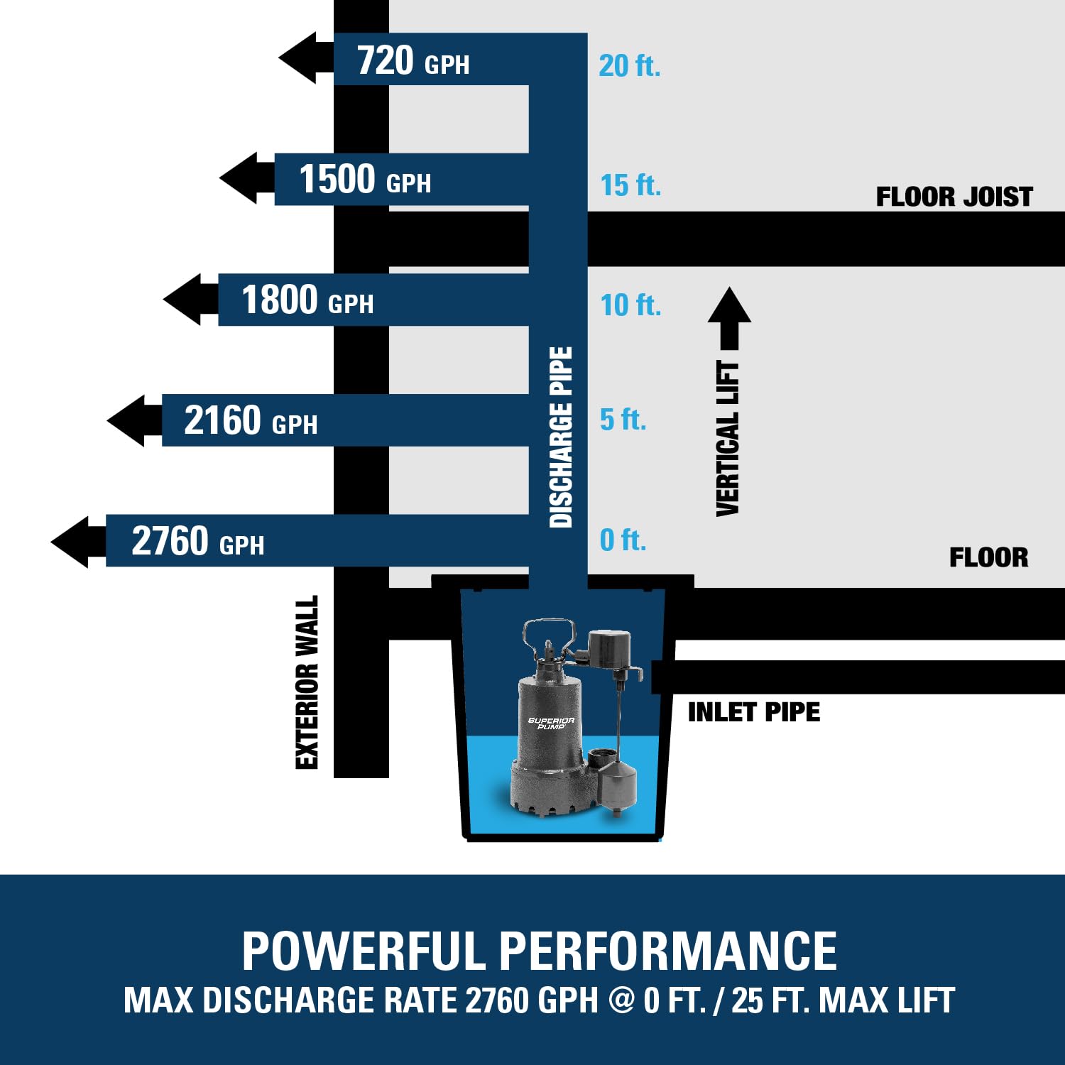 1/3 HP Sump pump moves up to 2,760 gallons per hour; pump will lift water up to 25' of vertical height