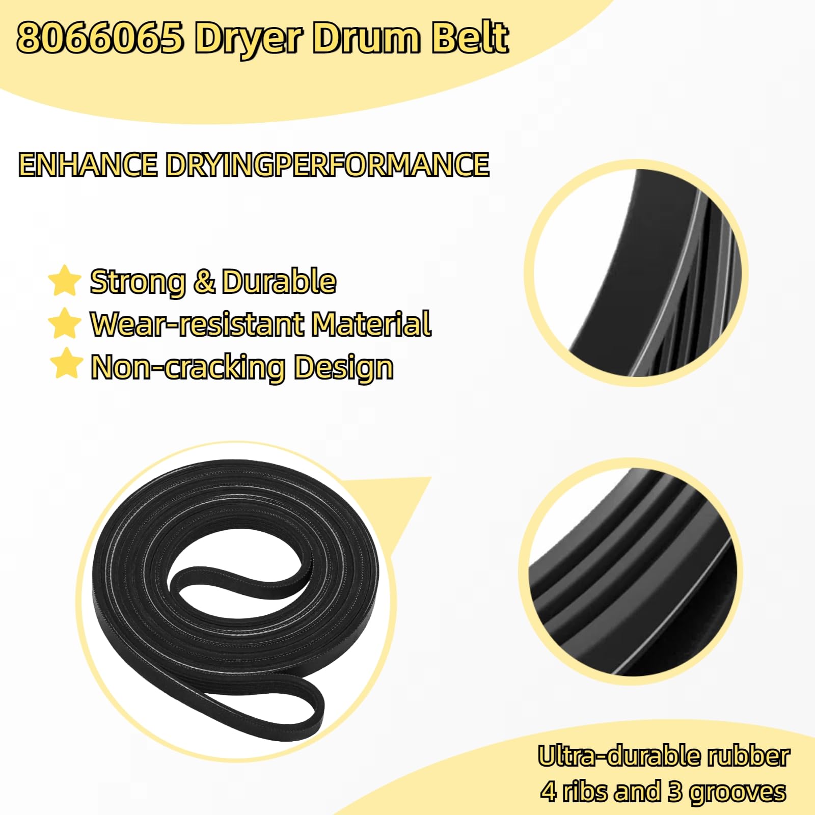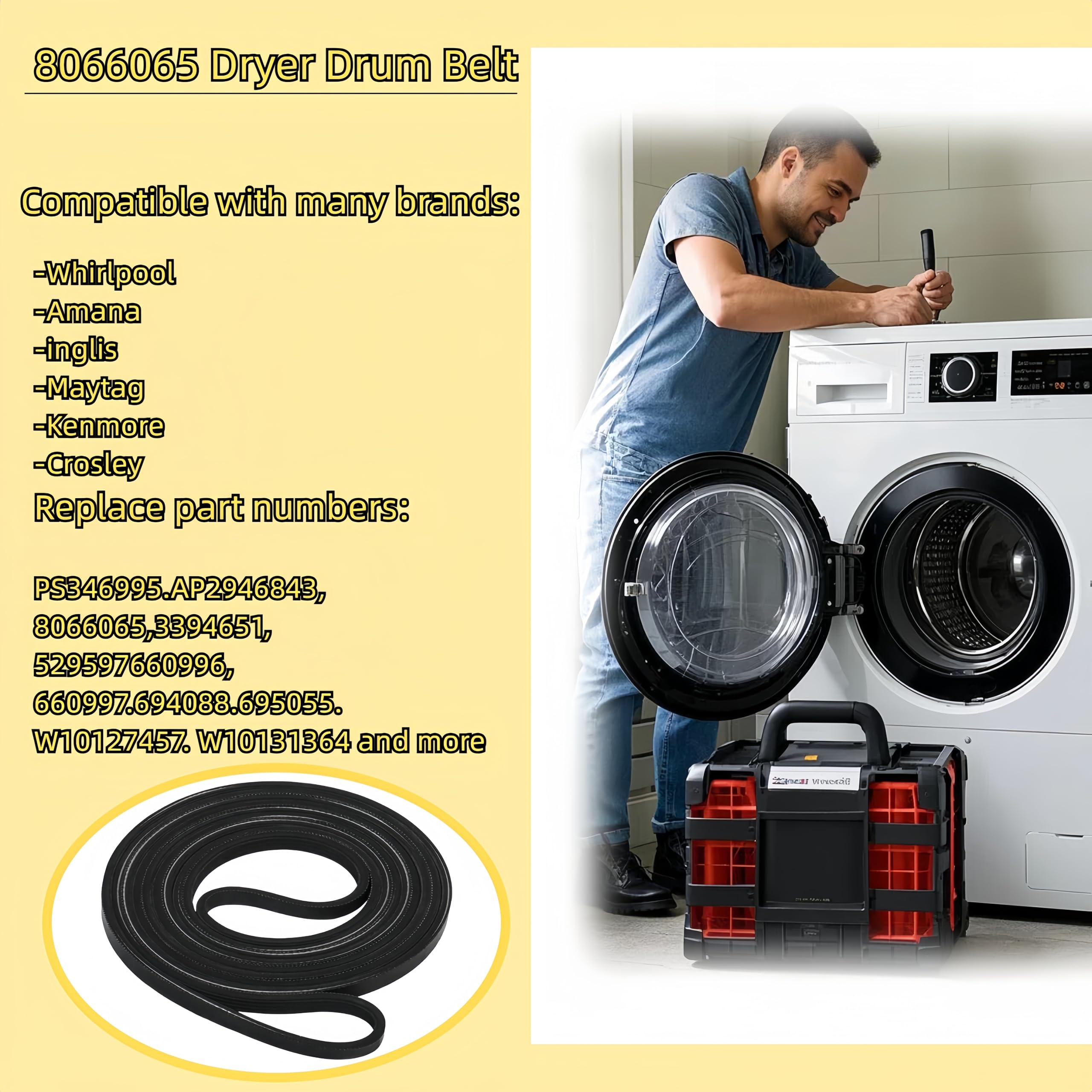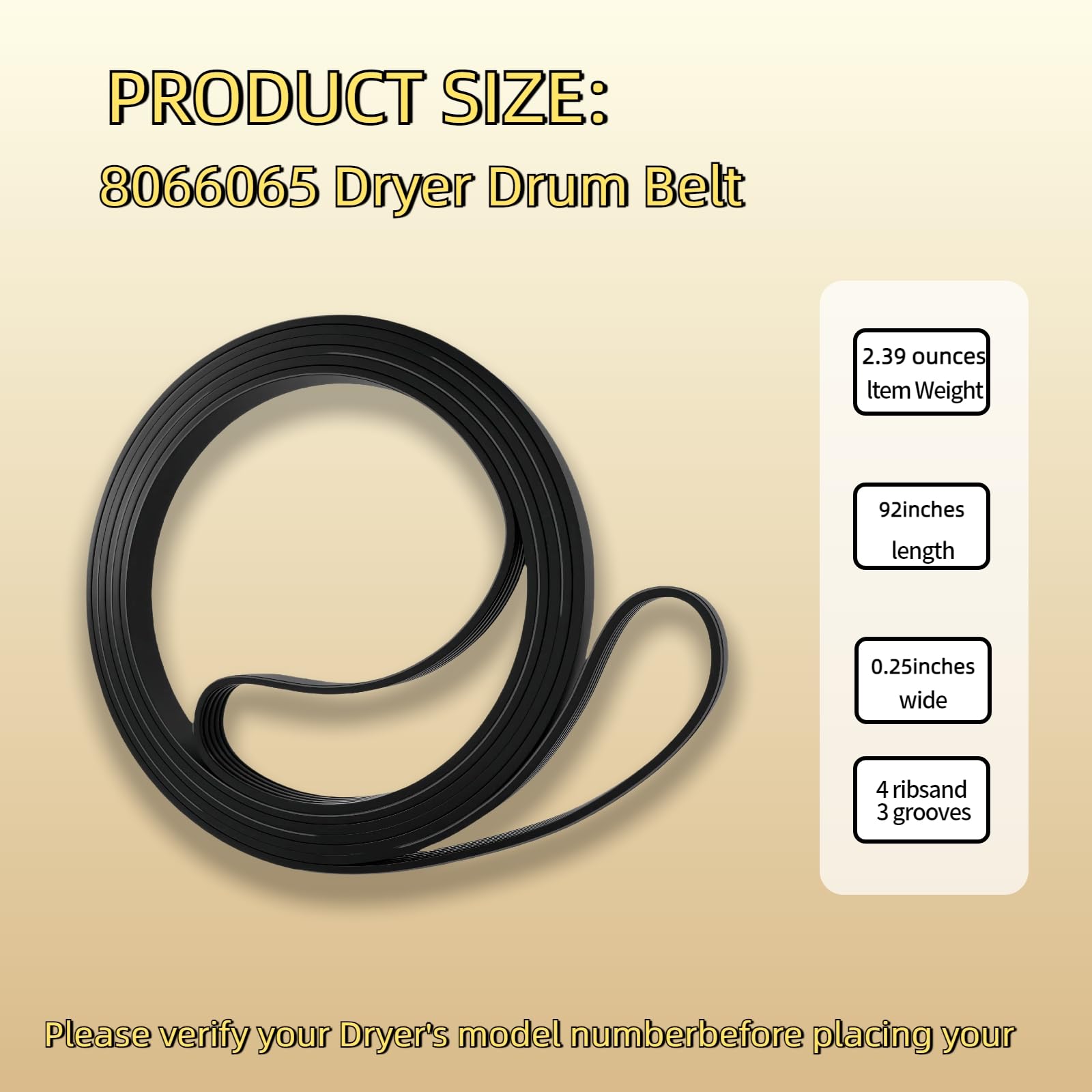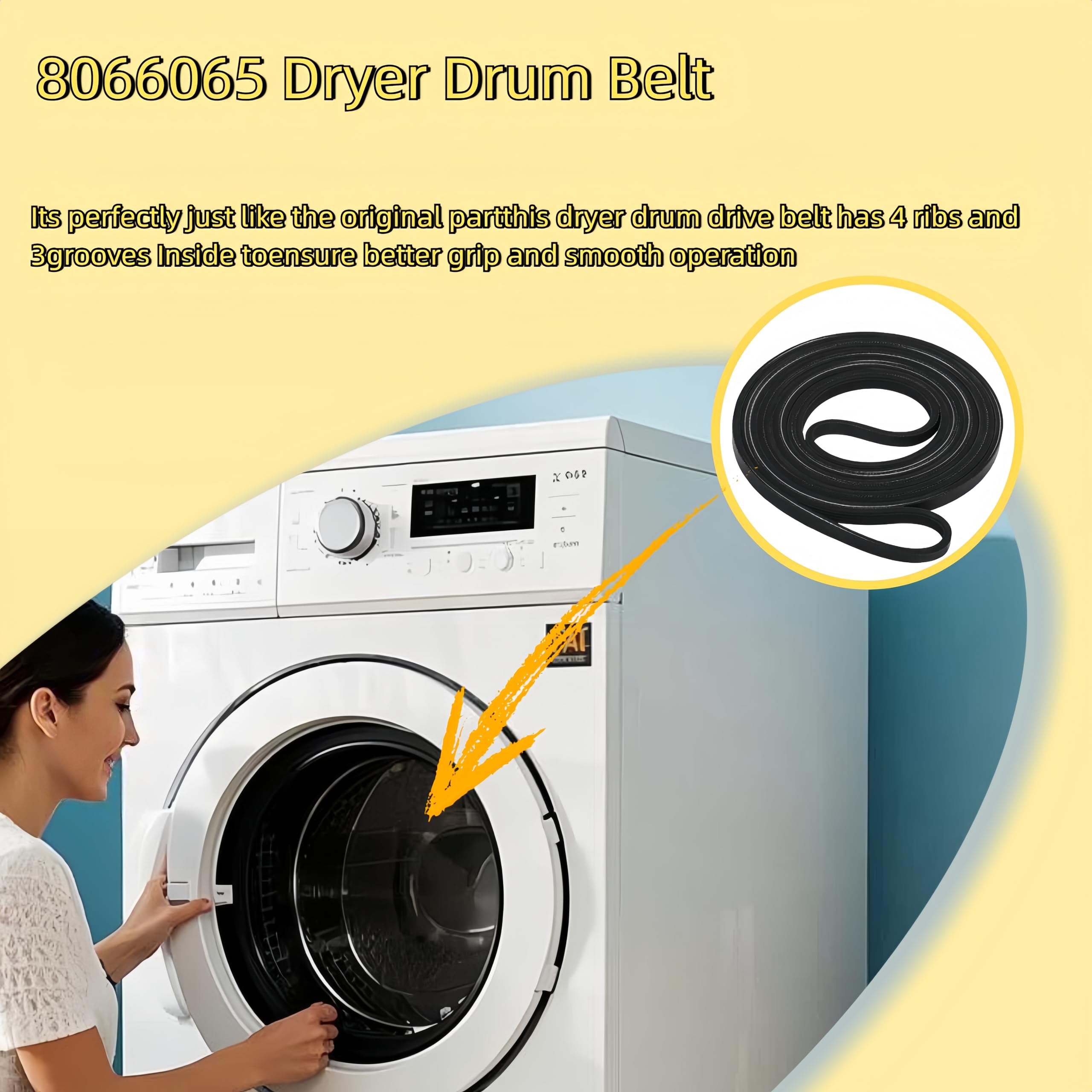 SPECIFICATIONS 8066065 Dryer Drum Belt attaches to the drum, idler pulley, and motor pulley. As the armature of the motor rotates, the belt begins to move and turns the drum. If you notice the drum of your dryer is not spinning during the dry cycle, but you hear the motor running, your belt may have snapped and it will need to be replaced. This belt features four ribs and three grooves, however it replaces a wide variety of belts including wider styles that had five ribs and four grooves. When installing this part make sure the grooves are facing down, against the drum. This replacement part is 92 1/4 inches in length, and 1/4 inch wide. Replaces part numbers: 4210003, 26000341241, 31001026, 31531589, 3389628, 3392665, 3394651, 3399844, 341241, 341241VP, 345473, 349533, 529597, 53-1086, 53-1528, 53-2671, 53-2910, 660996, 660997, 661561, 693306, 694088, 694416, 694868, 695055, 697388, 8066065, 99906951, 99989673, 99989674, AP2946843, FSP341241, P46-037, W10127457, W10131364 Works with most top name brands: Whirlpool, Kenmore, KitchenAid, Roper, Norge, Maytag, Magic Chef, Crosley, Admiral, Estate, Amana, Inglis, Jenn-Air, Hoover Fixes the following symptoms: Will not tumble No heat or not enough heat Will not start Noisy Count on our 8066065 Dryer Drum Belt for an unrivaled mix of durability, convenient functionality, and great value for money. Save your time and money now!