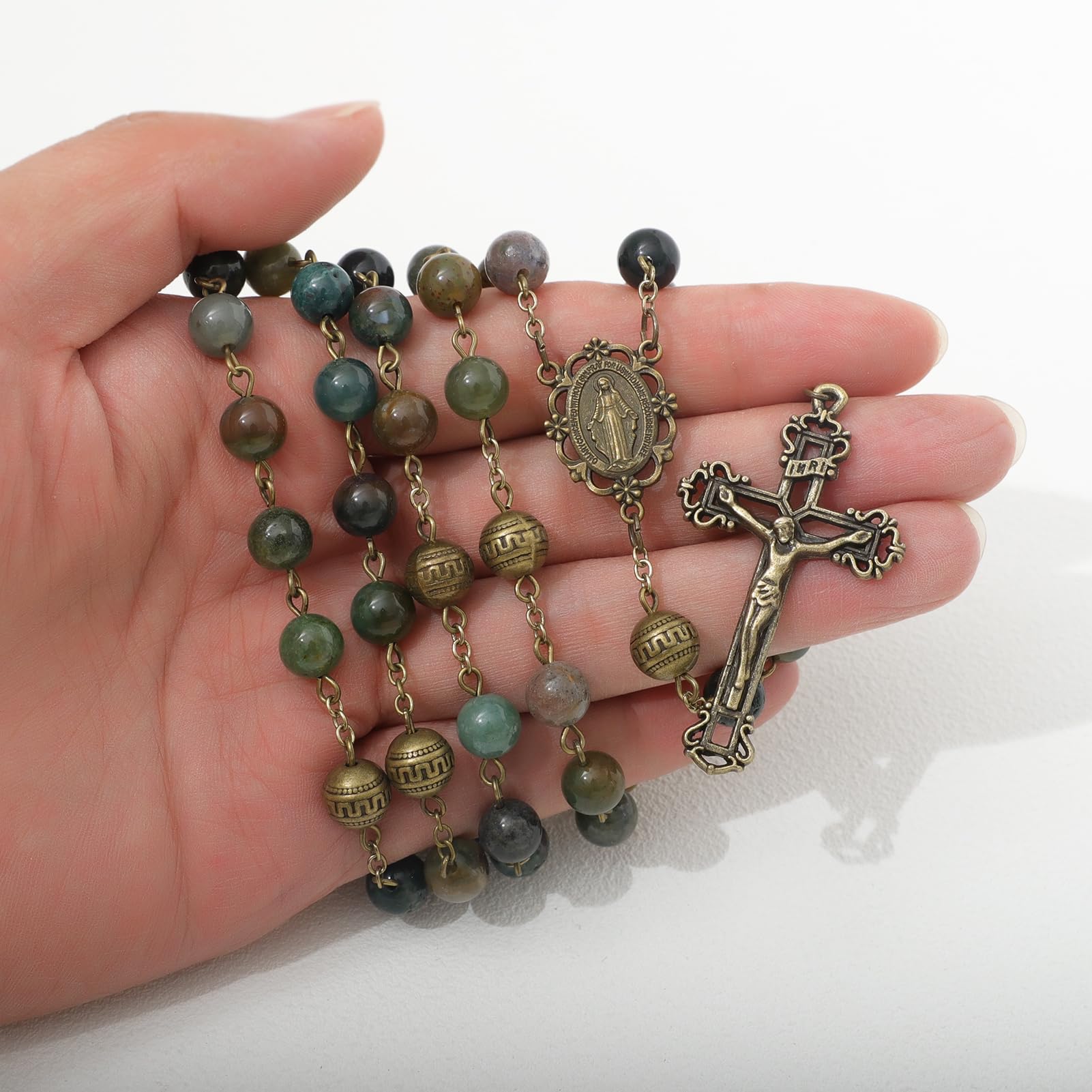 This Catholic rosary exudes a sense of elegance and spirituality; Indian Agate beads is believed to have the effect of enhancing confidence and self-acceptance, increasing focus and insight, thereby promoting efficiency in learning and work