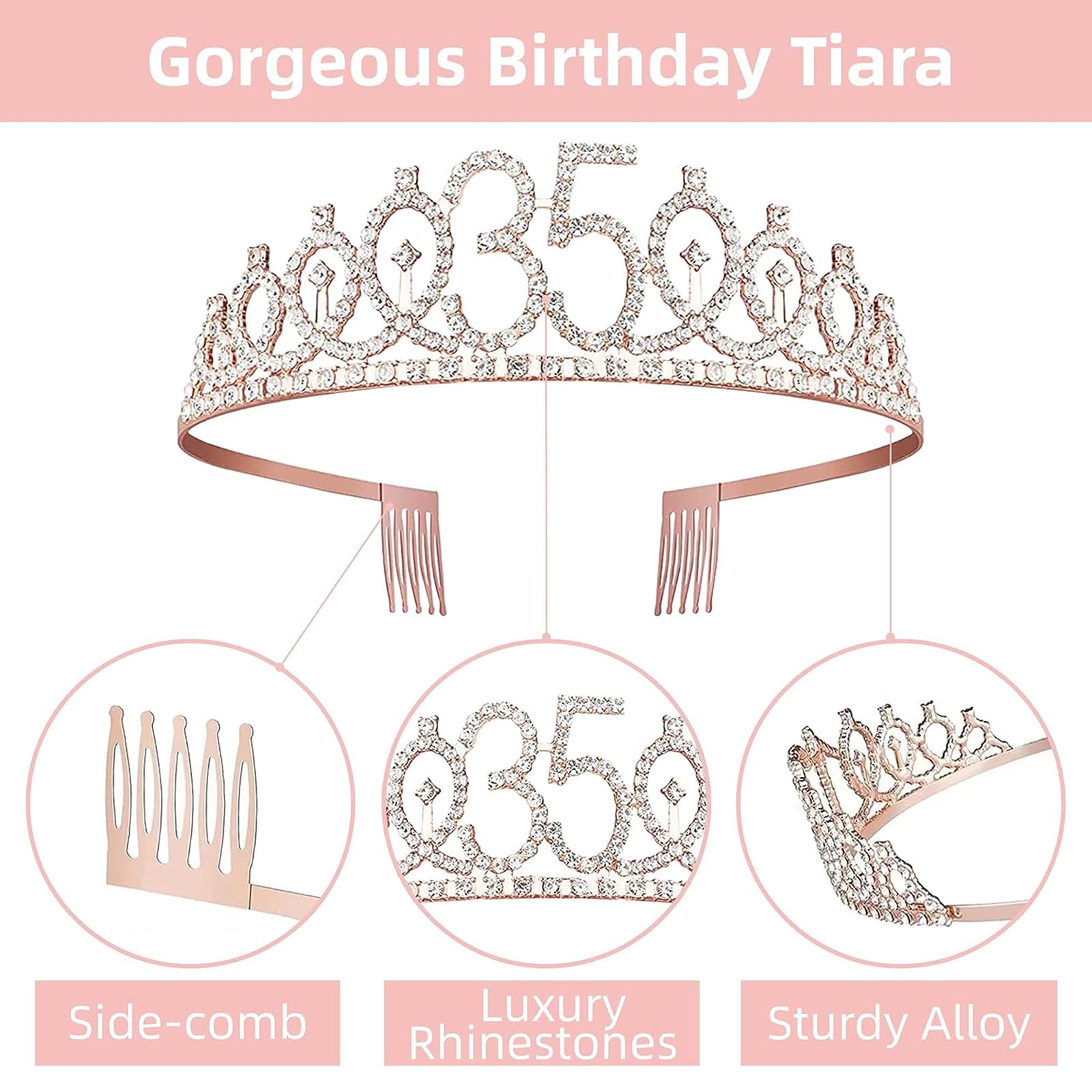 【35th Birthday Tiara】: The 35th birthday crown headband is made of quality alloy and shiny rhinestones, rose gold color highlights elegance. Crown with combs that make sure it can grip the hair more tightly for fitting girls.