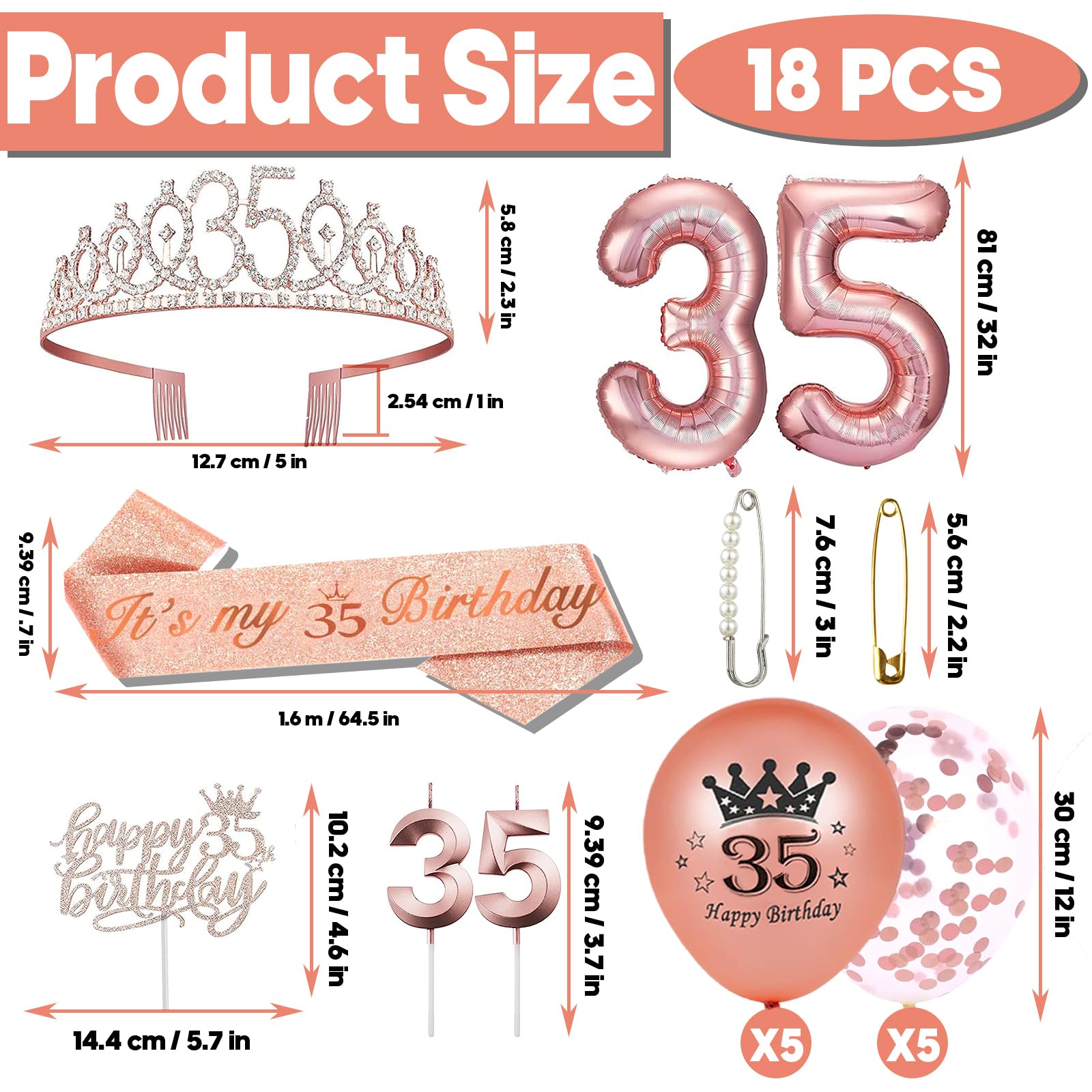 【35th Birthday Decorations】: Package coming with rose gold 35 birthday crown 1pc, 35 birthday sash 1pc, 35th birthday balloons 12pcs, happy 35th birthday cake topper 1pc, 35th birthday candles, This Birthday Gifts for women remind her and everyone in the 35th birthday party how fabulous she is.