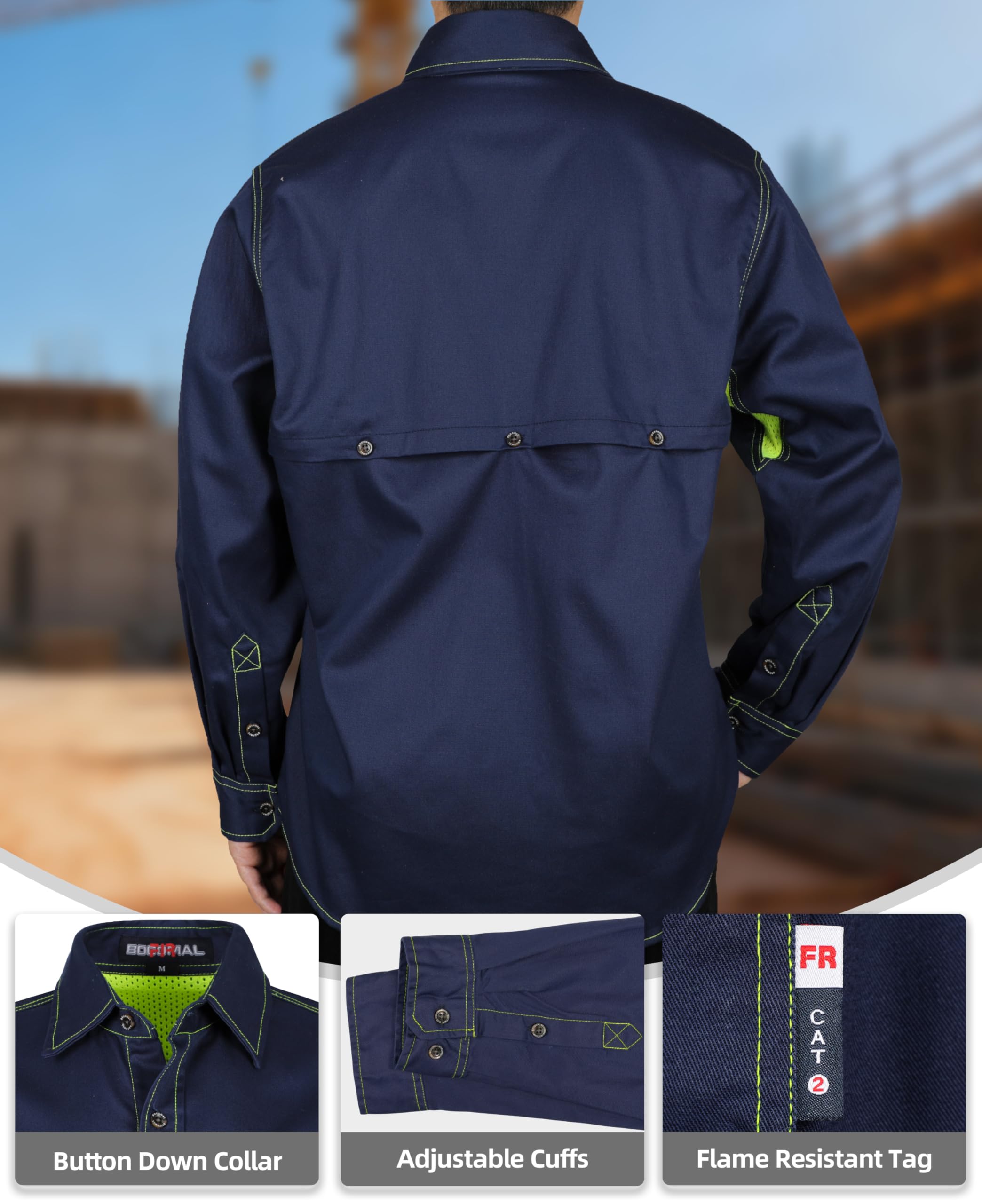 This Men's Flame-Resistant summer work whirt is built for safety and comfort on the job.Designed with breathable Vented mesh panels under the arms and back(button clousure) for better airflow, it keeps you cool during tough tasks in summer hot days.Made from lighgtweight 6.5 oz 100% cotton fabric,Modacrylic/Cotton Blend mesh,it offers reliable flame-resistant protection.The high-visibility yellow contrast mesh and stitching provide added safety in low-light conditions.