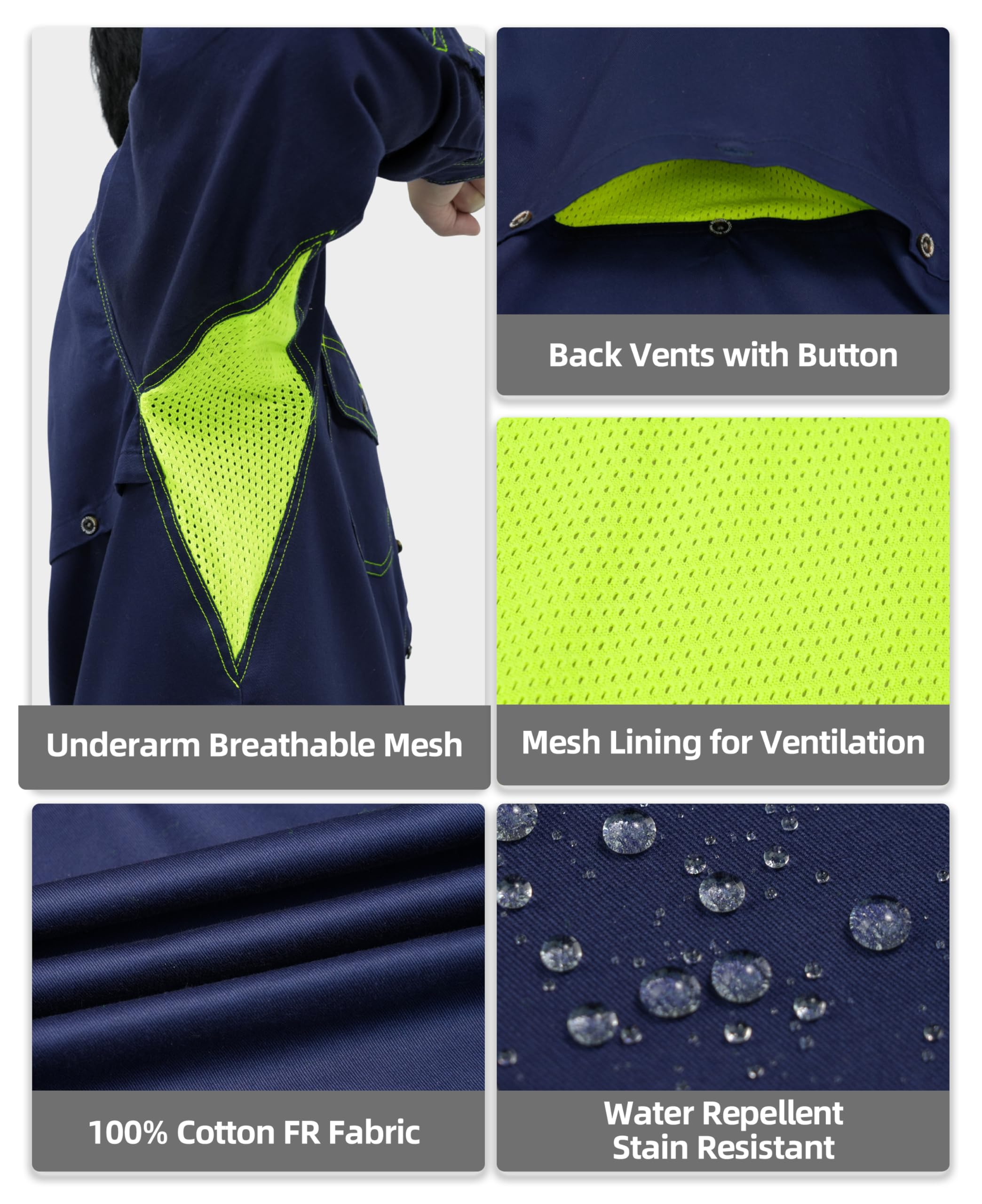 Water and Oil Repellent Finish 6.5oz lightweight cotton twill FR treated,Flame resistant Modacrylic/Cotton Blend mesh.FR buttons,FR aramid sewing threads! clearly FR tag on pocket.Prewashed Preshrunk and Wrinkle-Free.
