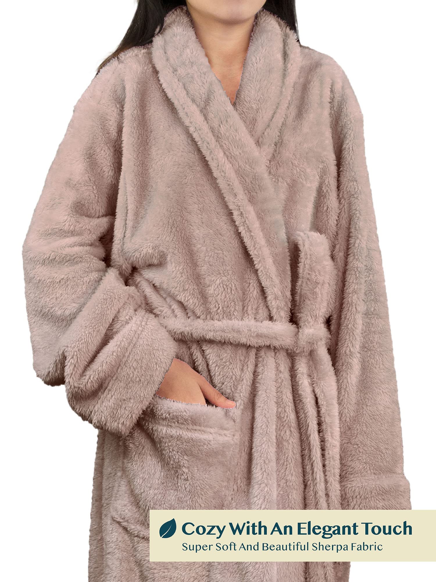 FLUFFY TEDDY SHERPA FLEECE ROBE Our Premium Women Fleece Long Robe is soft on your skin, lightweight, and keeps you warm. We made the robe of fluffy teddy sherpa fabric to make it cozy with an elegant touch!