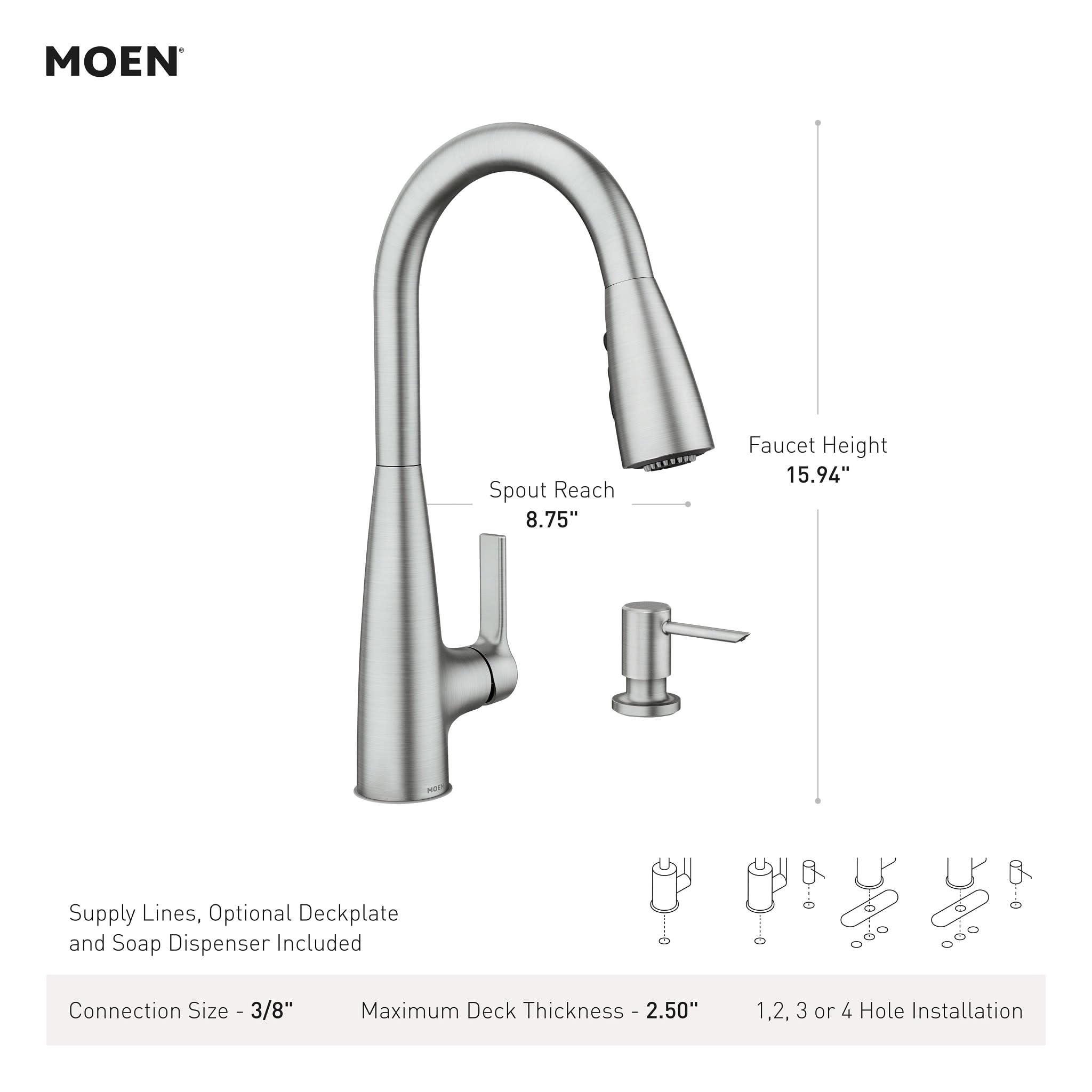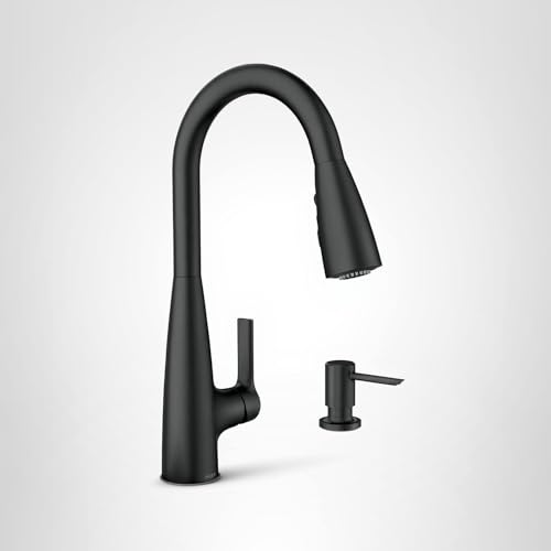 The Moen Haelyn Matte Black Single-Handle Pull-Down Sprayer Kitchen Faucet is a perfect blend of style, functionality, and innovation for your modern kitchen. This kitchen faucet set is designed to elevate your culinary space with its sleek matte black finish, offering a contemporary aesthetic that complements any kitchen decor. The included soap dispenser adds convenience and a cohesive look to your kitchen sink area, making it a must-have for those who appreciate both form and function. Experience the ultimate in kitchen efficiency with the Moen Haelynβs pull-down spray head, featuring Power Boost technology for a faster, more powerful clean. Whether youβre rinsing vegetables, filling pots, or tackling tough grease, this kitchen sink faucet with sprayer delivers exceptional performance with ease. The single-handle design allows for effortless water temperature and flow control, ensuring a seamless and enjoyable user experience every time you step up to the sink. Crafted with durability in mind, the Moen Haelyn kitchen faucet set is built to withstand the rigors of daily use while maintaining its stunning appearance.