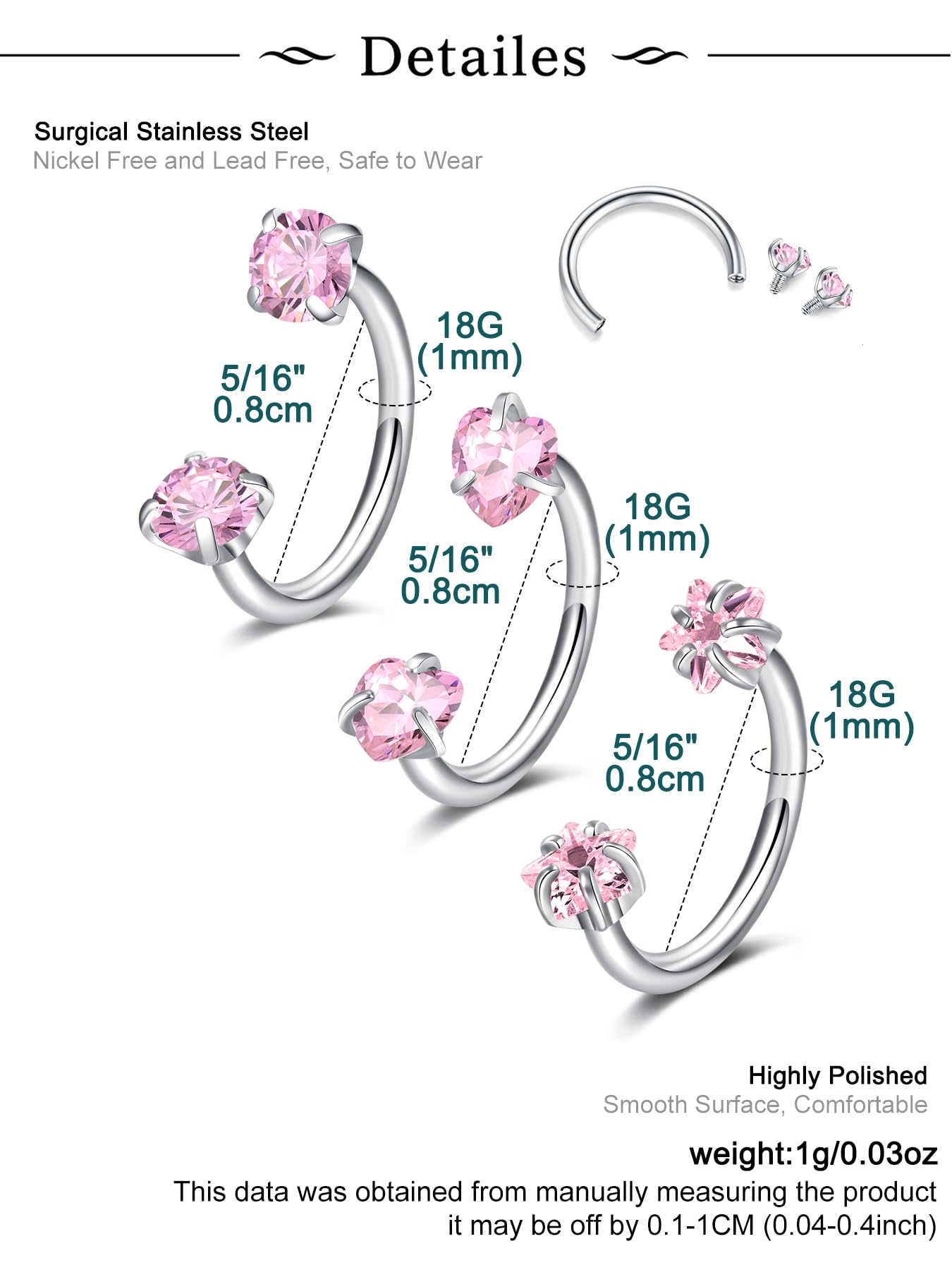 Use - Used as silver double gem horseshoe nose ring hoop 18g horseshoe nose ring half hoop gem nose hoops 18 gauge nose ring hoop 18g half hoop Earring Hoops horseshoe half hoop tragus hoops 18 gauge double gem septum nose ring 18g septum jewelry for women pink nose ring hoop