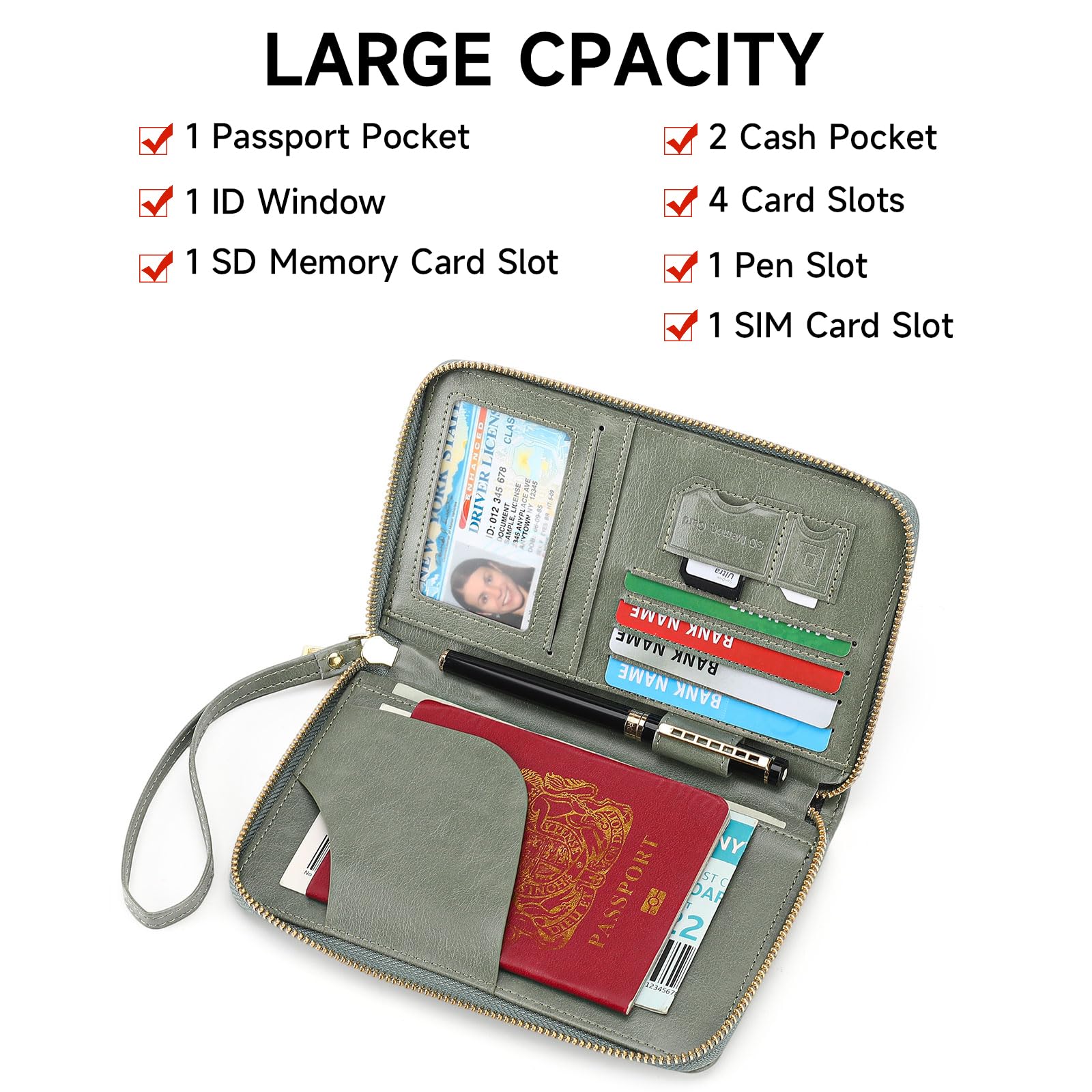 Large Capacity: 2 cash pocket, 1 passport pocket ,4 card slots for your credit card, 1 ID Window, 1 pen slot, 1 SD memory card slot and 1 SIM card slot. Large capacity yet not bulky