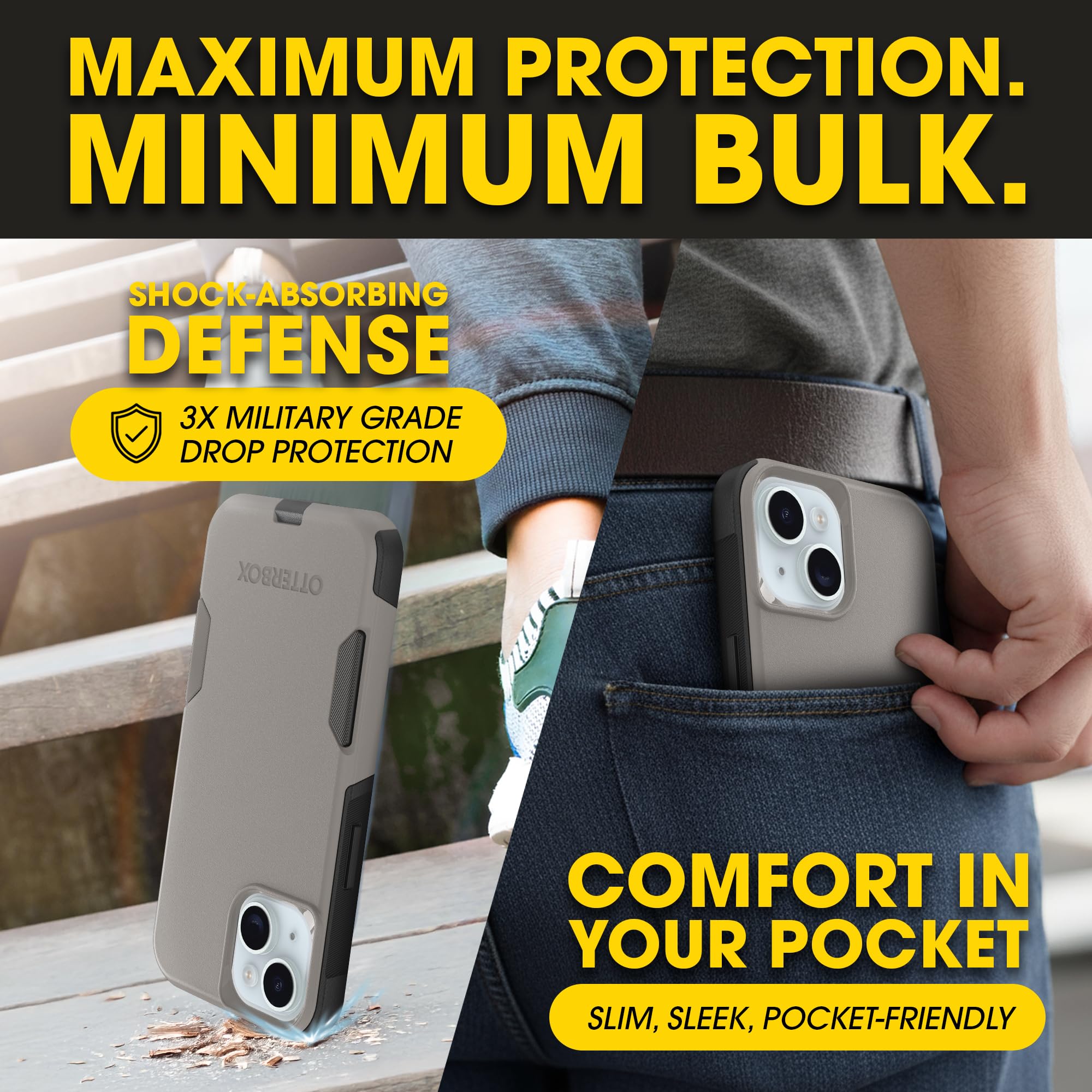 Meet Your Everyday Adventure Partner Your iPhone is more than a device — it's your camera, wallet, GPS, and connection to everything that matters. The OtterBox Commuter Series is engineered for people who demand protection without compromise. Why Commuter Stands Out: 3X Military-Grade DROP+ Testing: Survives 78 drops from 4 feet at multiple angles Dual-Layer Defense System: Shock-absorbing inner silicone paired with a hard polycarbonate outer shell Precision Port Covers: Designed to help keep out dust, dirt, and moisture while opening smoothly with repeated use Wireless Charging Compatible: Works with wireless chargers (no magnets in case) Perfect For: Urban professionals who pocket-carry Parents balancing life and devices Anyone who drops their phone regularly People tired of choosing between protection and style Compatible with iPhone 13 iPhone 14 iPhone 15 iPhone 16e Choose OtterBox. Choose confidence. Choose protection that works when it matters most.