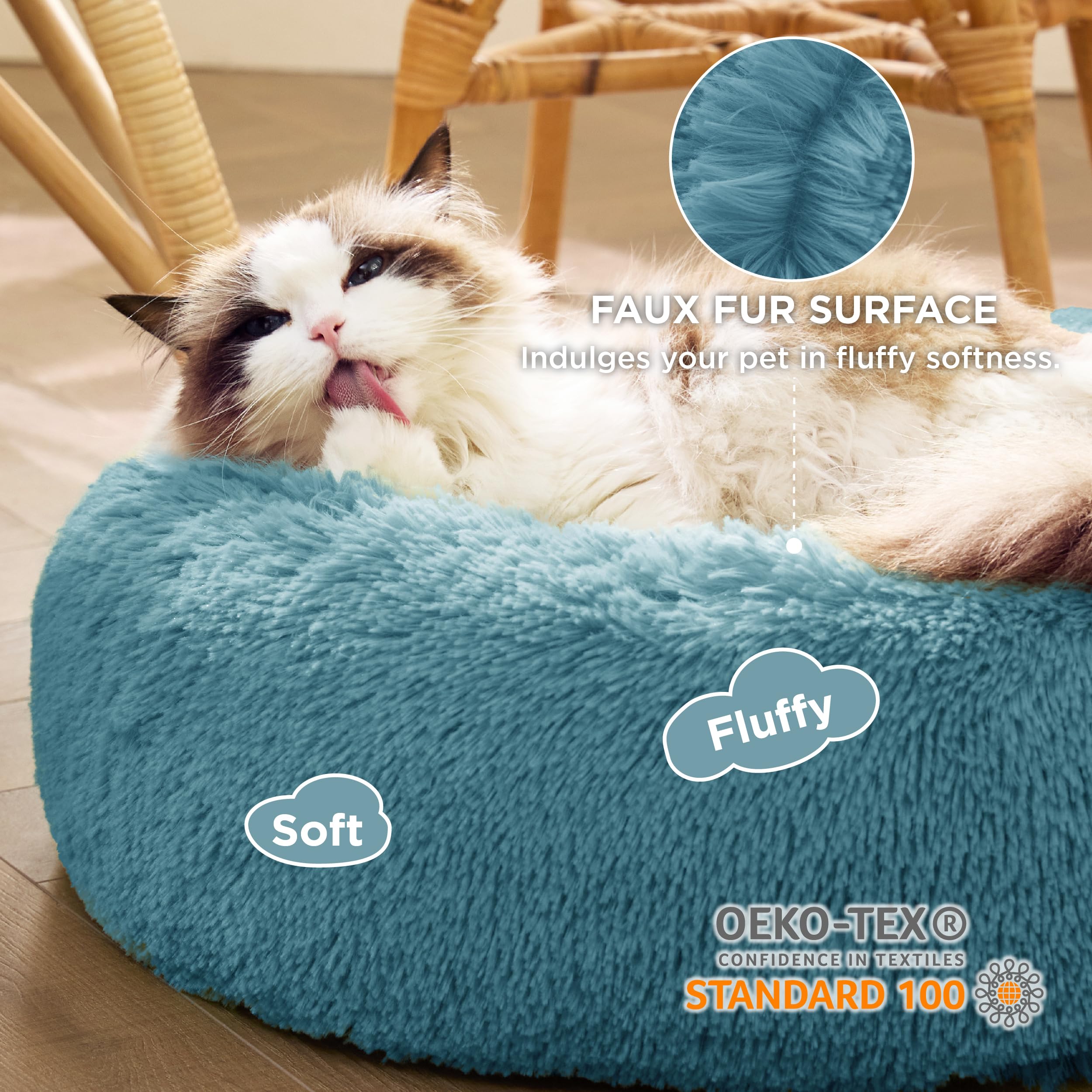 Pet-Safe & Thoughtful Details:Crafted with Standard 100 by OEKO-TEX(24.HCN.46956) certified materials, this calming dog bed is made from tested-safe fabrics gentle on pets. The sturdy, non-slip base keeps the round pet bed in place, so your furry friend can hop in and out with comfort.