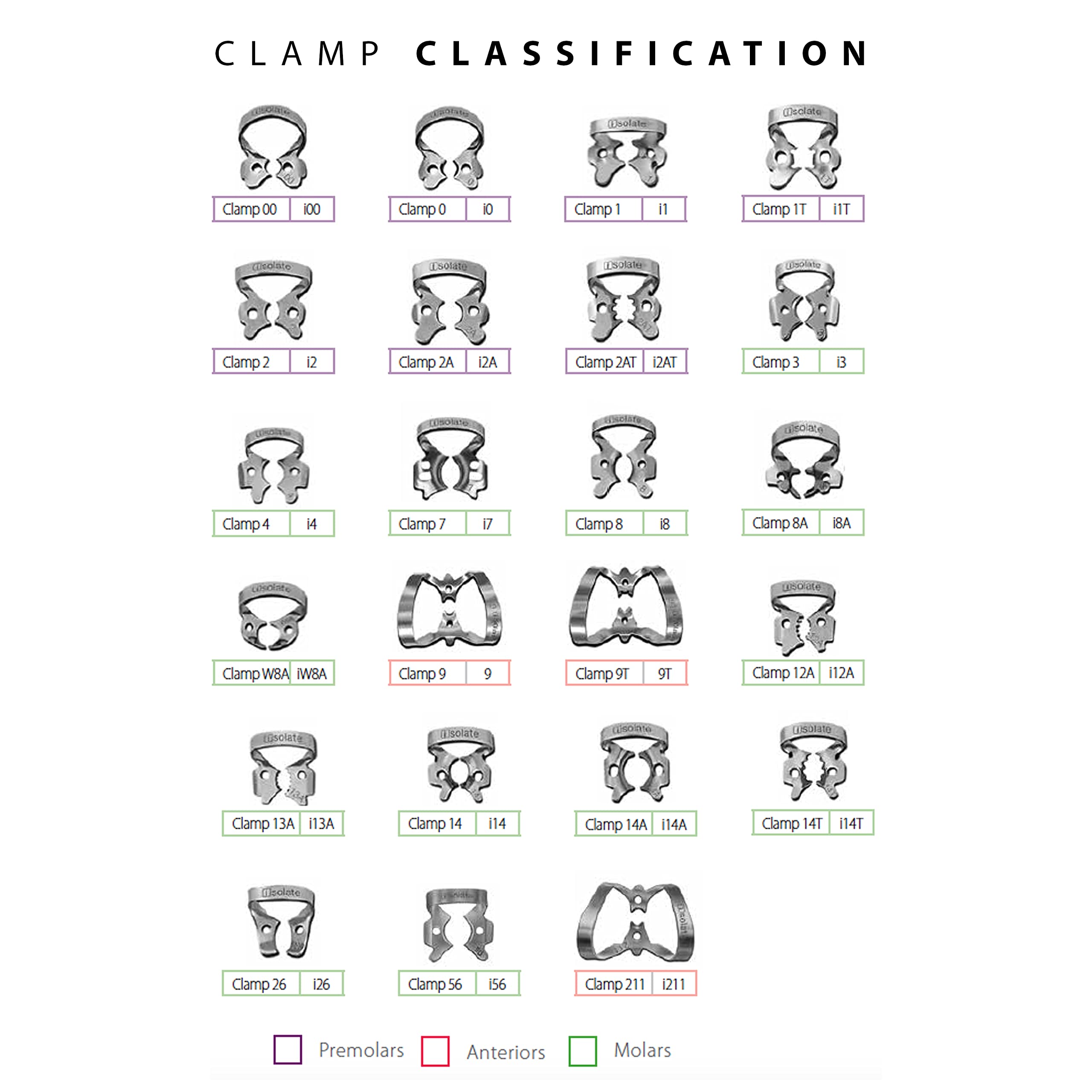 RUBBER DAM CLAMPS: Kit contains 14 Rubber Dam Clamps (# - 00 - 0 - 1 - 2 - 2A - 7 - 8 - 8A - 9 - 13A - 14 - 14A - 212 - 202) to ensure secure fit and lasting memory during dental procedures.
