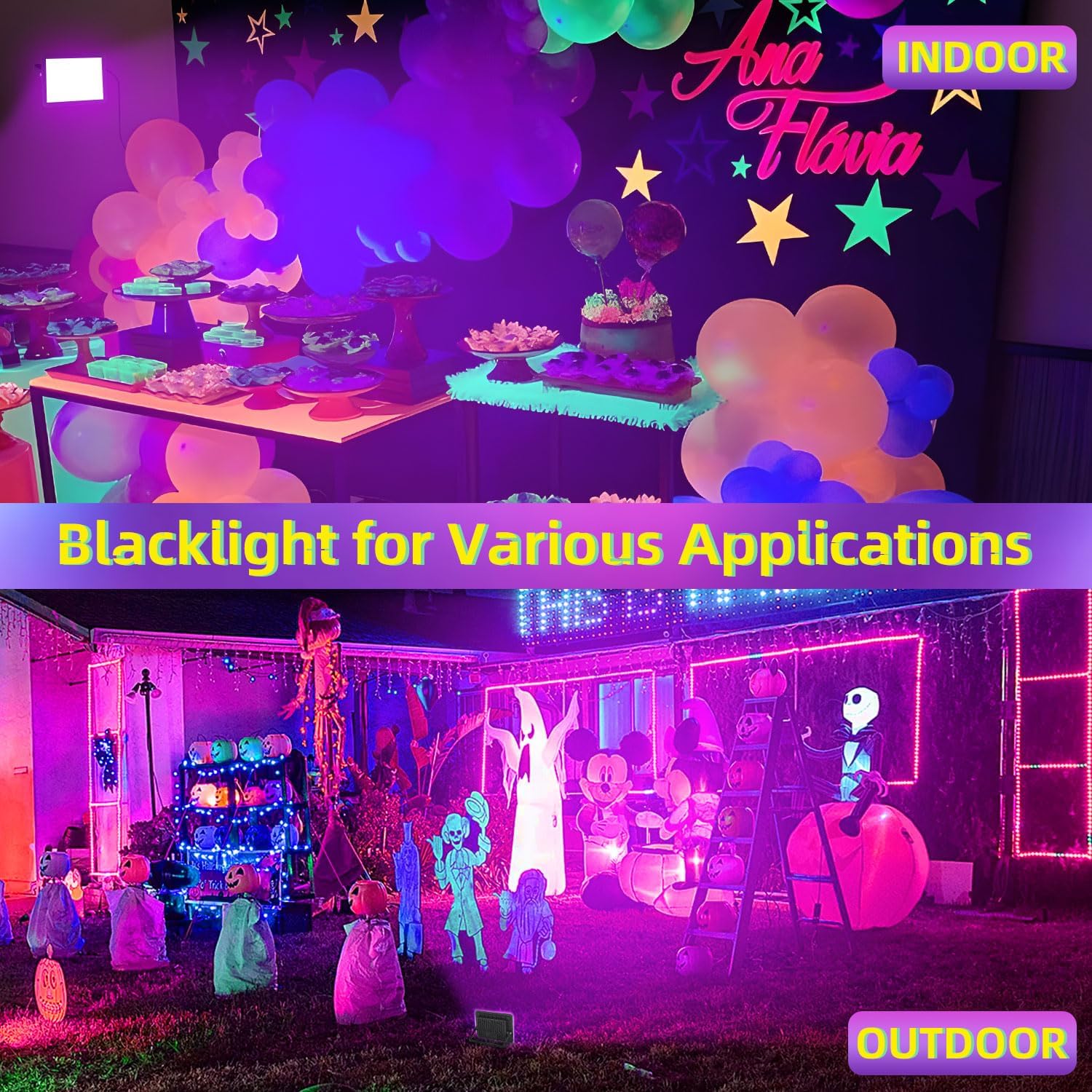 IP66 Waterproof for Wide Applications: IP66 waterproof rating, the outdoor black light can work in rain and snow, suitable for outdoor and indoor use. Great for outdoor Halloween decor, yard, porch, haunted houses, gymnasiums, classroom, bedroom, game room, etc. Works great for body paint, fluorescent posters, neon glow in the dark night, birthday party, dance party, etc. Easy to make a colorful and vibrant atmosphere! (Note: The plug is not waterproof)