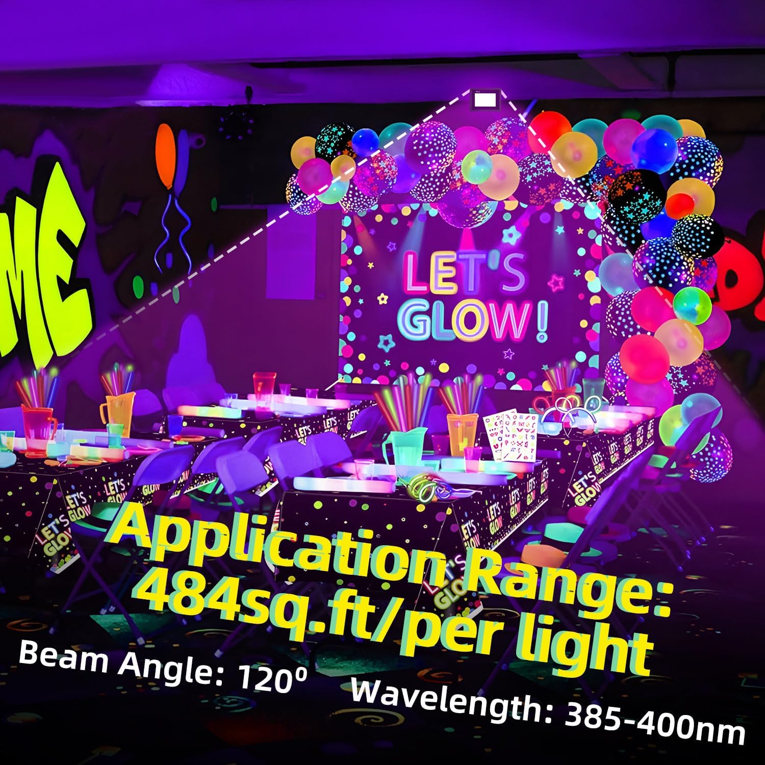 Excellent Fluorescent Effect Black Light: Equipped with 50 premium LEDs for creating excellent fluorescent effect, this LED blacklight is suitable for use in party, bedrooms, game rooms, and classrooms. Wavelength 385-400nm, safe for human body and eyes. Good for working with most reactive pigments, dyes, paints and neon-colored objects