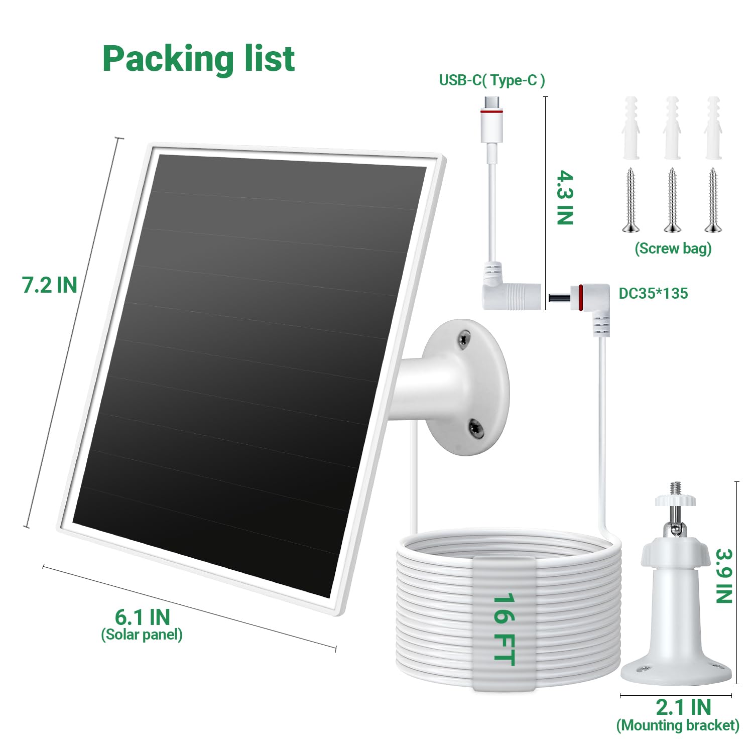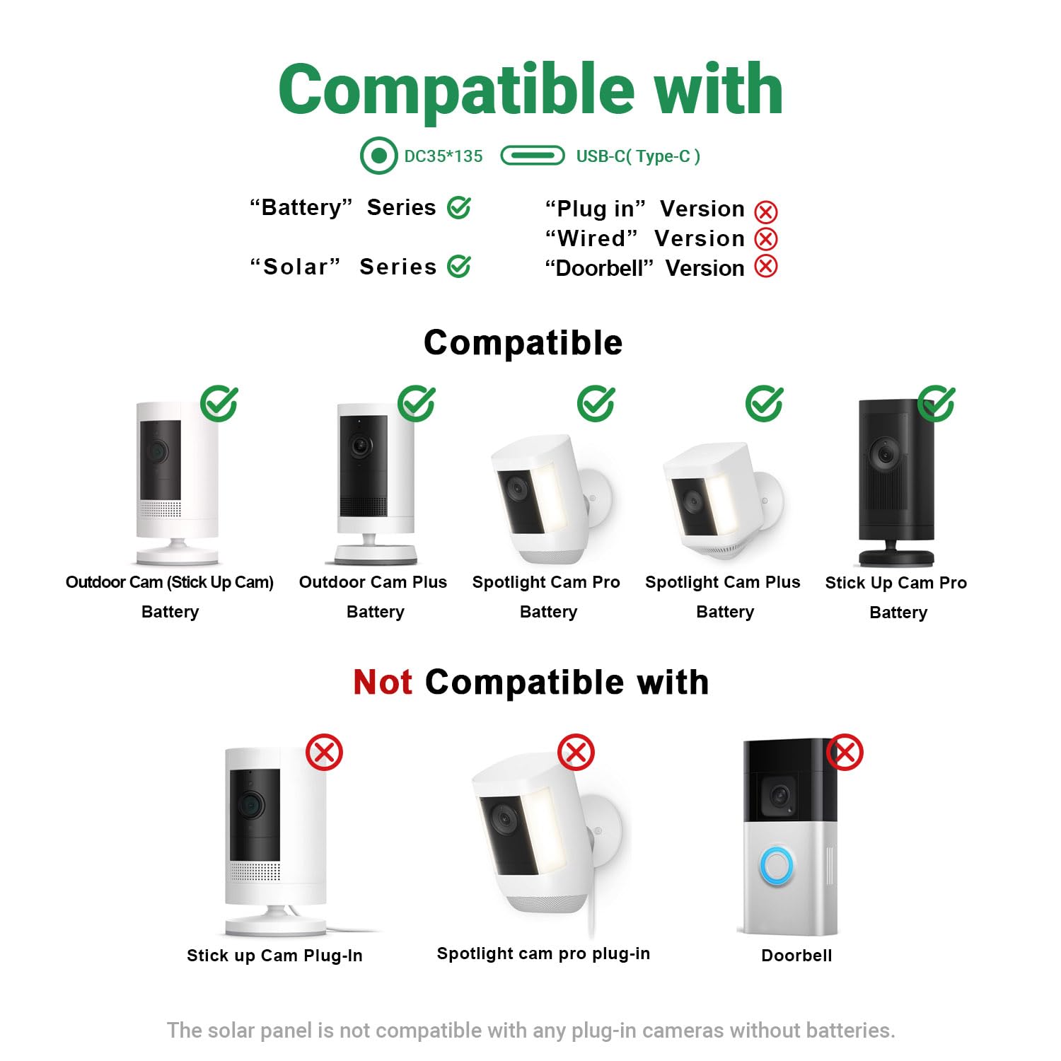 【Compatible with】The solar charger designed for ring outdoor battery cameras, compatible with ring USB-C input cameras: Ring outdoor cam plus, Ring stick up cam pro, Ring spotlight cam plus, Ring spotlight cam pro; barrel plug input cameras: Ring outdoor cam (stick up cam) battery / solar(2nd and 3rd Generation), spotlight cam battery, spotlight cam solar; not compatible with outdoor cam (stick up cam) (1st Generation)&doorbell series & plug-in / wired camera versions.
