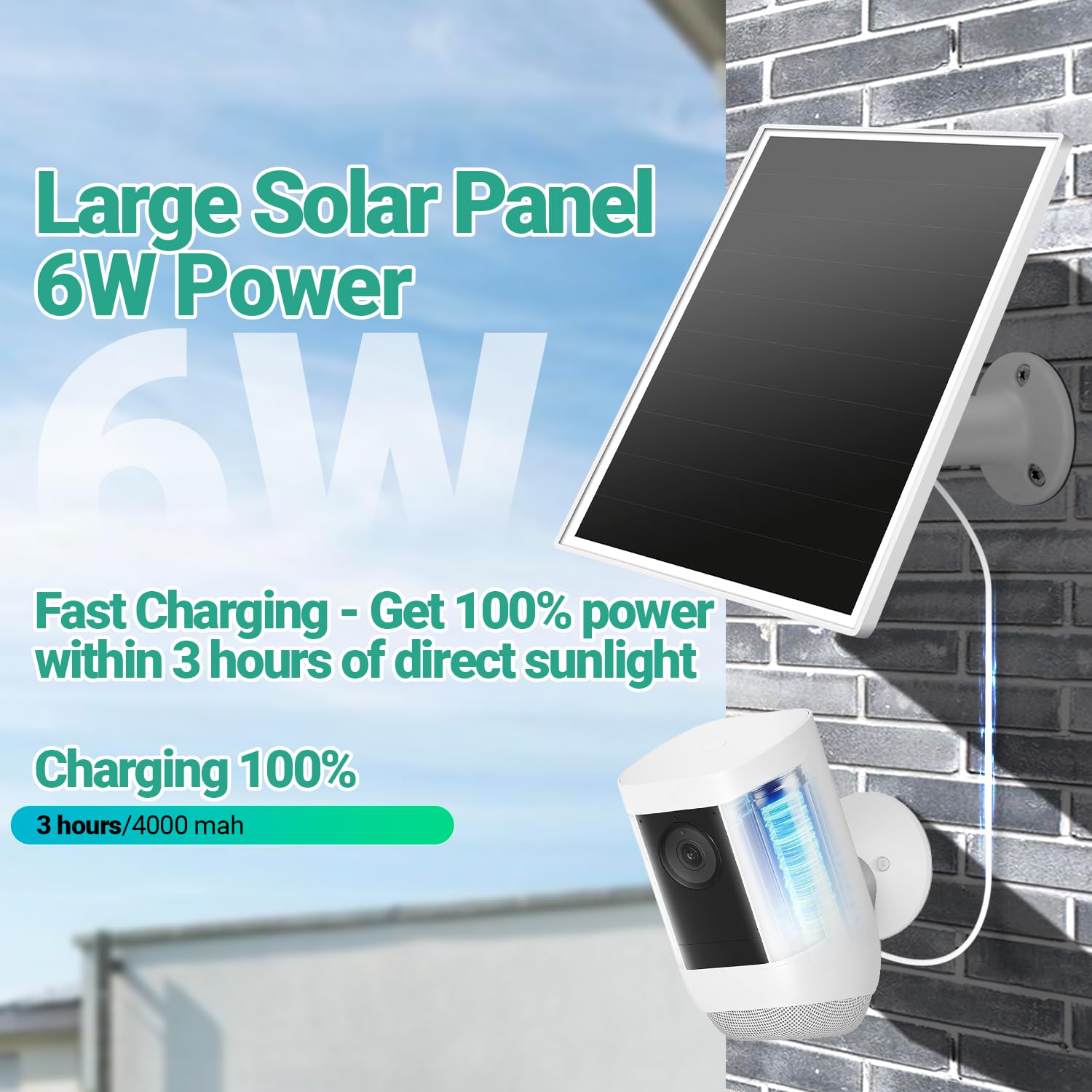 【Fast Charging】 6W solar panel with ultra-narrow frame and seamless monocrystalline cell tech delivers rapid charging for Ring cameras—packs more cells per sq.inch for max energy conversion.