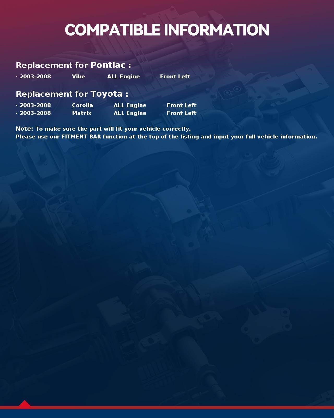 [Vehicle Fitment]: Compatible with 2003 2004 2005 2006 2007 2008 Toyota Corolla, 2003-2008 Toyota Matrix, 2003-2008 Pontiac Vibe -- Front Left Driver Side